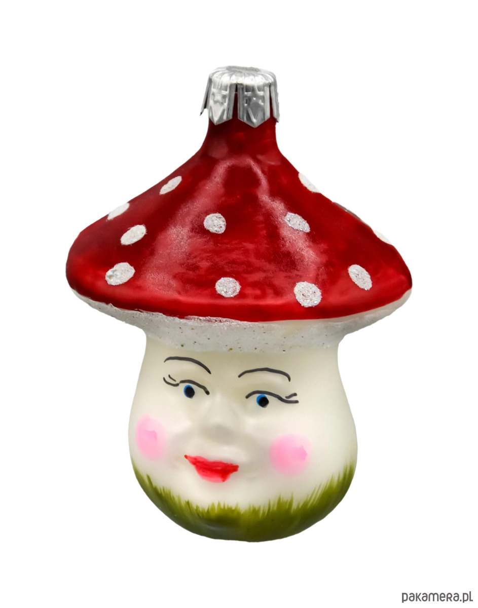 Ta ręcznie malowana szklana bombka w kształcie bajkowego muchomorka to połączenie świątecznej fantazji z klasycznym rzemiosłem. Jej czerwona czapeczka z białymi kropkami przywodzi na myśl leśne opowieści, a subtelna, uśmiechnięta twarz z rumieńcami i wyrazistymi ustami dodaje jej niepowtarzalnego, niemal magicznego charakteru.
