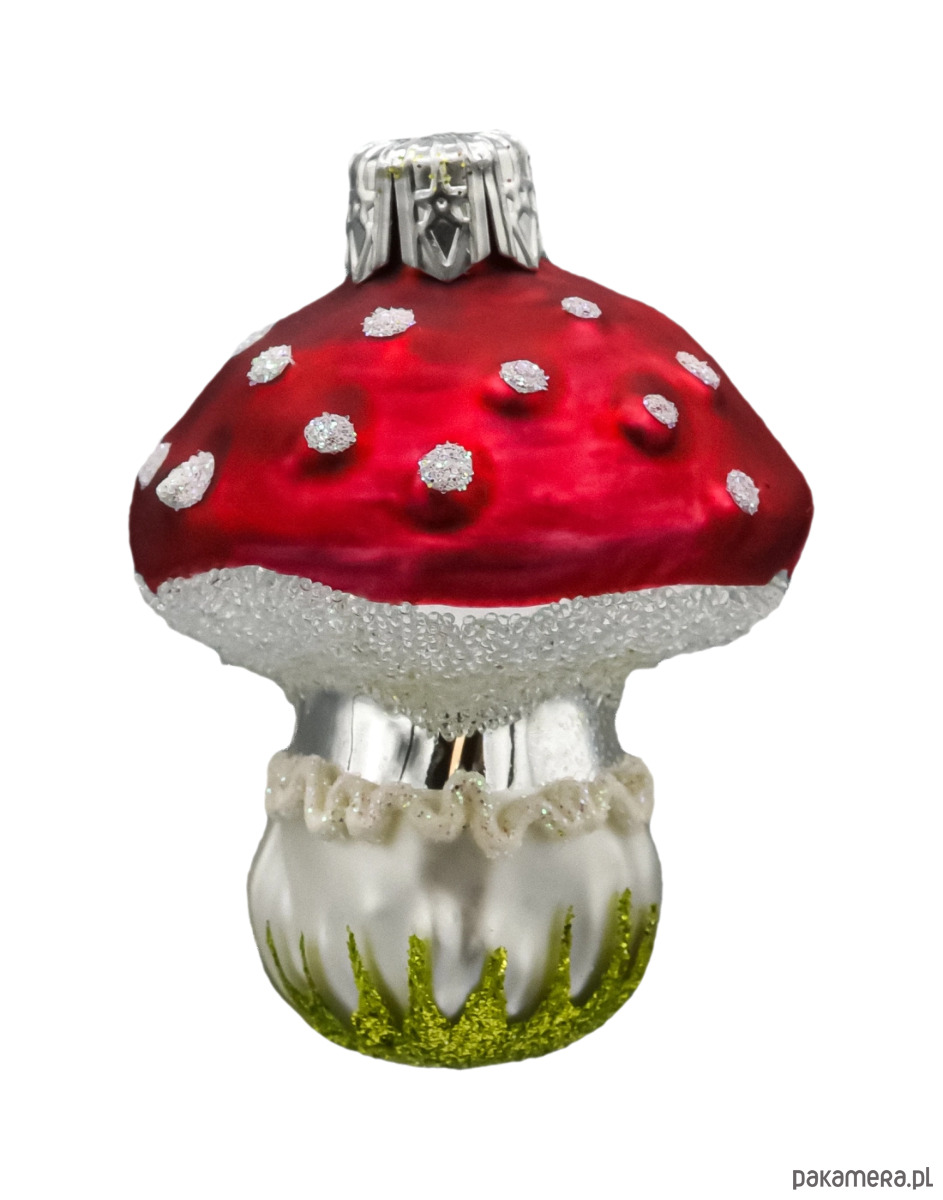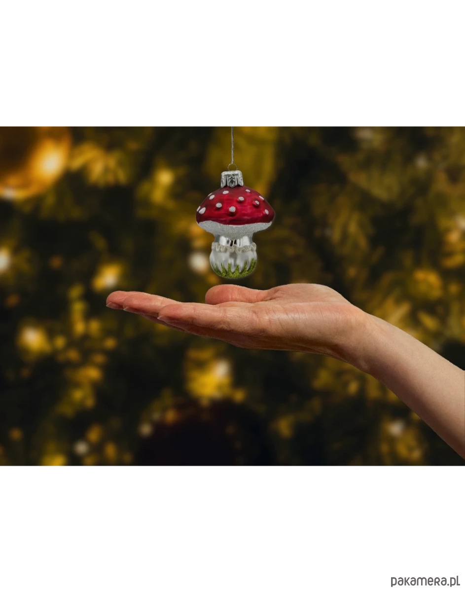 Wprowadź do swojego domu odrobinę baśniowej magii dzięki tej urokliwej bombce choinkowej w kształcie klasycznego muchomorka. Ręcznie dmuchana i dekorowana bombka została wykonana ze szkła najwyższej jakości, a jej wyrazisty czerwony kapelusz z brokatowymi kropkami natychmiast przywołuje na myśl świąteczne wspomnienia i dziecięce zachwyty. Biały trzon grzybka zdobiony jest brokatowym kołnierzem i motywem zielonej trawy – całość prezentuje się naturalnie i elegancko.