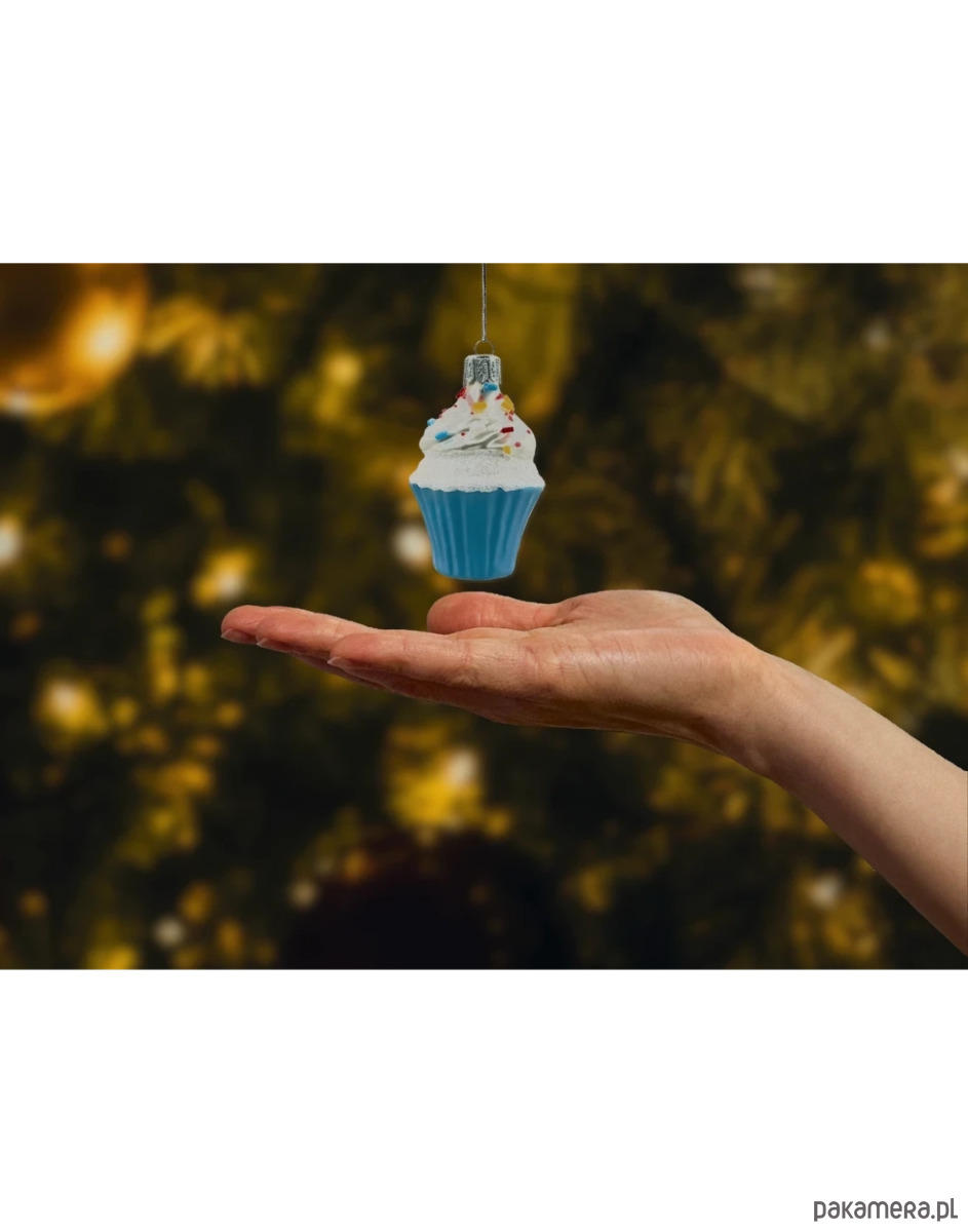 Motyw: Muffin z intensywnie niebieskim spodem, udekorowany kremem w kolorze perłowej bieli, bogato zdobiony kolorową posypką. Wzory z czerwonych, żółtych, niebieskich i białych cukrowych granulek nadają bombce wesoły i świąteczny charakter.