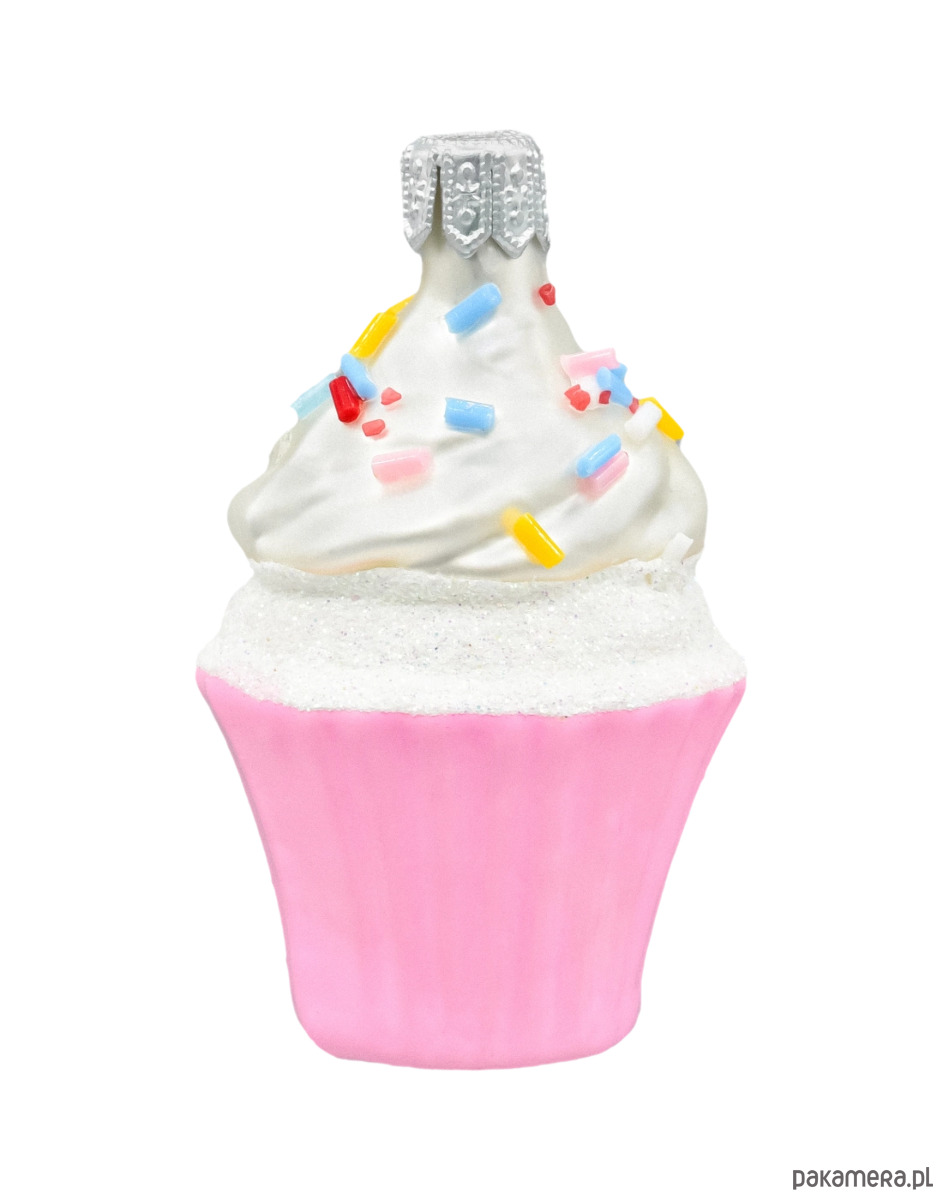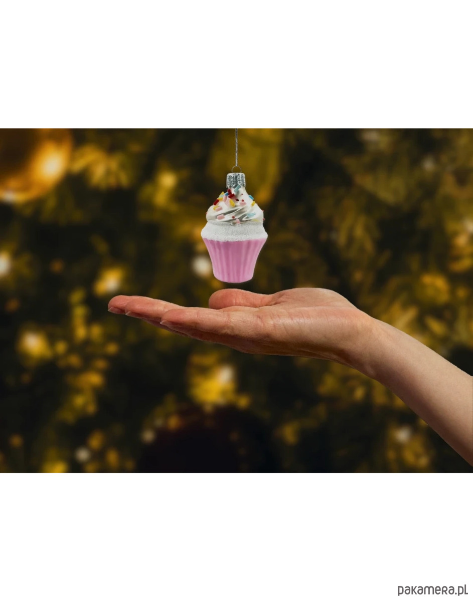 Motyw: Muffin z delikatnym, różowym spodem, ozdobiony kremem w kolorze perłowej bieli, posypany kolorowymi cukrowymi perełkami w odcieniach czerwieni, żółci, różu i niebieskiego. Brokatowe wykończenie nadaje ozdobie elegancji i sprawia, że błyszczy w świetle choinkowych lampek.