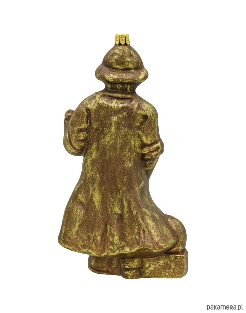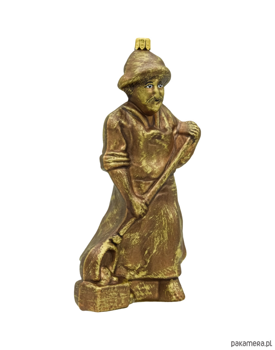 Hołd dla rzemiosła i ciężkiej pracy. Szklana bombka „Odlewnik” przedstawia robotnika z odlewni metali – w fartuchu, z charakterystycznym kapeluszem ochronnym i długim prętem/łyżką odlewniczą przy rozgrzanym tyglu. Całość utrzymana jest w złoto–brązowej patynie, która nadaje figurze wygląd starego metalu i pięknie mieni się w świetle lampek. Subtelne przetarcia i ręcznie malowane detale twarzy podkreślają kolekcjonerski charakter ozdoby.