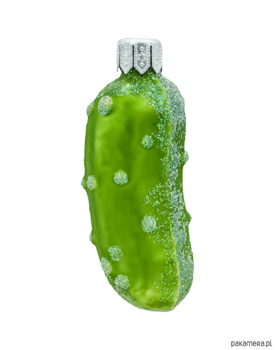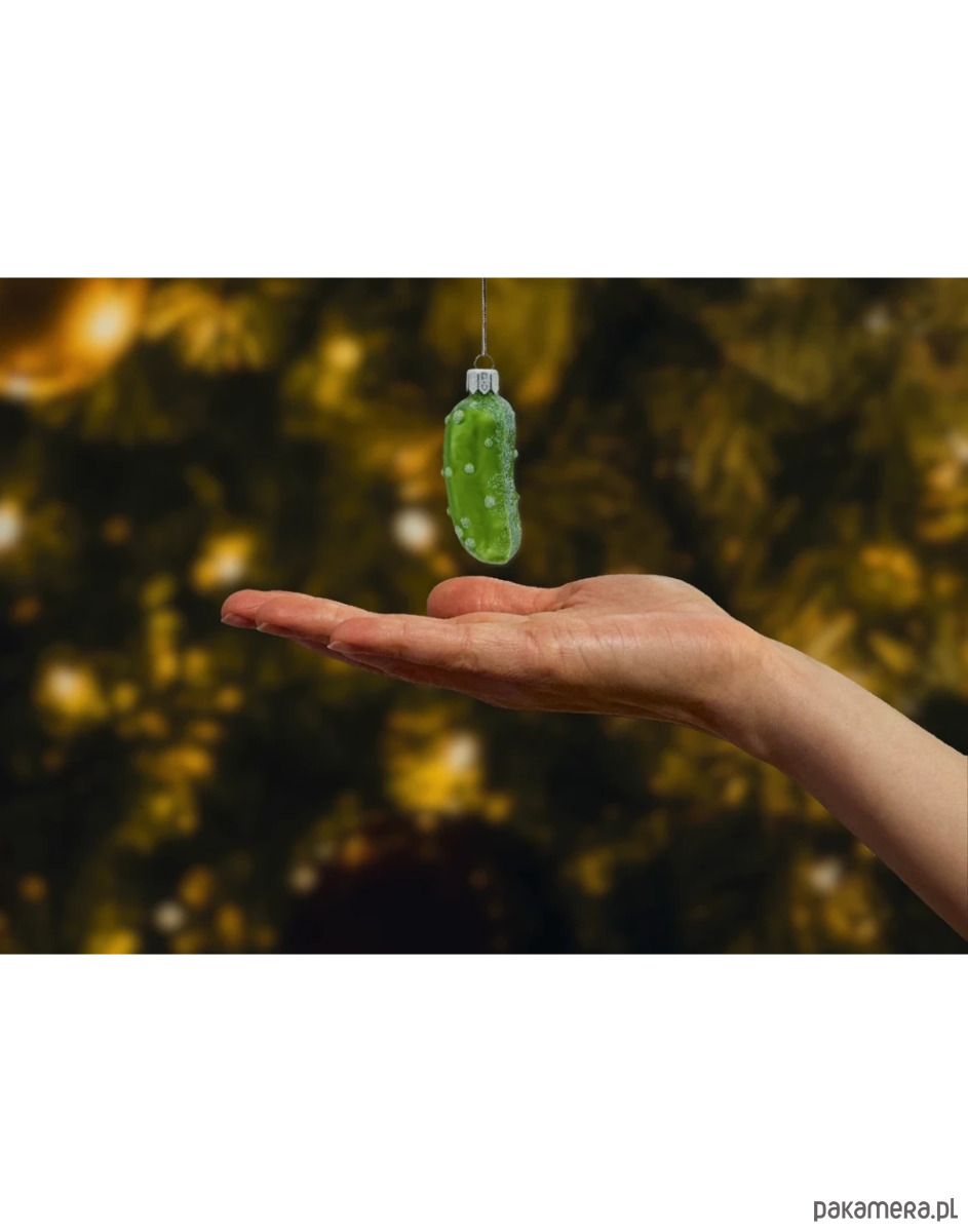 Ręcznie dekorowana bombka szklana w kształcie ogórka zachwyca soczystą zielenią i subtelnym połyskiem brokatu. Plastyczne „pypcie” oraz posrebrzane akcenty nawiązują do naturalnej faktury świeżego ogórka, a srebrna czapeczka z oczkiem ułatwia zawieszenie. To nie tylko efektowna ozdoba choinkowa, lecz także nawiązanie do znanej zabawy Christmas Pickle – kto pierwszy znajdzie ogórka na choince, temu sprzyja szczęście (lub dostaje dodatkowy upominek).