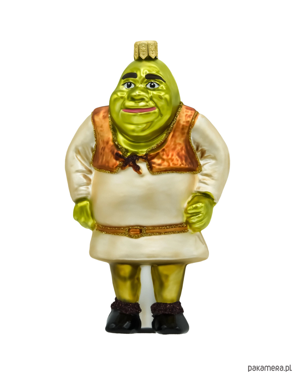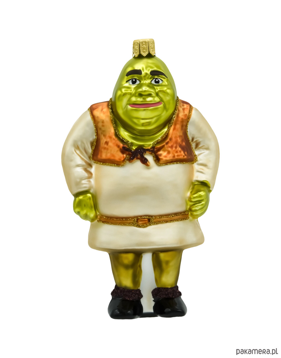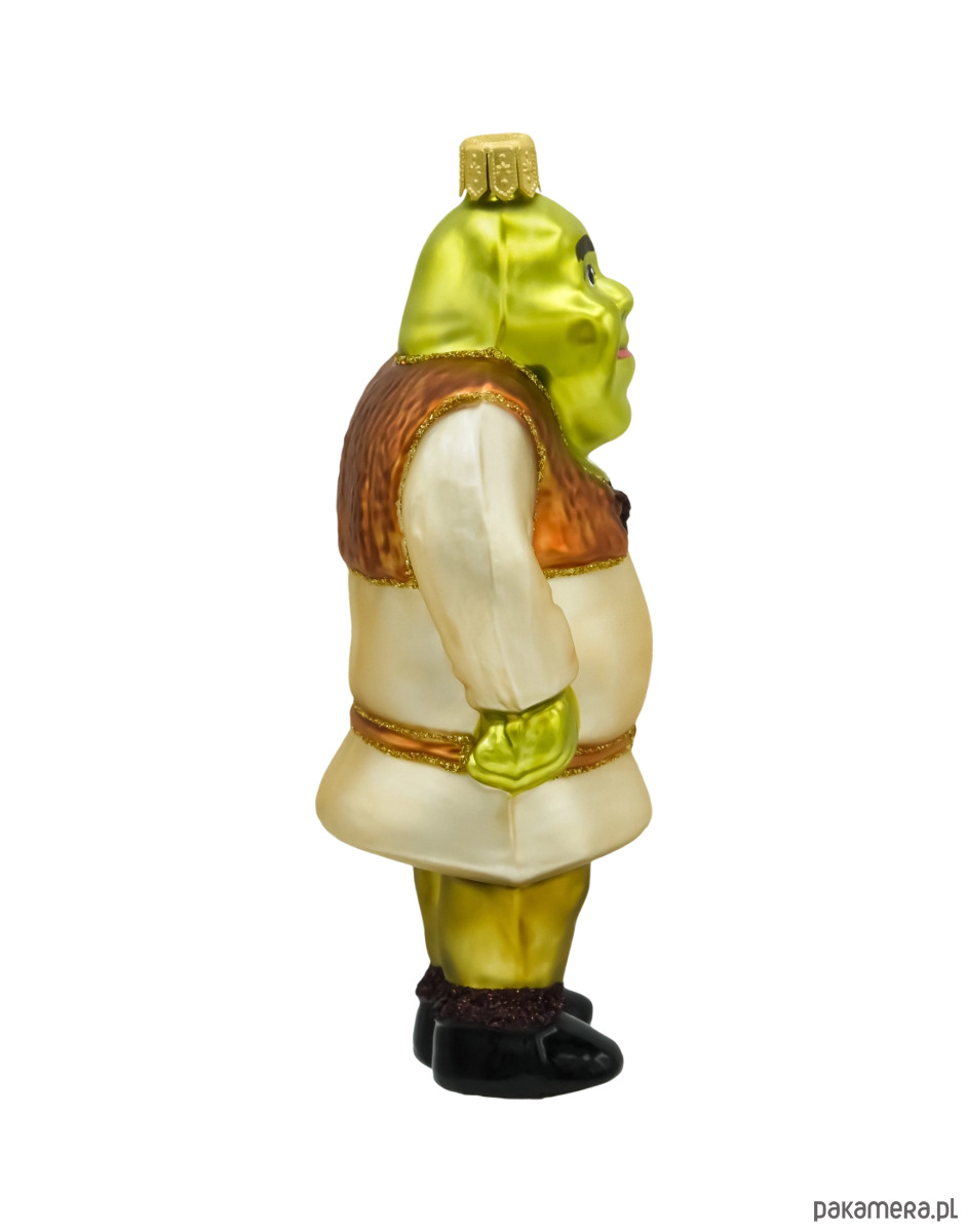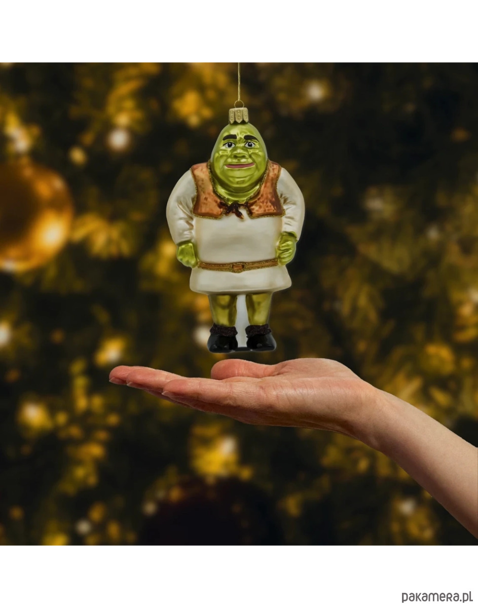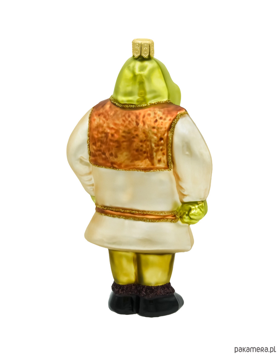 Każdy egzemplarz został ozdobiony ręcznie przy użyciu błyszczących farb i brokatu, co nadaje mu wyjątkowy, połyskujący efekt. Złote zdobienia na ubraniu dodatkowo podkreślają świąteczny charakter dekoracji. Złoty kapturek z miejscem na haczyk umożliwia łatwe zawieszenie bombki na choince. Figurka ogra będzie doskonałym prezentem dla fanów bajek, dzieci i dorosłych z poczuciem humoru – to idealna ozdoba dla tych, którzy lubią łączyć klasykę z nutą żartu.