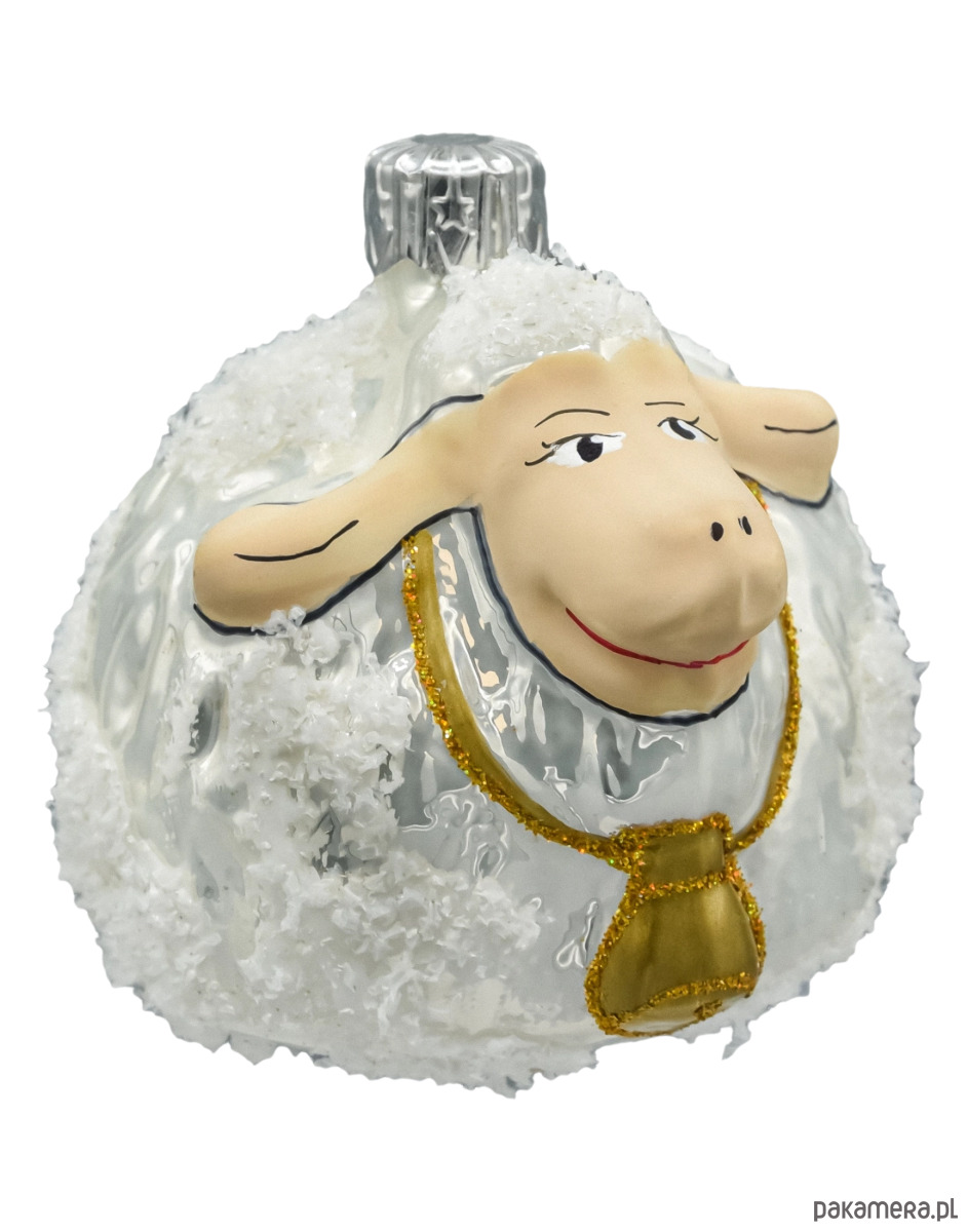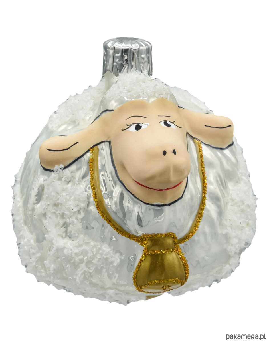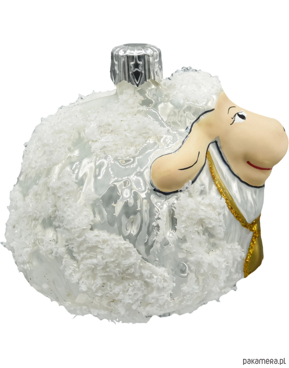 Ta urocza szklana bombka w kształcie uśmiechniętej owieczki to wyjątkowa dekoracja choinkowa, która wniesie do wnętrza świąteczne ciepło i radość. Figurka została wykonana z dmuchanego szkła i ręcznie ozdobiona połyskującym brokatem oraz imitacją śniegu, co nadaje jej bajkowego charakteru. Lśniące futerko owcy zostało pokryte białą, puszystą masą śnieżną, która pięknie odbija światło lampek choinkowych. Twarz owieczki jest pełna wdzięku i uroku, a złoty dzwoneczek na szyi dodaje całości elegancji.