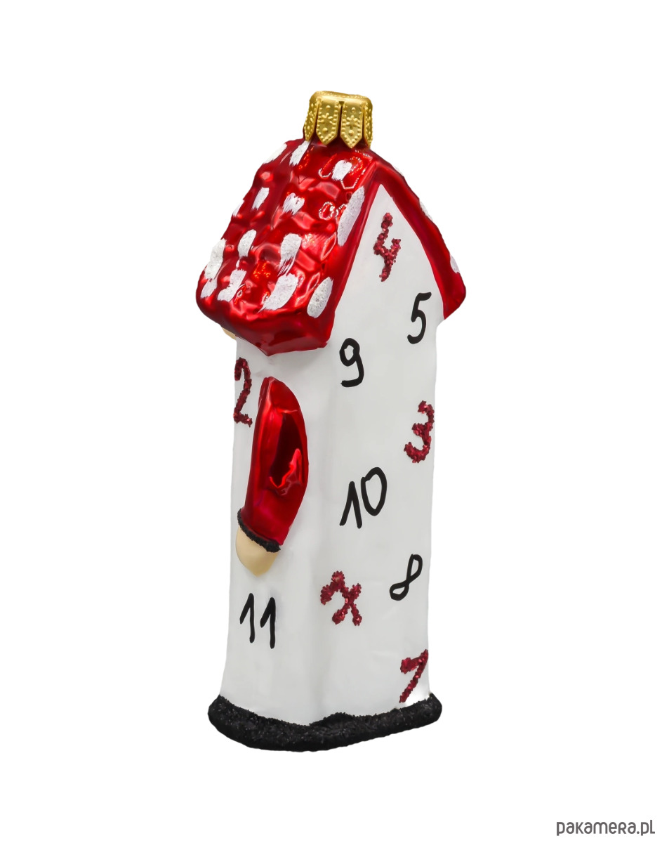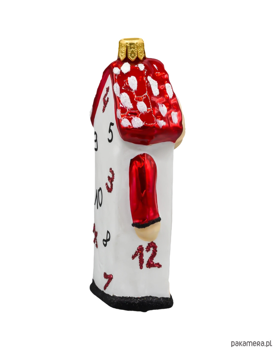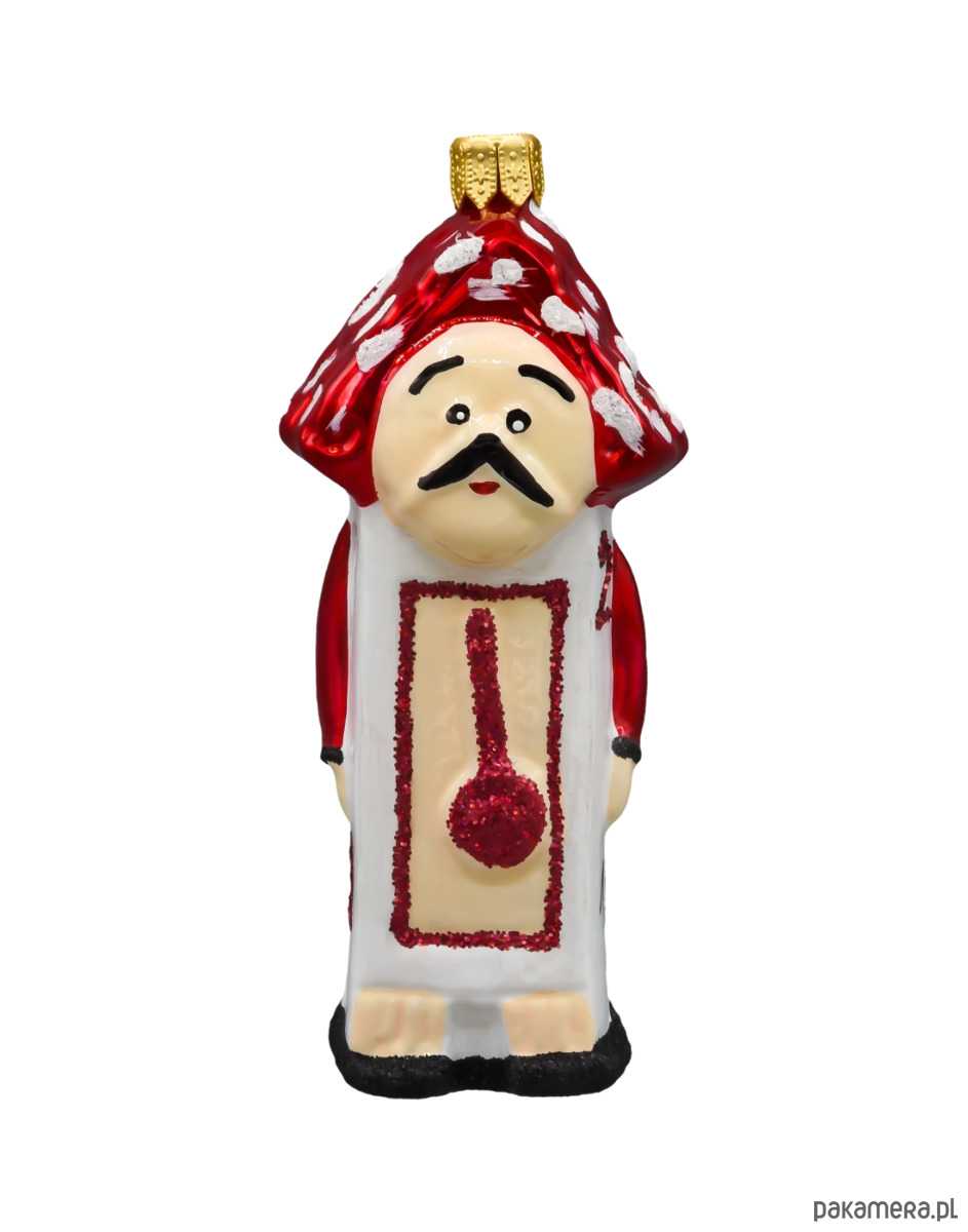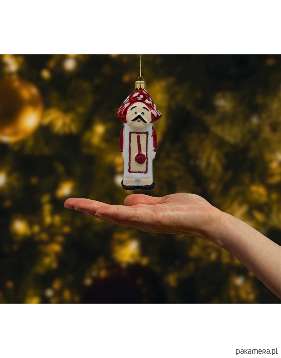 Bombka przedstawia zegar z ludzką twarzą, charakterystycznym wąsem i wyrazistymi oczami, ubrany w biały strój z czerwonymi rękawami i ozdobny czerwony kapelusz w kropki, przypominający grzyb muchomora. Na bokach bombki widoczne są cyfry zegarowe (od 1 do 12), a na froncie – błyszcząca brokatowa wskazówka i tarcza w kontrastującym kolorze czerwieni. Całość wykończona została złotą zawieszką i detalami z czerwonego brokatu, które pięknie odbijają światło lampek choinkowych.