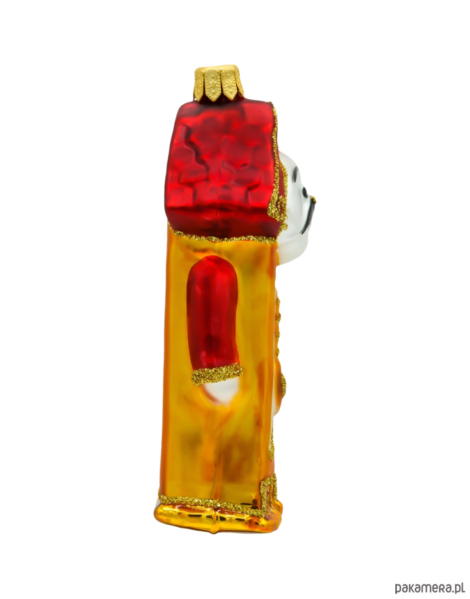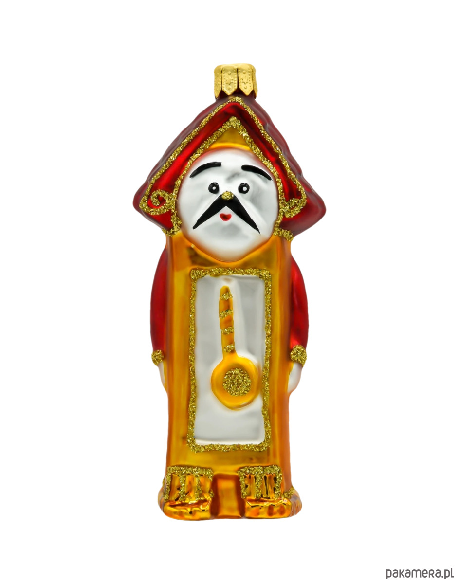 Oryginalna bombka choinkowa w kształcie starego zegara z ludzką twarzą to propozycja dla tych, którzy szukają wyjątkowych i ręcznie wykonanych ozdób świątecznych. Ta urocza szklana bombka nawiązuje stylistyką do bajkowych postaci i klasycznych zegarów z wahadłem. Uwagę przykuwa twarz z wyrazistym wąsem, oczami pełnymi zdziwienia i maleńkimi uszami wystającymi z boków. Całość utrzymana jest w ciepłej kolorystyce – odcieniach złota, czerwieni i bieli – z akcentami brokatu, który pięknie odbija światło choinkowych lampek.