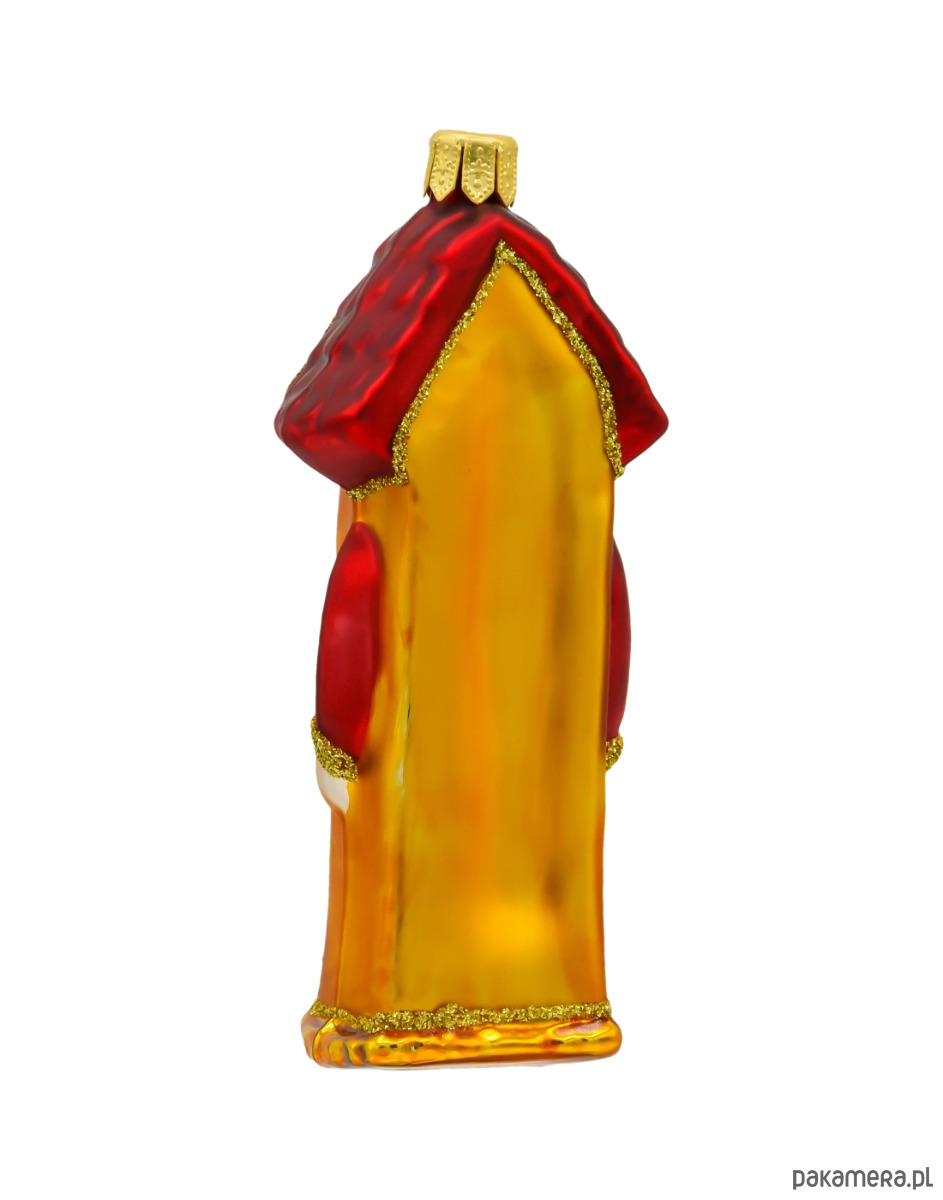 Zegarowa tarcza i wahadło zostały wyróżnione złotym brokatem, który nadaje bombce królewskiego charakteru. Delikatne detale, takie jak ozdobne wykończenia dachu i nóżek, nadają tej figurce nie tylko styl, ale i wyraźną osobowość. To bombka idealna dla miłośników klasycznych ozdób, bajkowych dekoracji oraz stylu retro. Doskonale sprawdzi się zarówno na choince, jak i jako część świątecznej kolekcji.