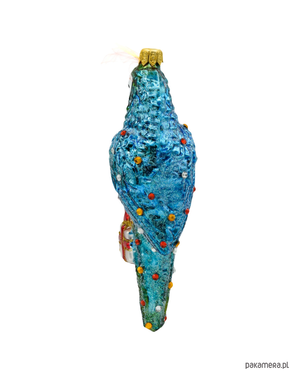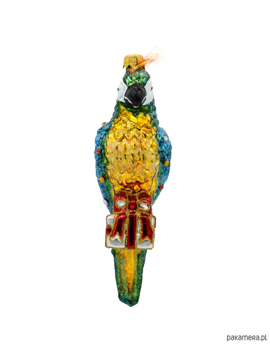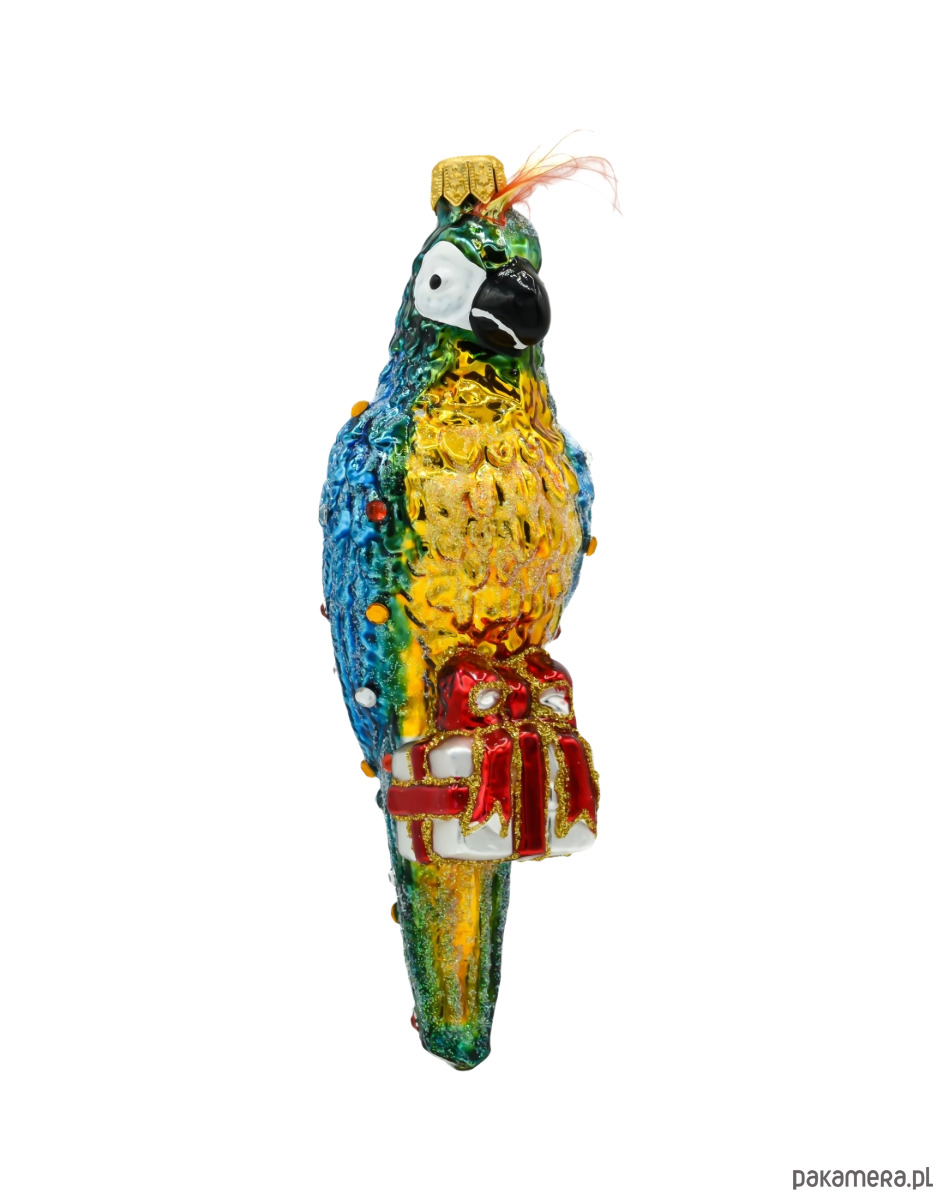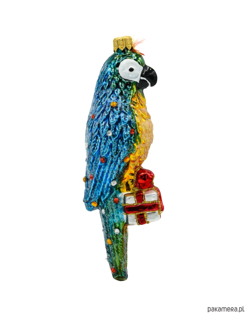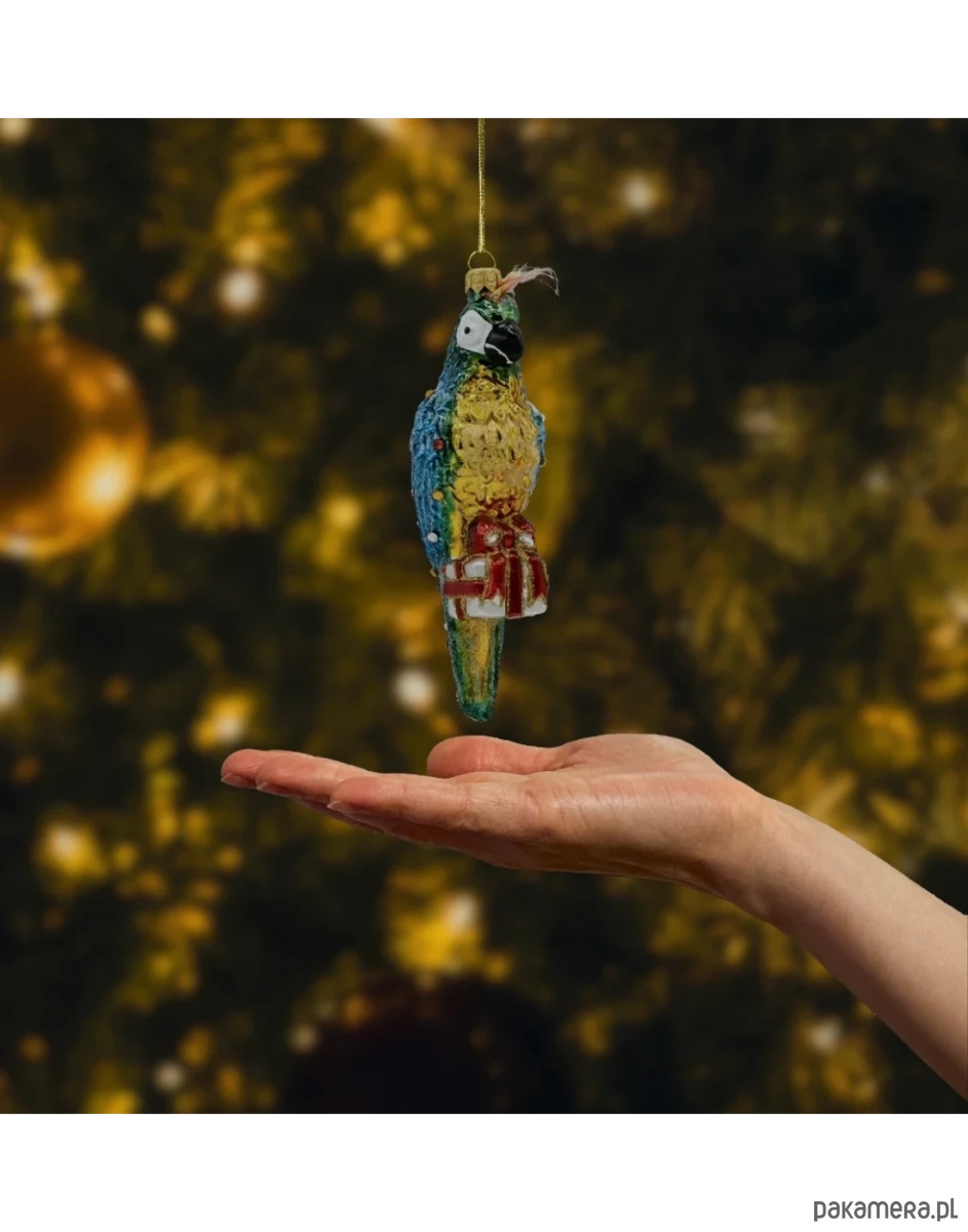 Papuga została szczegółowo wymodelowana z wyraźnym upierzeniem i charakterystycznym, zakrzywionym dziobem, a jej czubek zdobią subtelne piórka z włókna. Uroku dodaje jej zawieszony przy nodze prezent – biały pakunek z czerwonymi wstążkami i złotym brokatowym wykończeniem, idealnie wpisujący się w świąteczny klimat. To idealna bombka dla miłośników ptaków, podróży, tropikalnych akcentów lub po prostu nietuzinkowych dekoracji choinkowych.