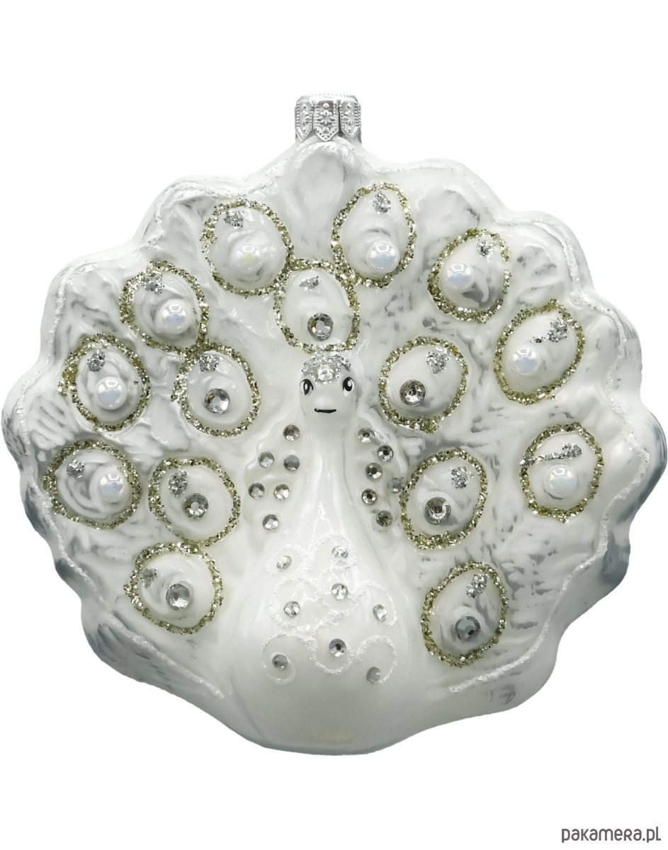 Oczaruj swoją choinkę wyjątkową ozdobą – szklaną bombką w kształcie białego pawia, która zachwyca królewskim blaskiem i subtelną elegancją. Ta ręcznie malowana bombka choinkowa przedstawia majestatycznego pawia z rozłożystym ogonem, bogato zdobionym perełkami, brokatem i drobnymi kryształkami. Każdy detal, od delikatnych zdobień na skrzydłach po wyrafinowane złote akcenty, został wykonany z niezwykłą precyzją, co czyni tę ozdobę małym dziełem sztuki.
