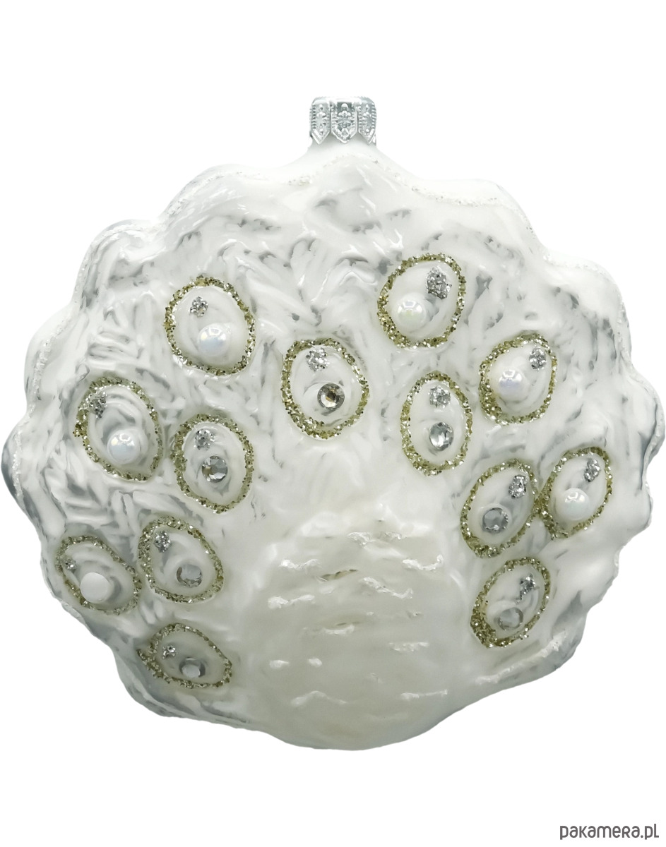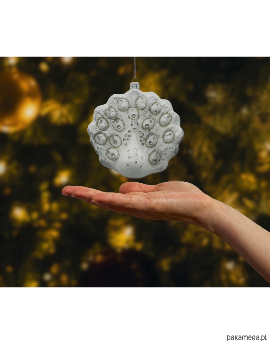 Szklany paw w kolorze perłowej bieli symbolizuje czystość, piękno i wyjątkowość. Bombka ta idealnie sprawdzi się zarówno jako ozdoba na choince, jak i prezent dla miłośników luksusowych dekoracji. Jej ponadczasowy styl i wyszukany design doskonale komponują się z klasycznymi i eleganckimi aranżacjami świątecznymi.