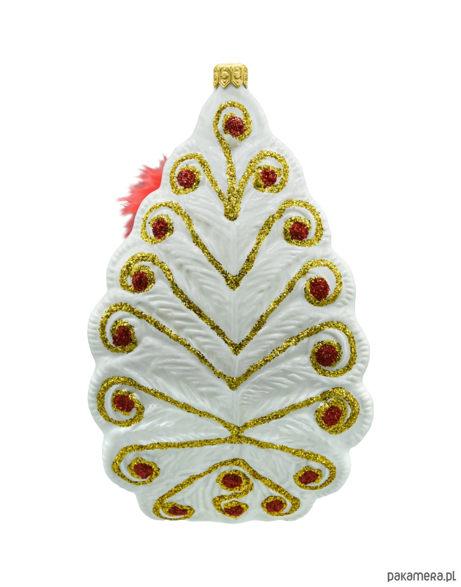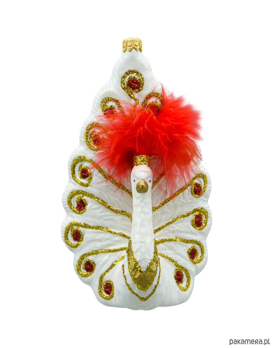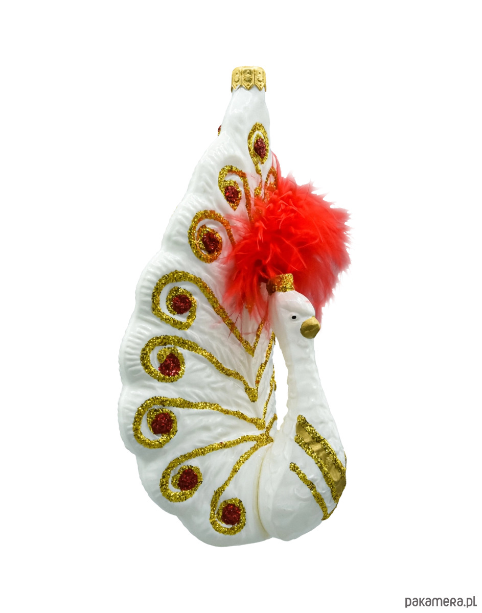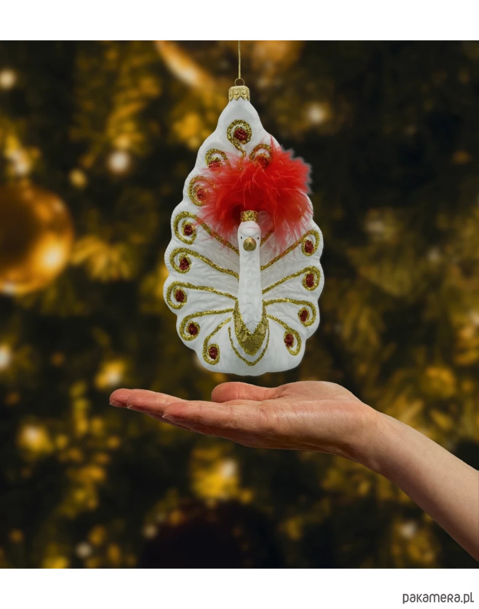 Biżuteryjna elegancja na świątecznym drzewku. Szklana bombka „Paw biały glamour” zachwyca wachlarzem ogona w perłowej bieli, poprowadzonymi ręcznie złotymi ornamentami i „oczkami” w czerwonym brokacie. Nad głową ptaka osadzono miękkie pióro w intensywnej czerwieni, które dodaje całości teatralnego, świątecznego blasku. Smukła szyja, subtelne cieniowania i wypukłe reliefy pięknie łapią światło lampek – to ozdoba, która natychmiast staje się centrum kompozycji.