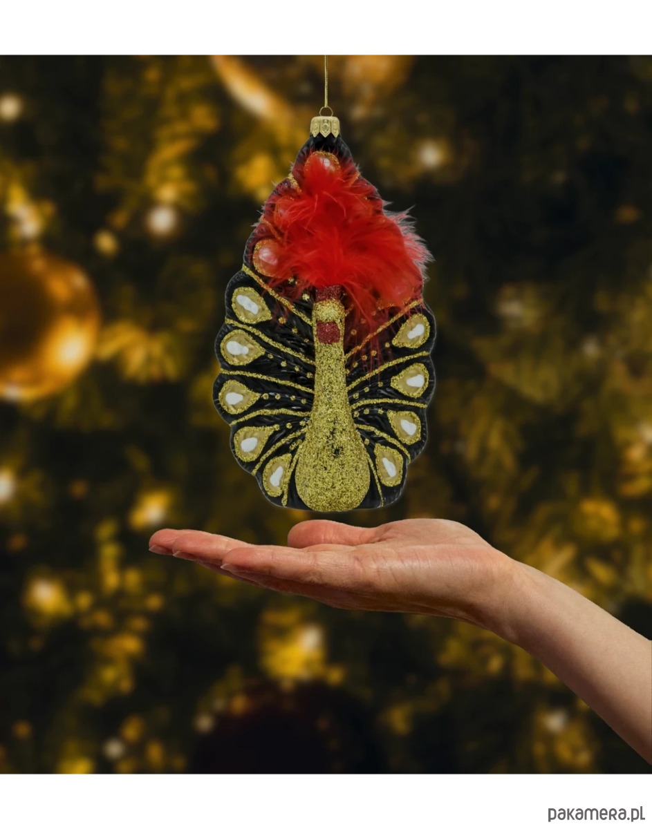 Efekt „wow” gwarantowany! Ta szklana bombka choinkowa przedstawia pawia z rozłożonym, wachlarzowym ogonem w eleganckiej czarno-złotej kolorystyce. Każde „oczko” ogona zostało podkreślone drobnym brokatem i metalicznym złotem, a środek zdobi miękkie, czerwone piórko, które dodaje kompozycji teatralnego blasku. Smukła szyja i korpus ptaka pokryte są gęstym, iskrzącym zdobieniem – ornament pięknie odbija światło lampek, tworząc luksusowy akcent w stylu glamour. To ręcznie malowana bombka dla osób, które lubią dekoracje wyraziste, kolekcjonerskie i dopracowane w najmniejszym detalu.