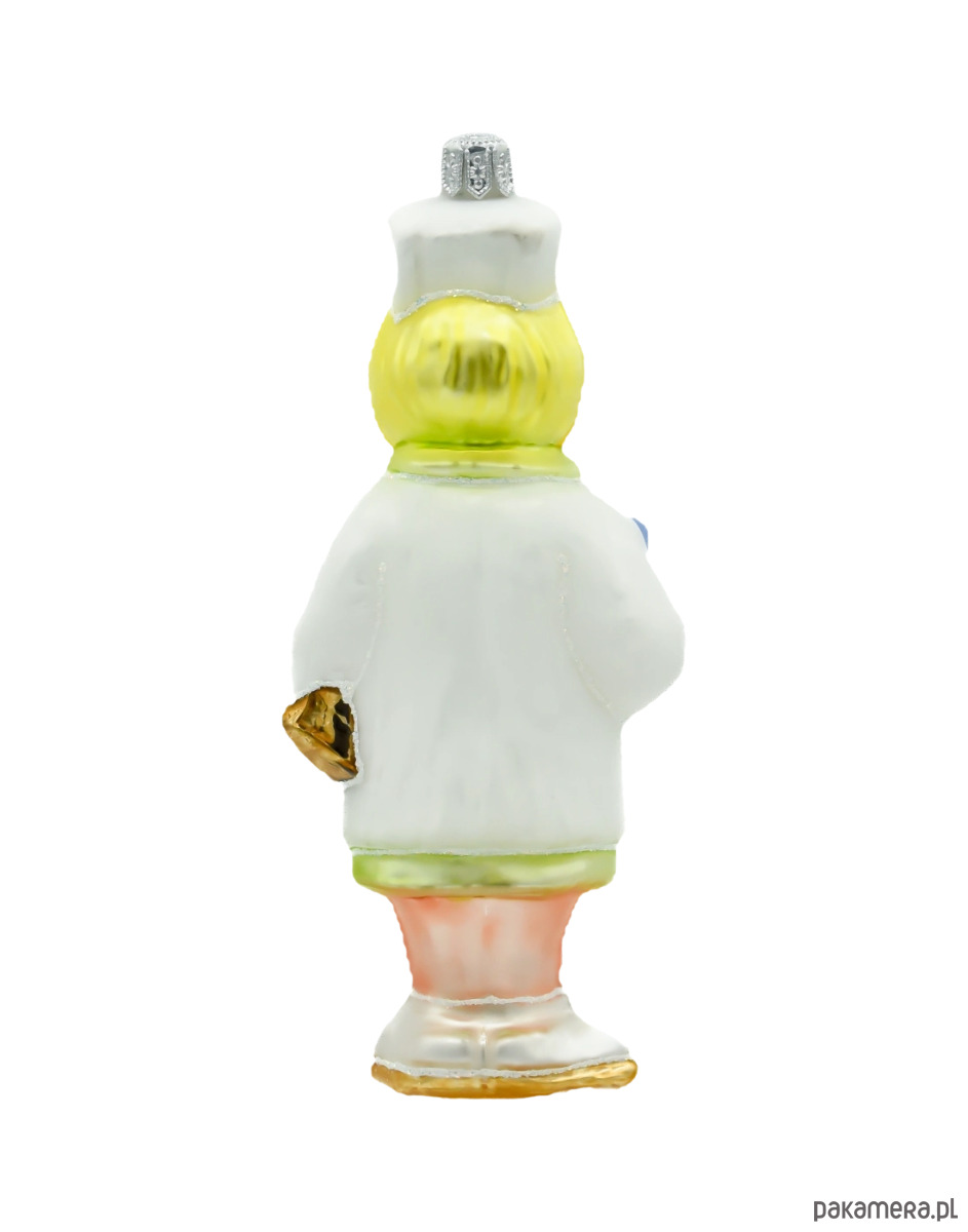 Kolorystyka: Kontrastujące barwy – biały fartuch, zielona sukienka, blond włosy i subtelne detale w czerwieni oraz złocie – przyciągają wzrok i nadają bombce wyrazistego charakteru.