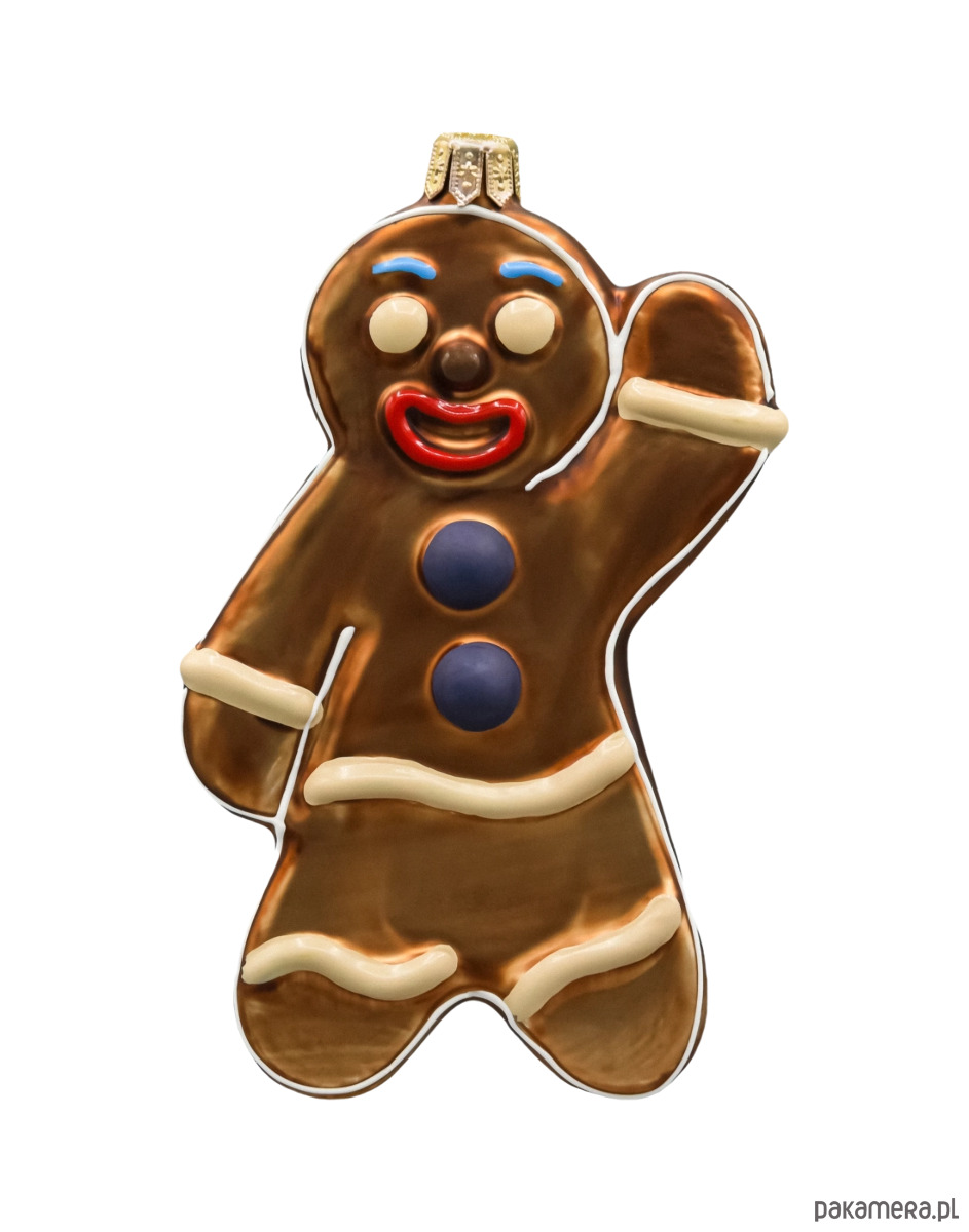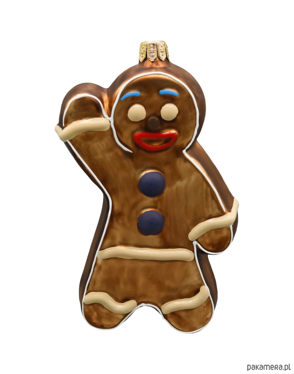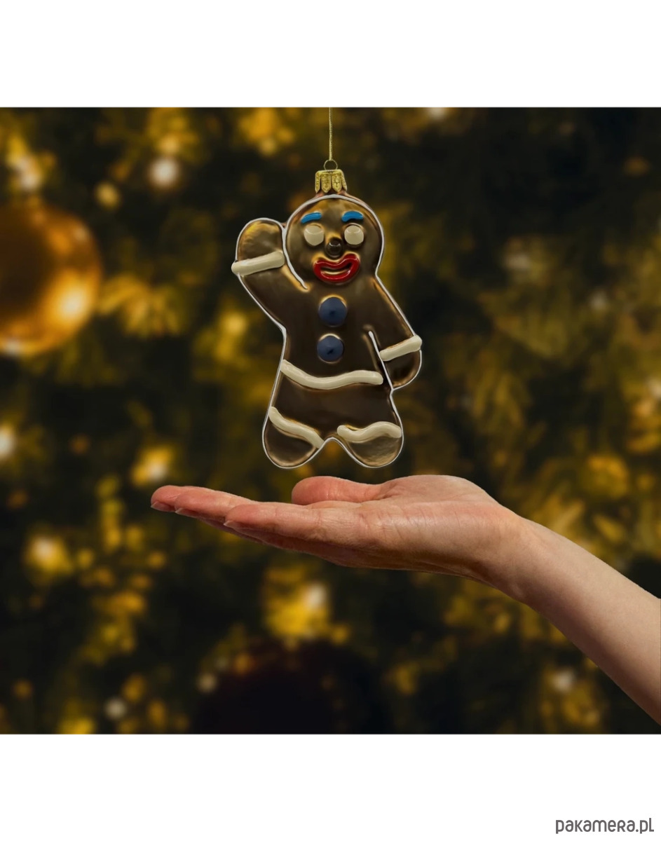 Kolorystyka: Ciemnobrązowy odcień przypominający prawdziwe ciasteczka piernikowe, kontrastujący z żywymi kolorami – czerwonym uśmiechem, niebieskimi guziczkami oraz kremowymi wykończeniami imitującymi lukier. Te barwy sprawiają, że bombka przyciąga wzrok i doskonale wpisuje się w świąteczny klimat.