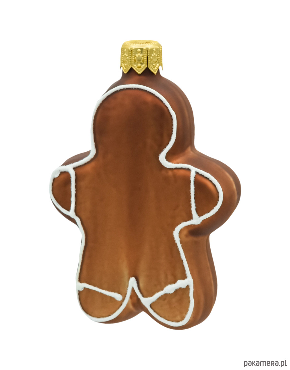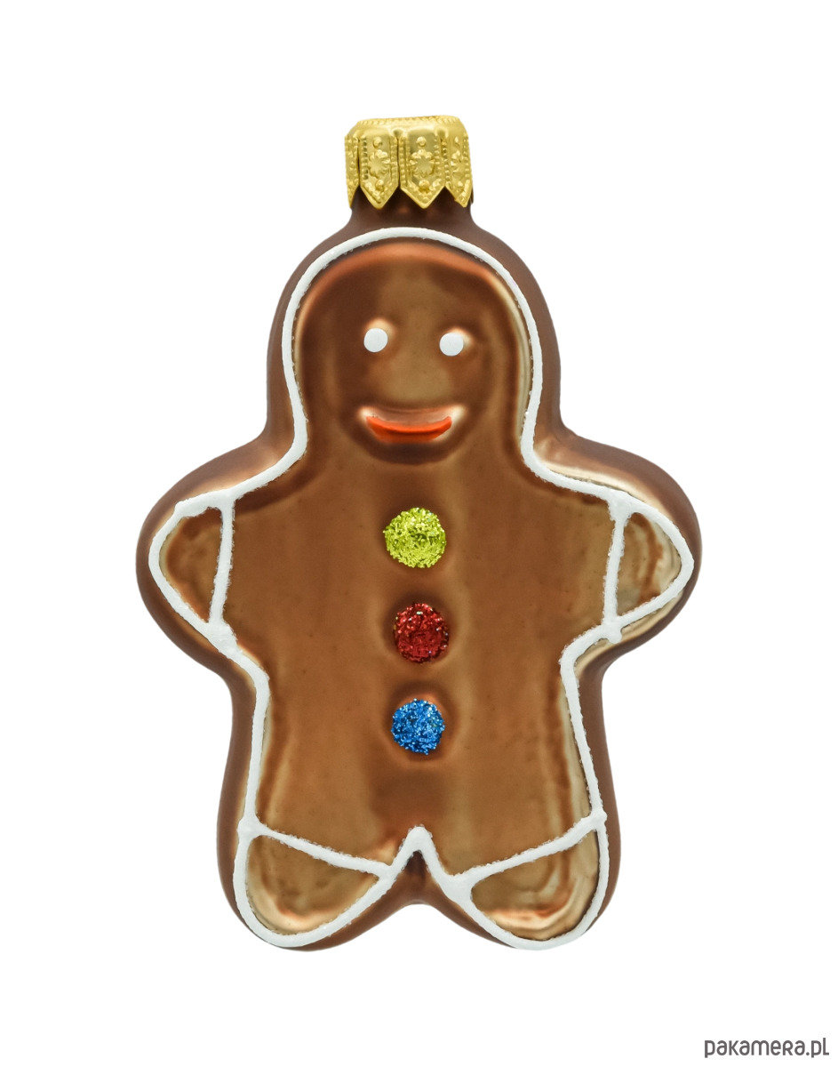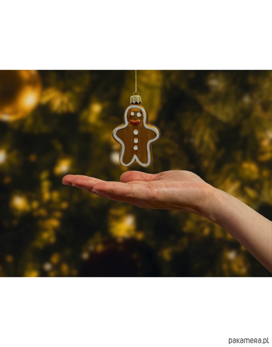 Ozdoba w kształcie piernikowego ludzika, wykonana z wysokiej jakości szkła, pokryta błyszczącym lakierem, który nadaje jej eleganckiego połysku.