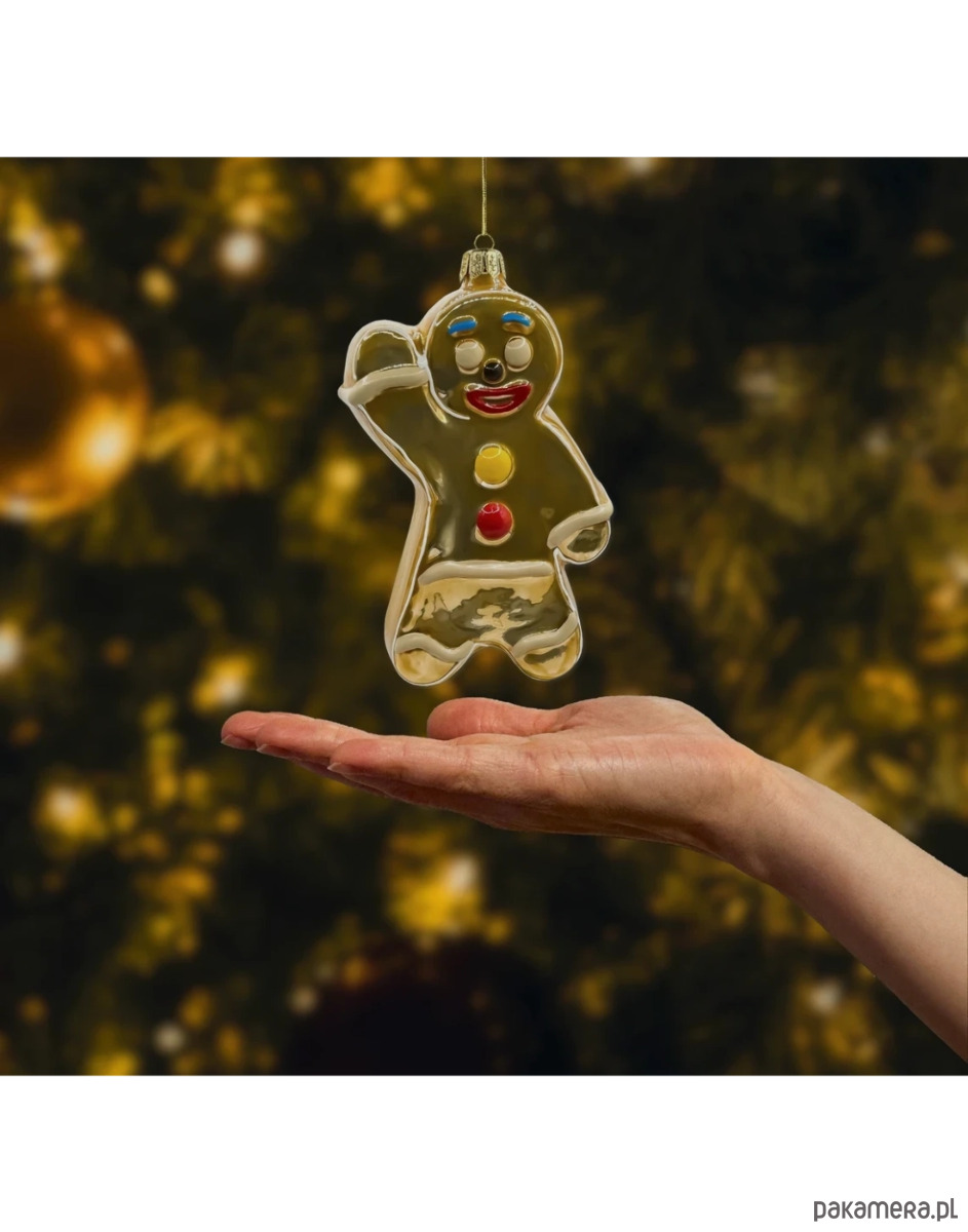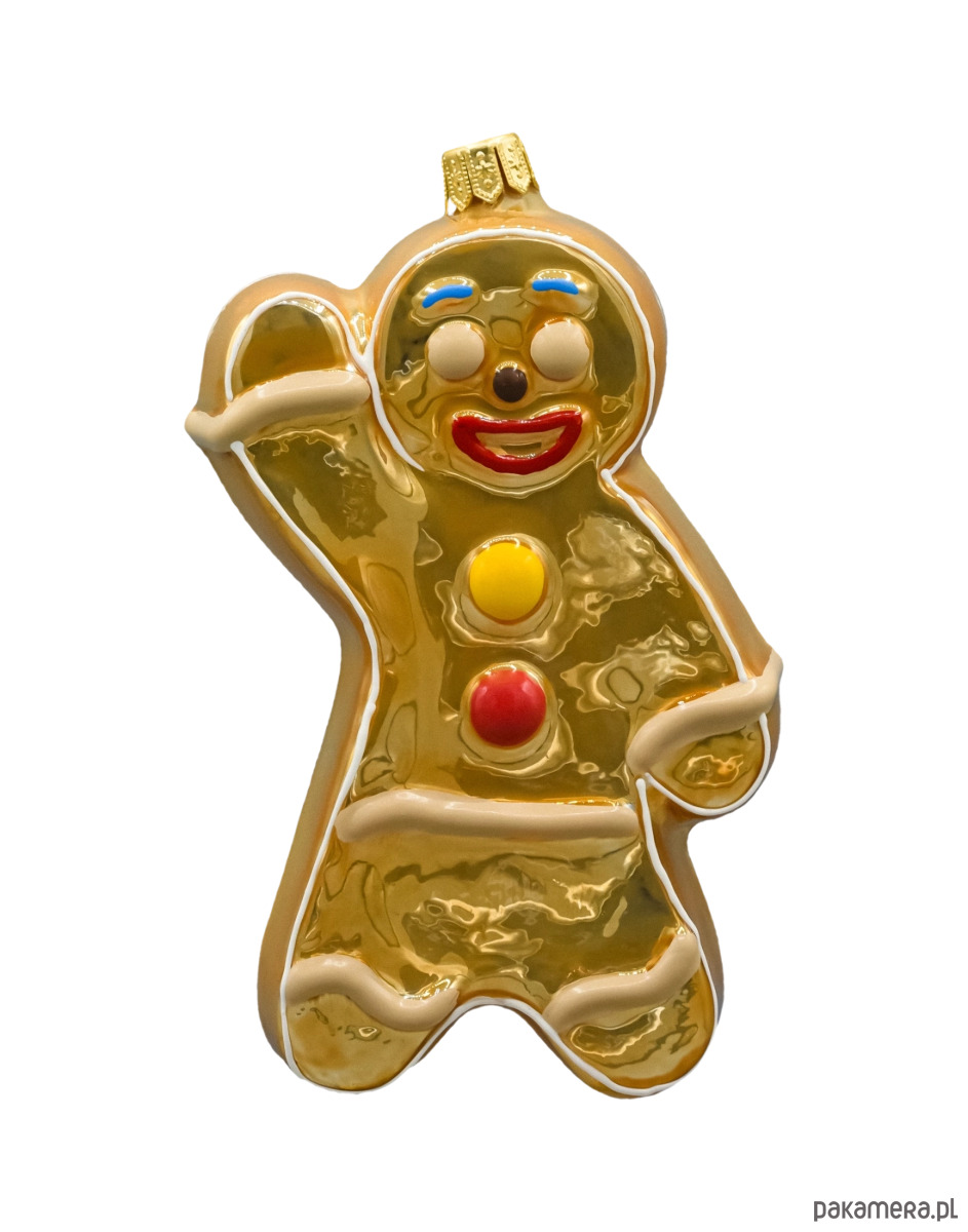 Kolorystyka: Ciepłe, złociste odcienie piernika, kontrastujące z białymi akcentami lukru oraz intensywnymi kolorami guziczków – żółtym i czerwonym. Wyraziste barwy sprawiają, że bombka pięknie komponuje się z innymi ozdobami na choince, tworząc radosny i przytulny nastrój.