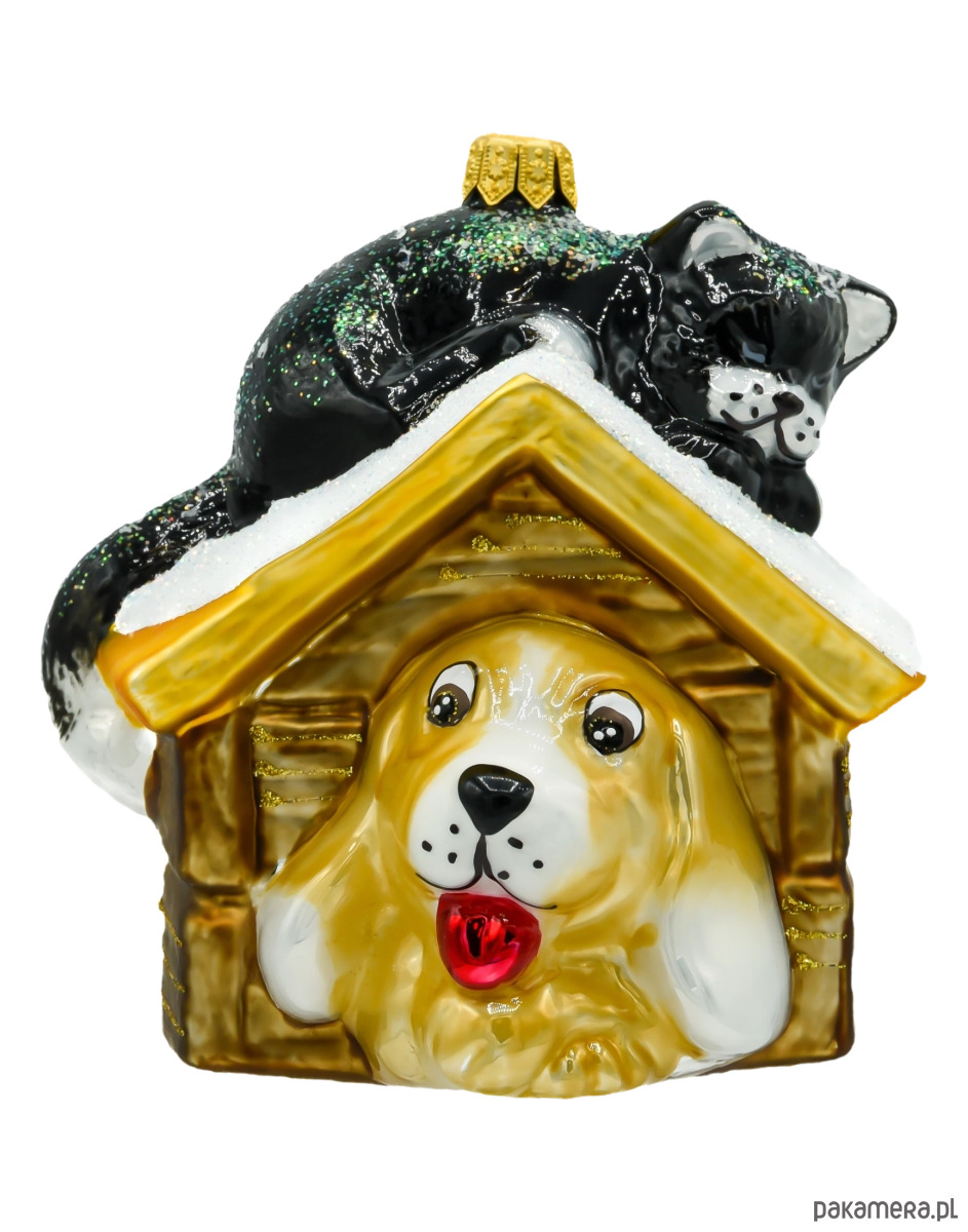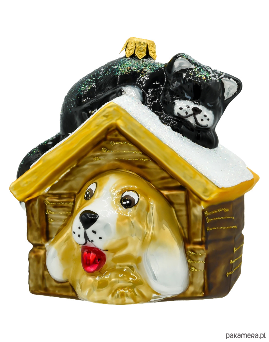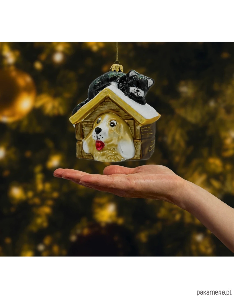 Bombka choinkowa Pies w budzie z kotem – ręcznie malowana, szklana ozdoba świąteczna z humorem