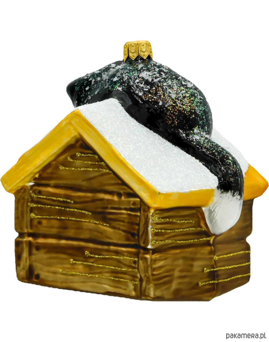 Złoto-brązowa buda pokryta została białym brokatem imitującym śnieg, a błyszczące wykończenia nadają bombce świąteczny blask. To doskonały prezent dla dzieci, właścicieli psów i kotów oraz każdego, kto chce nadać swojej choince odrobinę radości i bajkowego klimatu.