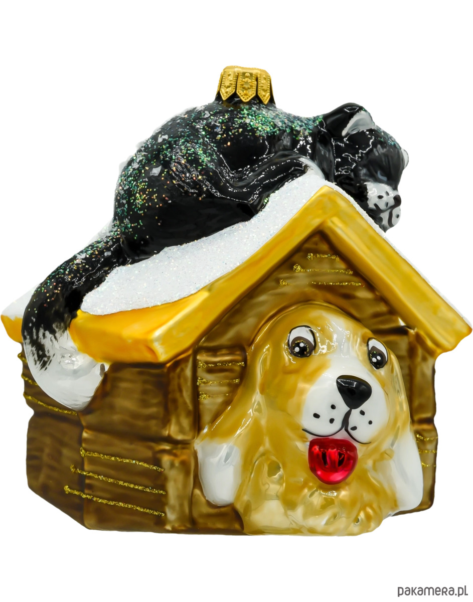 Urocza bombka choinkowa przedstawia sympatycznego pieska wyglądającego z budy oraz czarnego kotka śpiącego na jej dachu – duet, który rozczula i wywołuje uśmiech! To ręcznie malowana ozdoba wykonana ze szkła dmuchanego, idealna dla miłośników zwierząt i tych, którzy cenią sobie świąteczne dekoracje z charakterem. Pies ma zabawny wyraz pyska i wystawiony język, a kotek wtulony w śniegowy dach dodaje kompozycji ciepła i spokoju.