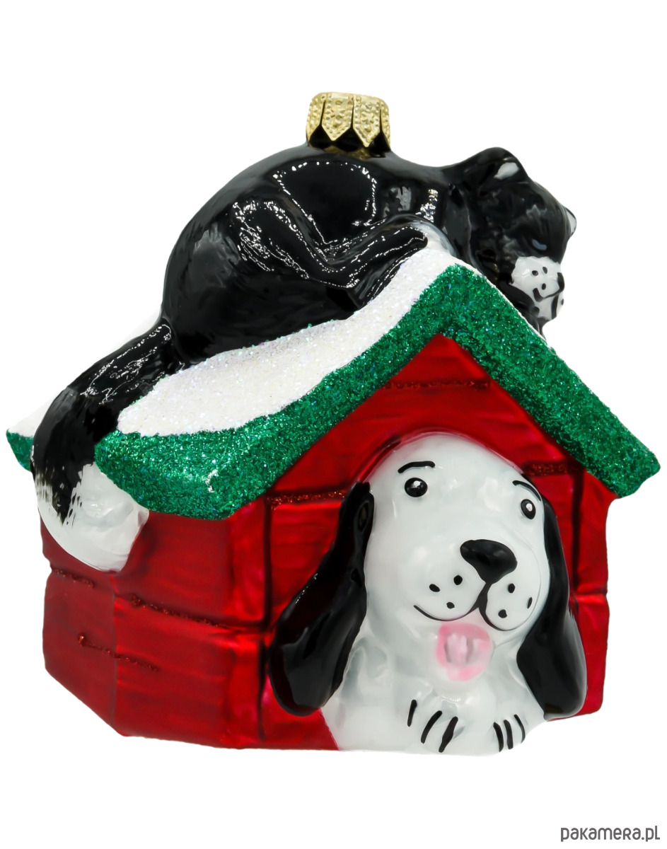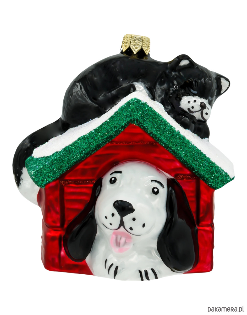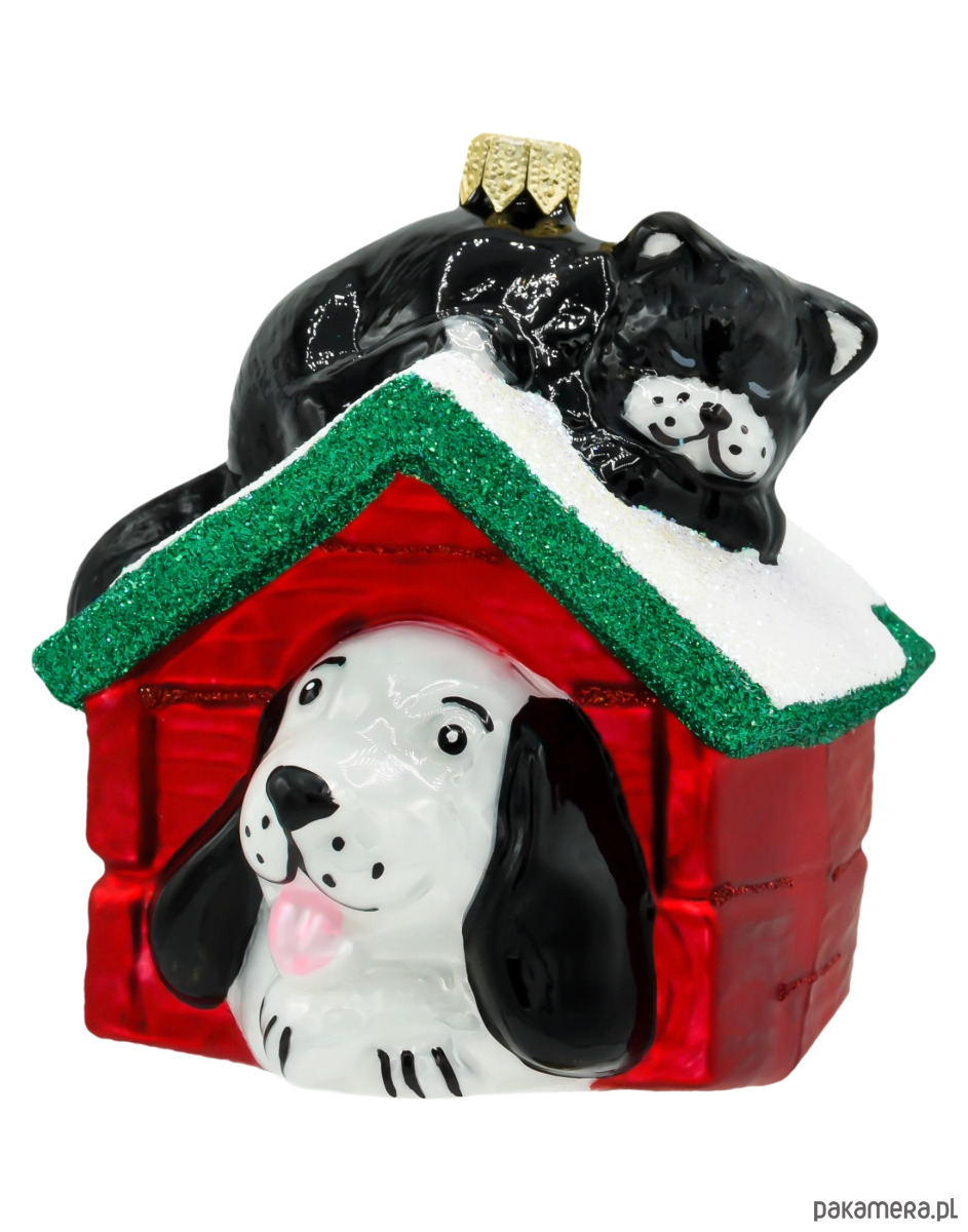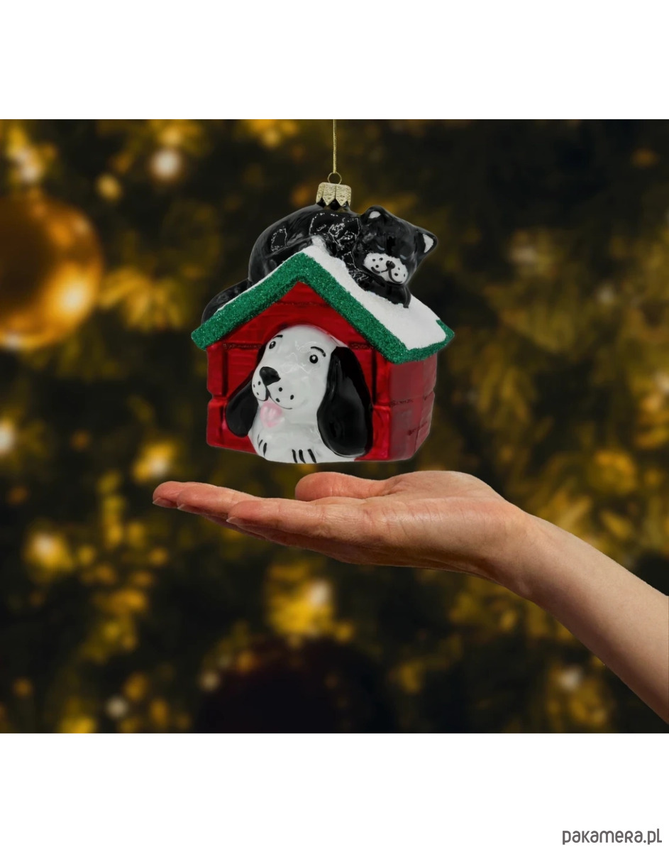 Szklana bombka choinkowa „Pies i kot w budzie” to urocza i pełna humoru dekoracja świąteczna, która zachwyci wszystkich miłośników zwierząt. Przedstawia czarnego kota wylegującego się na ośnieżonym dachu czerwonej budy oraz białego psa z czarnymi uszami wyglądającego radośnie z jej wnętrza. Ten wyjątkowy projekt łączy w sobie ciepło, przyjaźń i świąteczną atmosferę — idealnie oddając rodzinny charakter Bożego Narodzenia.