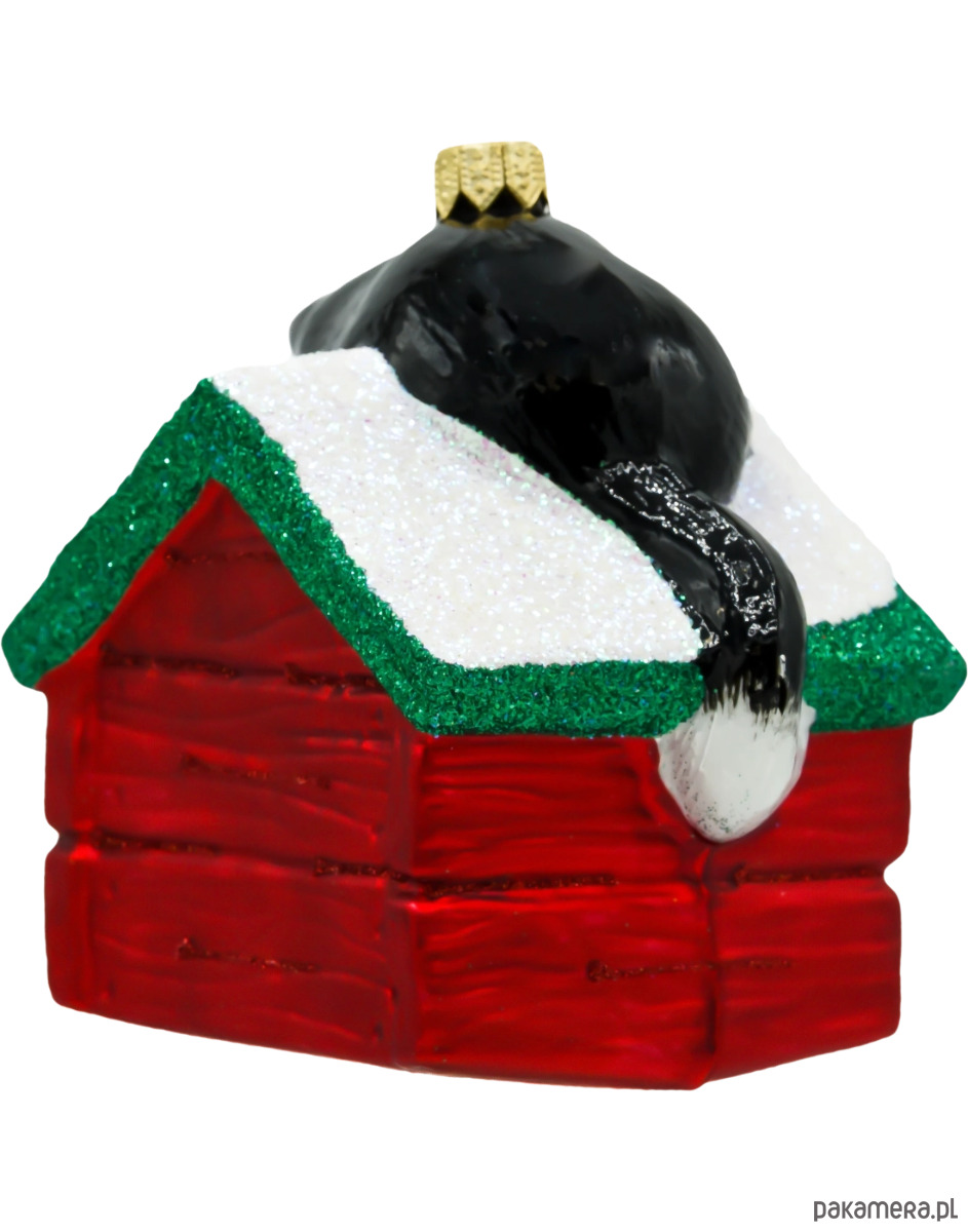 Bombka została ręcznie wykonana ze szkła i starannie pomalowana z dbałością o najdrobniejsze detale. Dach budy pokryty jest błyszczącym brokatem w kolorze zieleni i bieli, co pięknie odbija światło choinkowych lampek. To doskonały prezent dla dzieci, właścicieli zwierzaków lub każdego, kto ceni zabawne i nietuzinkowe ozdoby choinkowe.