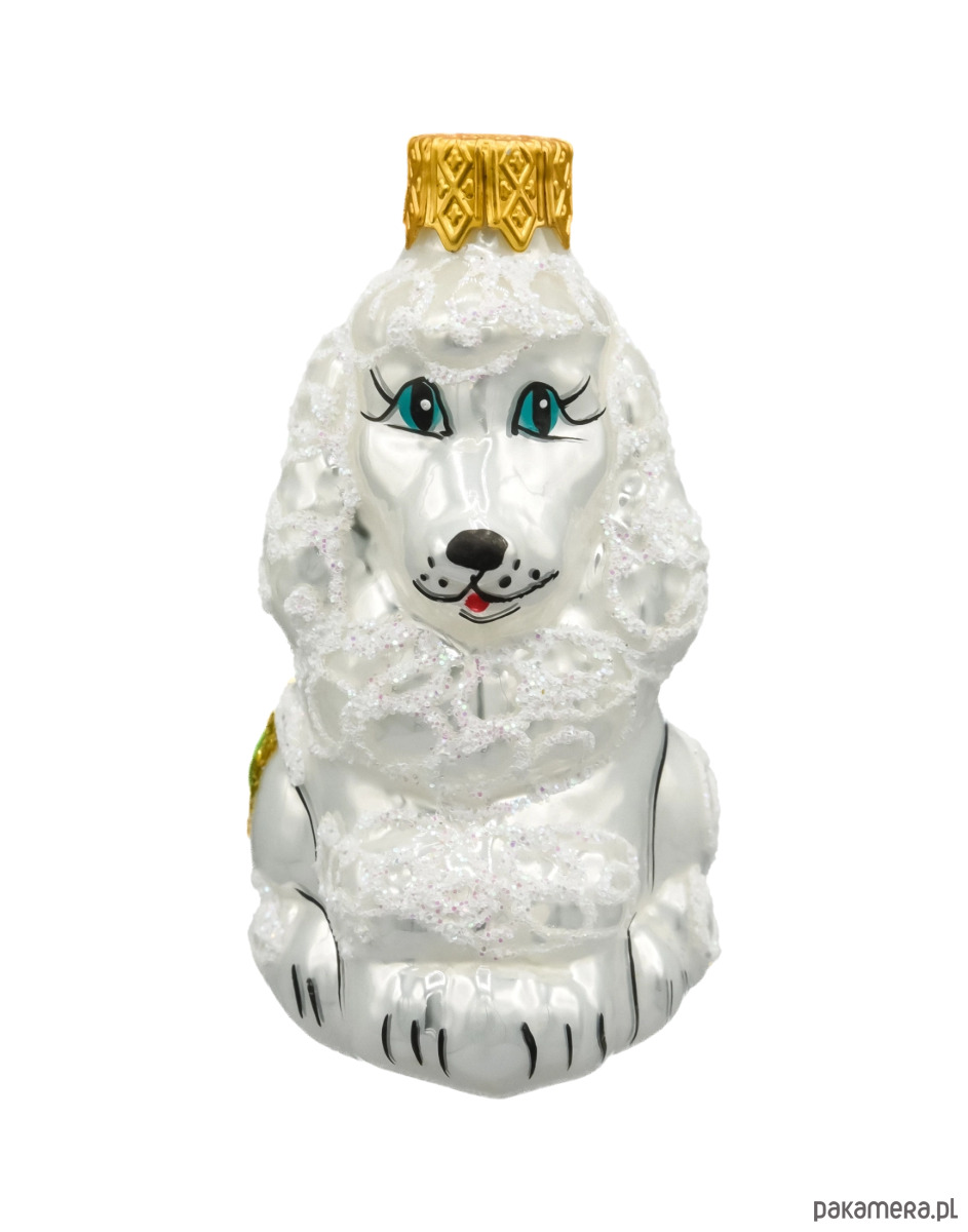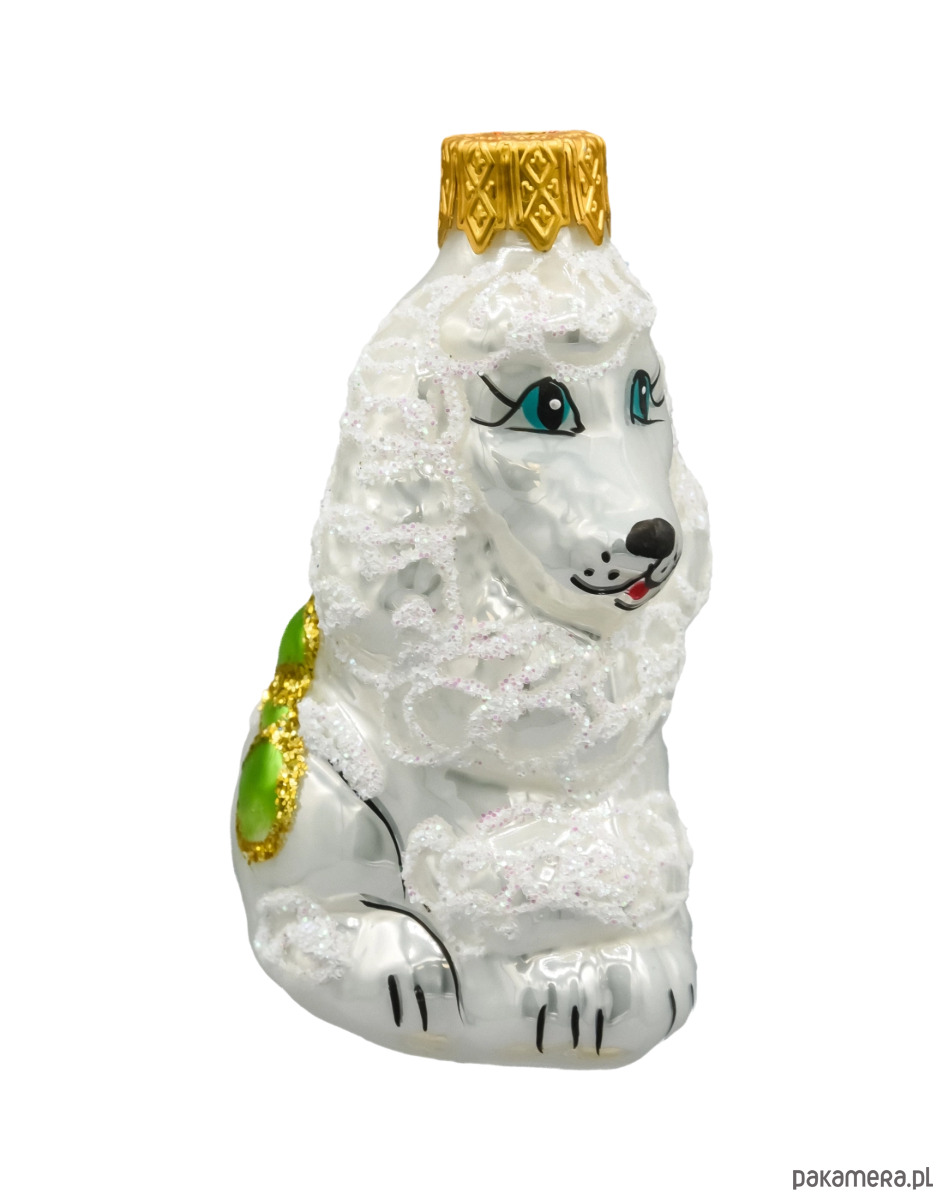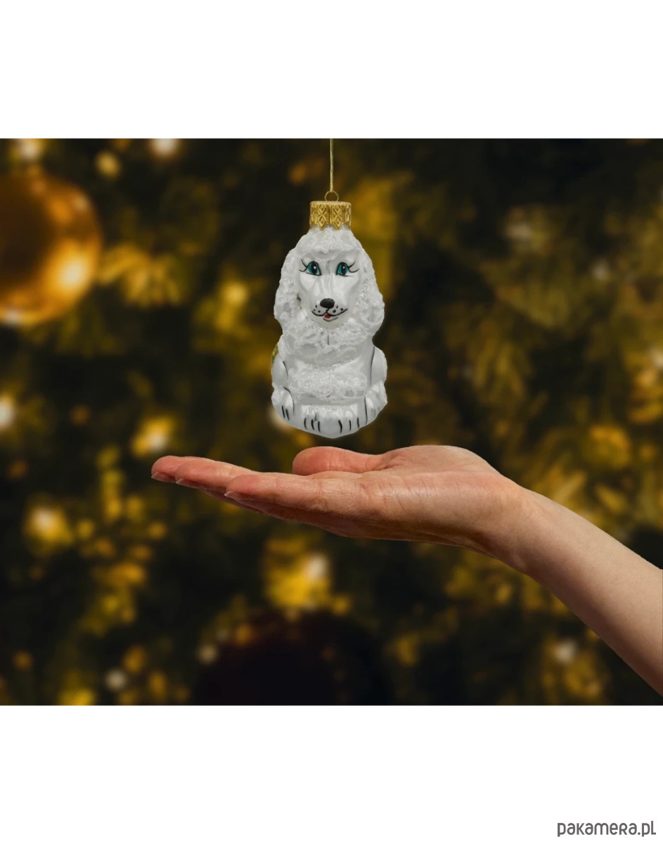 Ta wyjątkowa bombka w kształcie białego pudla to prawdziwa perła wśród ozdób choinkowych. W całości wykonana z dmuchanego szkła, zachwyca precyzyjnym rzeźbieniem oraz ręcznym malowaniem. Lśniąca, srebrzysta powierzchnia psa pokryta jest delikatnym brokatem imitującym charakterystyczną, puszystą sierść pudla. Urocze, niebieskie oczy, starannie zaznaczone kontury oraz czerwony języczek dodają bombce charakteru i wyrazu.