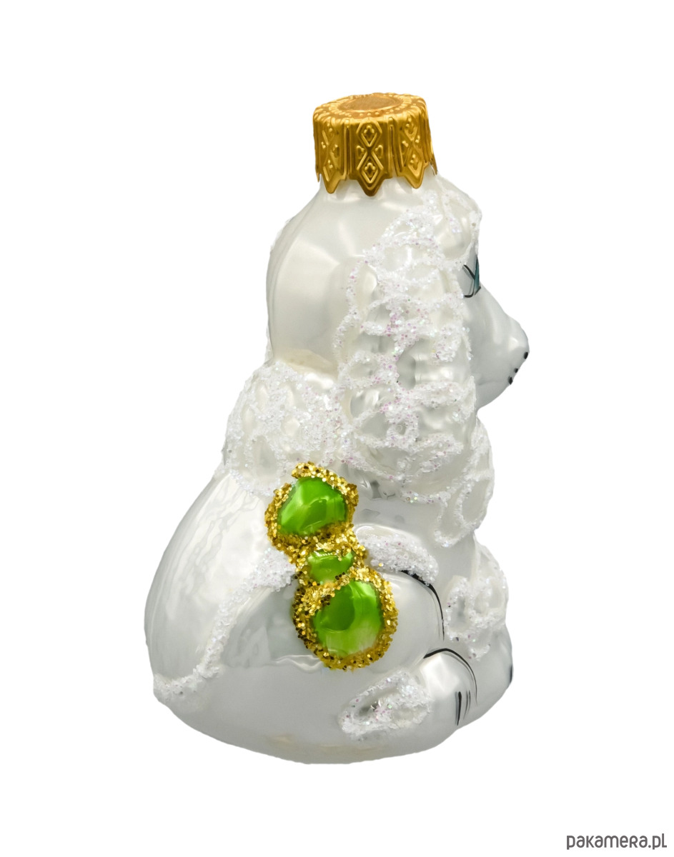 Na grzbiecie pudla znajduje się dekoracyjna, zielona kokarda z brokatowym akcentem, która kontrastuje z bielą futerka i przyciąga wzrok. Bombka posiada złoty kapturek do zawieszenia, dzięki czemu bezpiecznie ozdobi każdą choinkę. Idealna dla miłośników psów, eleganckich dekoracji lub jako stylowy prezent bożonarodzeniowy.