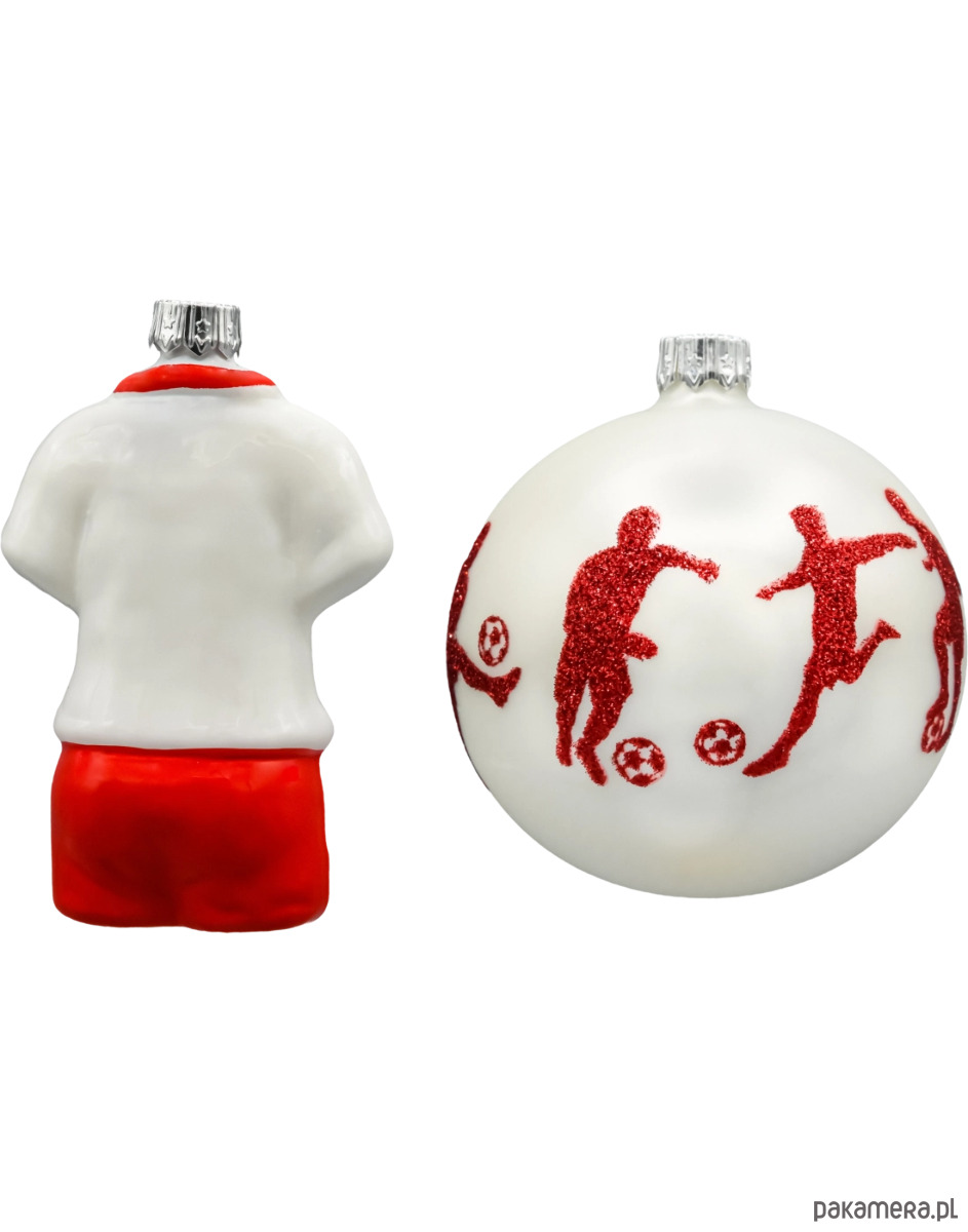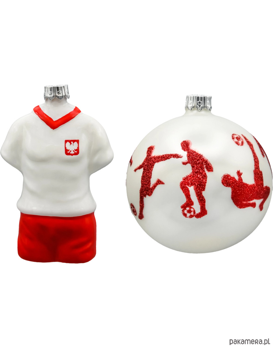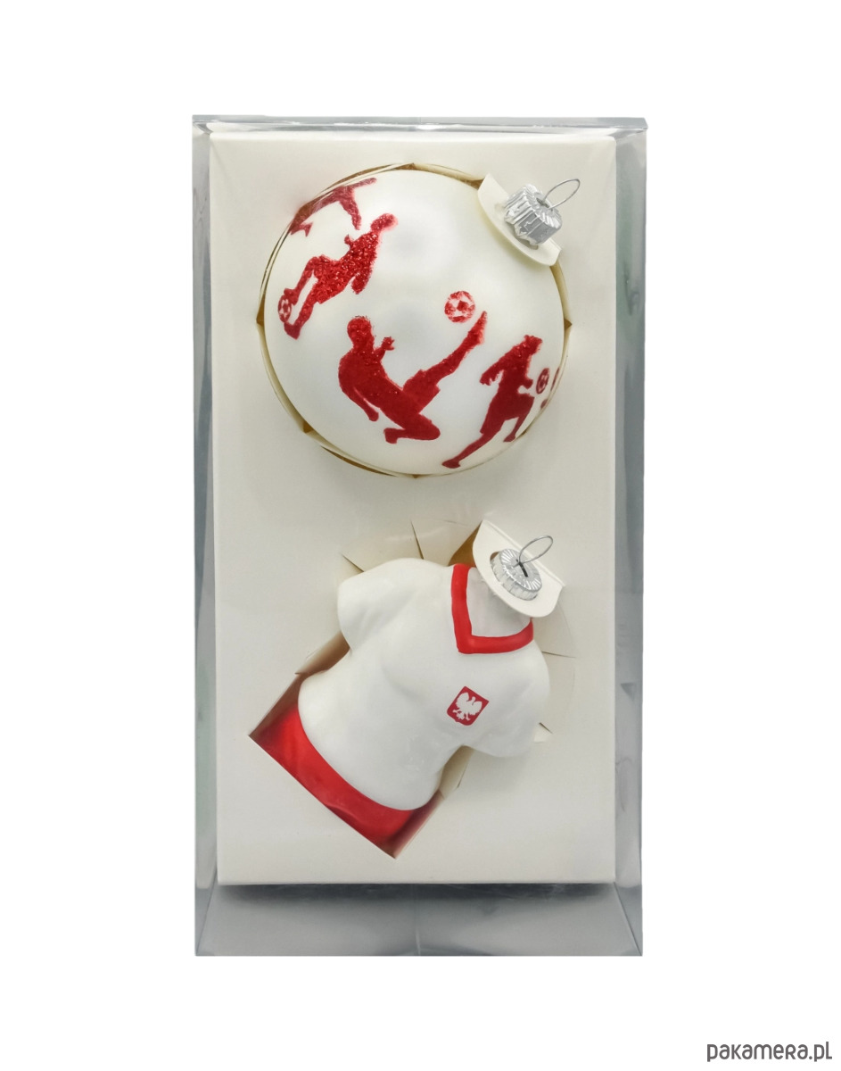 Zestaw dwóch wyjątkowych szklanych bombek choinkowych inspirowanych pasją do piłki nożnej i narodową dumą. To propozycja idealna dla kibiców reprezentacji Polski oraz miłośników oryginalnych dekoracji świątecznych z charakterem.