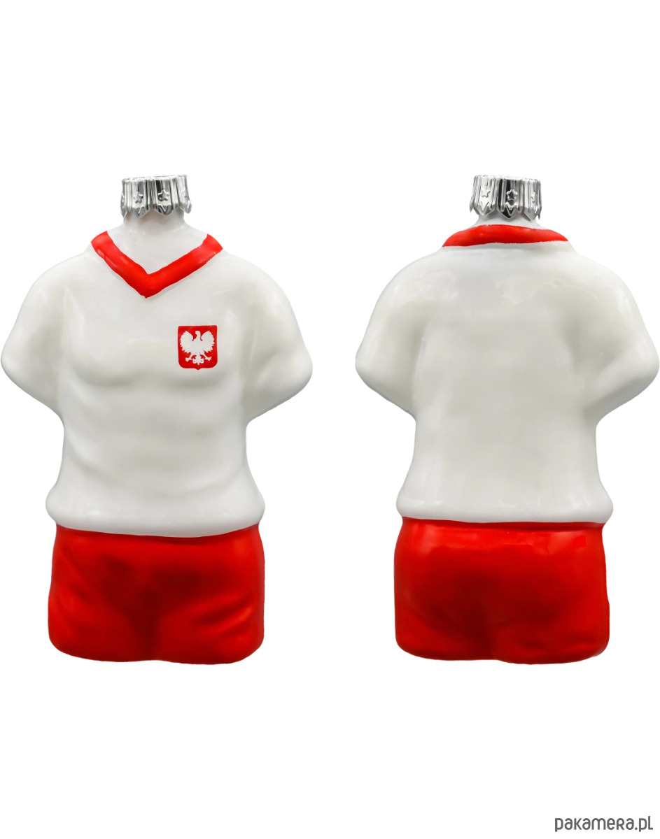 Druga bombka przedstawia biało-czerwony strój reprezentacji Polski z godłem – stylizowaną koszulkę z szortami. Została precyzyjnie uformowana i ręcznie malowana z dbałością o każdy szczegół – od konturów torsu po herb z orłem. Trójwymiarowa forma sprawia, że dekoracja wygląda jak miniaturowy trykot sportowy zawieszony na choince.