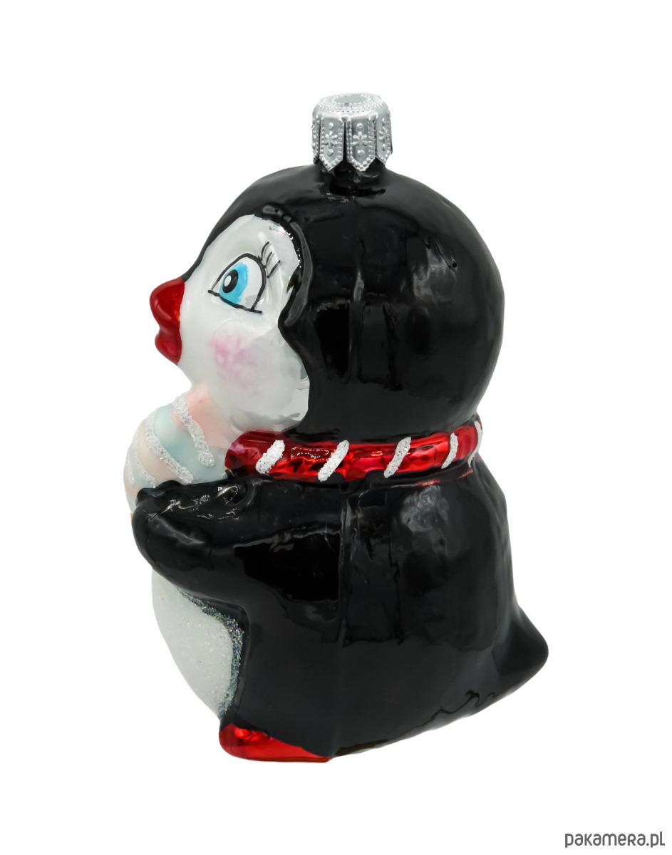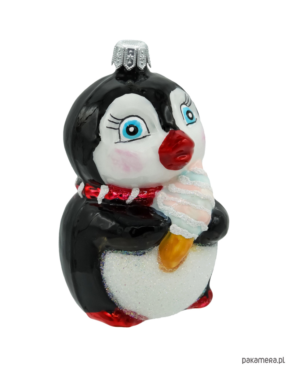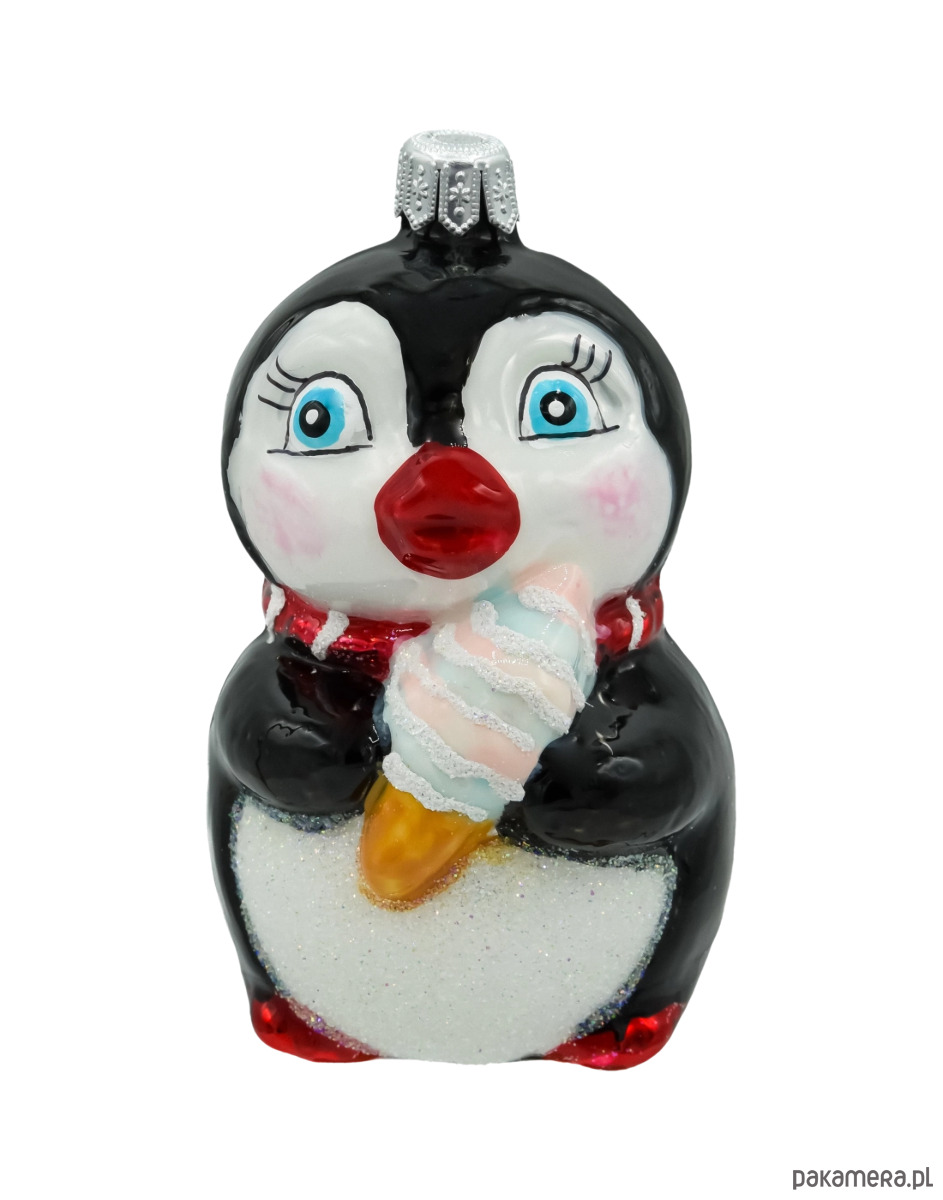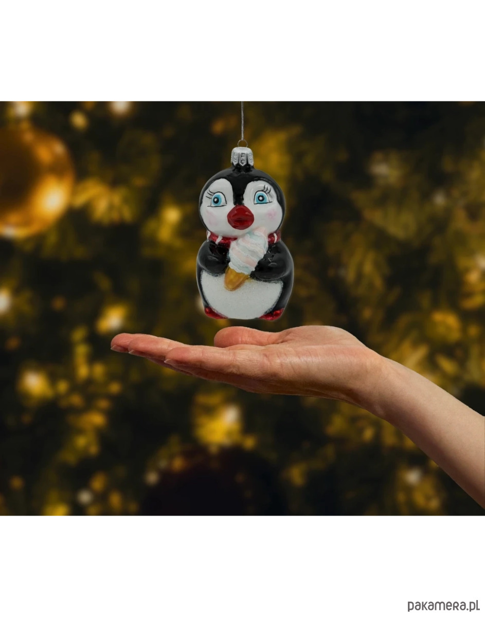 Urocza szklana bombka w kształcie pingwina z lodami to połączenie świątecznego wdzięku i bajkowej fantazji. Ręcznie malowana ozdoba zachwyca intensywnymi kolorami – błyszcząca czerń kontrastuje z bielą i pastelowymi akcentami lodów, tworząc niezwykle efektowną całość. Figurka trzyma rożek lodowy, którego warstwy zdobione są mieniącym się brokatem, a czerwony szalik dodaje jej zimowego charakteru. Bombka wykonana została ze szkła z dbałością o każdy detal – od zalotnego spojrzenia po połyskujący brzuszek. To idealna dekoracja dla miłośników radosnych, niebanalnych ozdób choinkowych z nutką humoru.