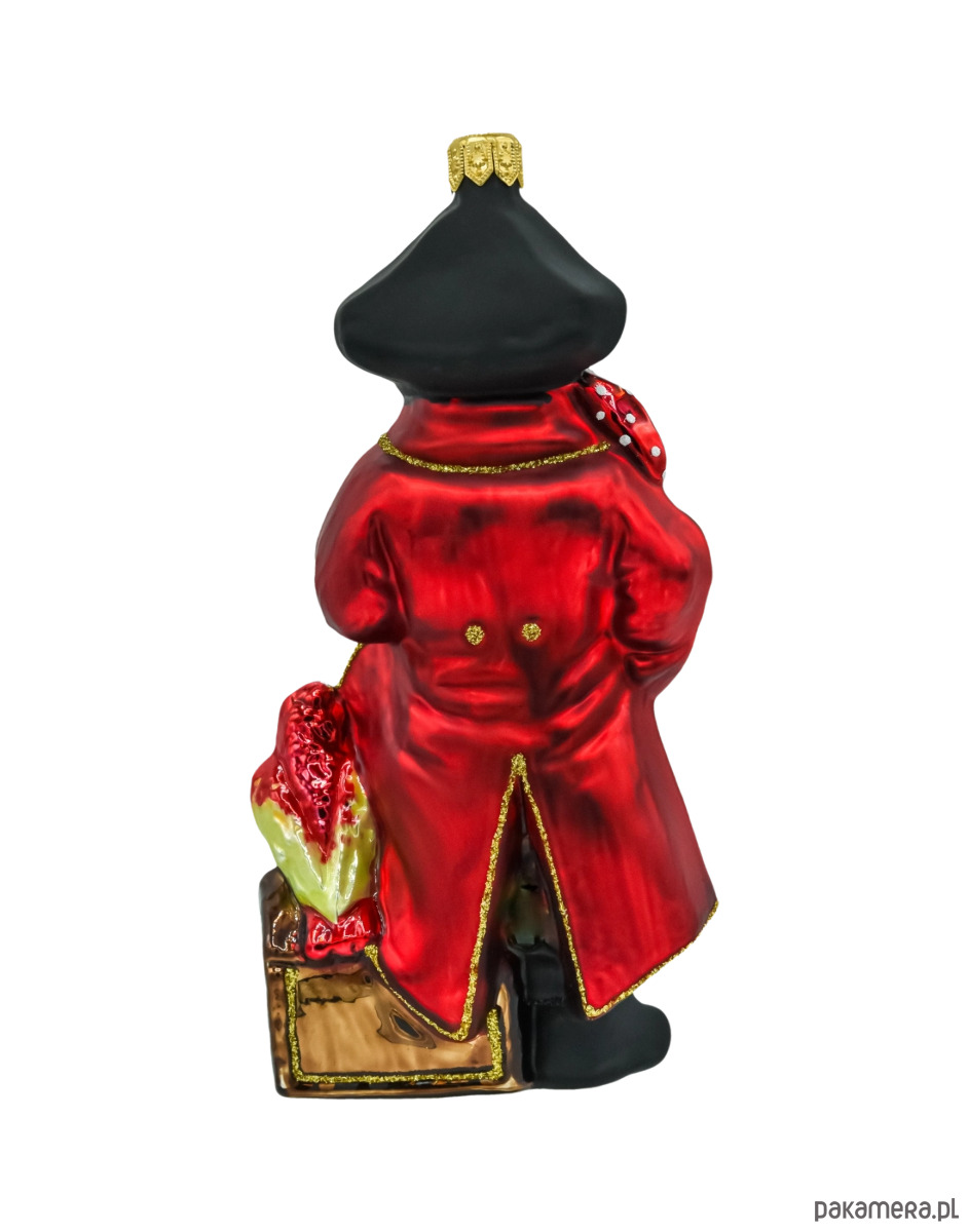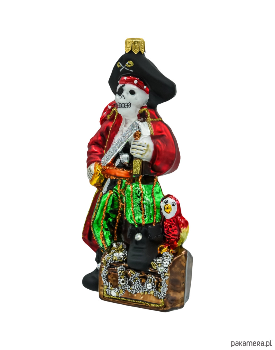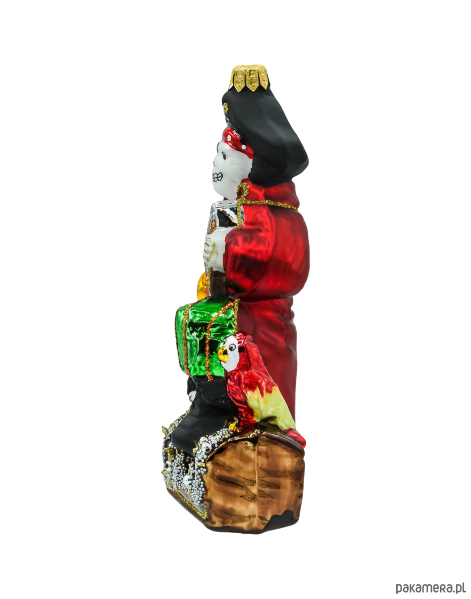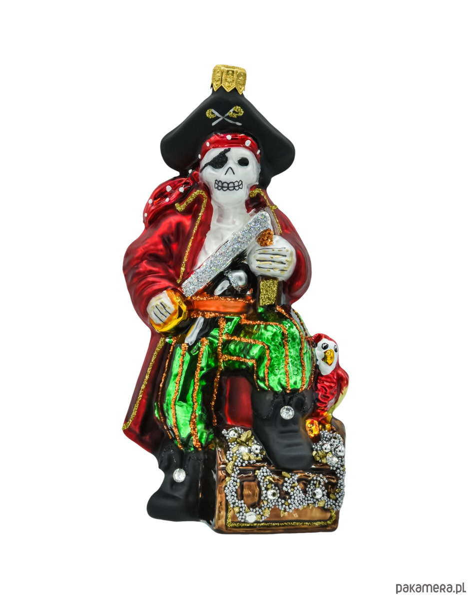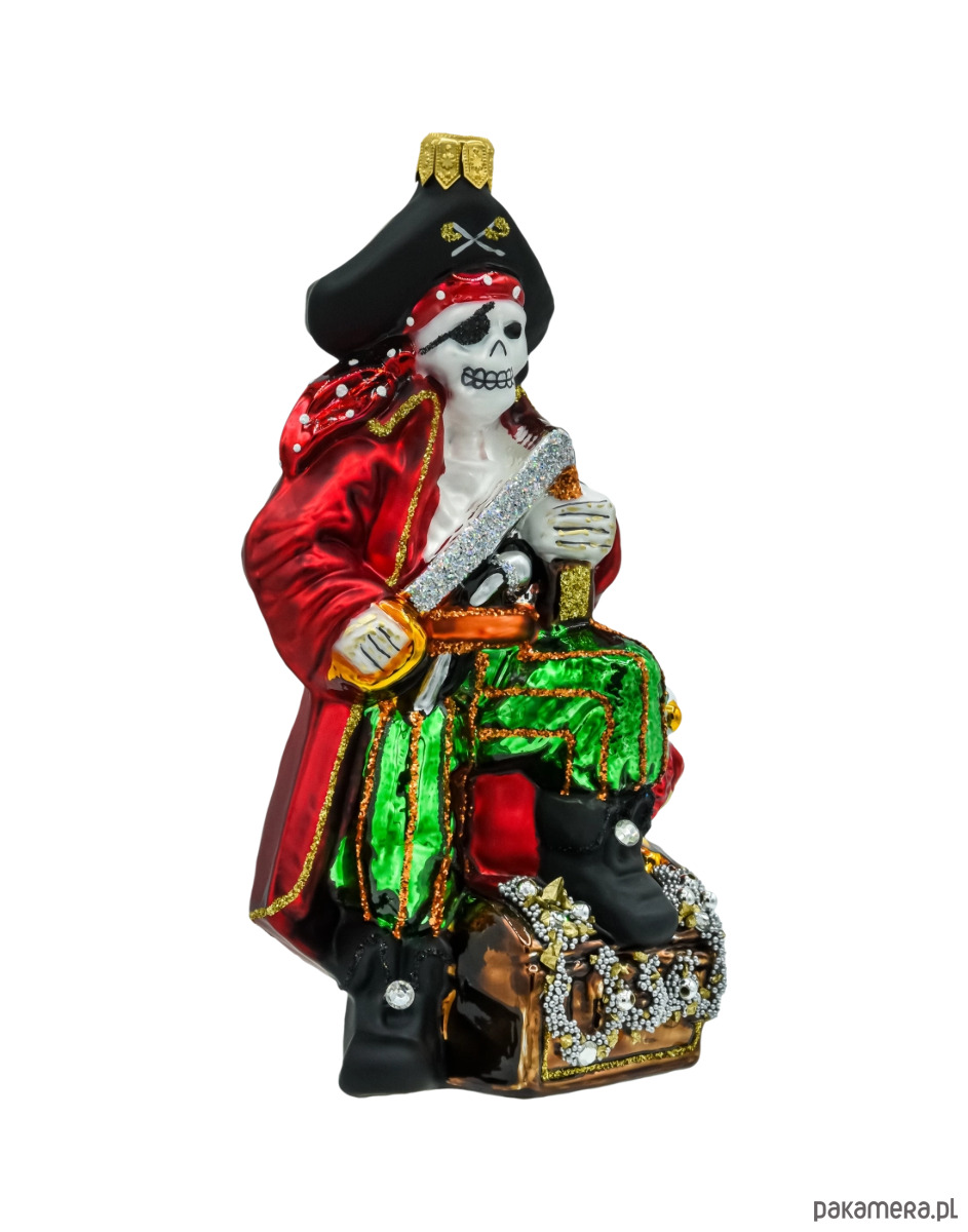 Bombka szklana „Pirat ze skrzynią skarbów” – efektowna, figuralna ozdoba choinkowa, która natychmiast przyciąga wzrok. Dmuchane szkło zostało ręcznie malowane i bogato zdobione brokatem oraz połyskującymi akcentami, dzięki czemu każdy egzemplarz jest niepowtarzalny. Postać pirata–szkieletu w czarnym trójgraniastym kapeluszu i czerwonym płaszczu siedzi na skrzyni pełnej klejnotów, obok czuwa papuga – to gotowa mini-scenka, która doda charakteru zarówno tradycyjnej, jak i tematycznej choince.