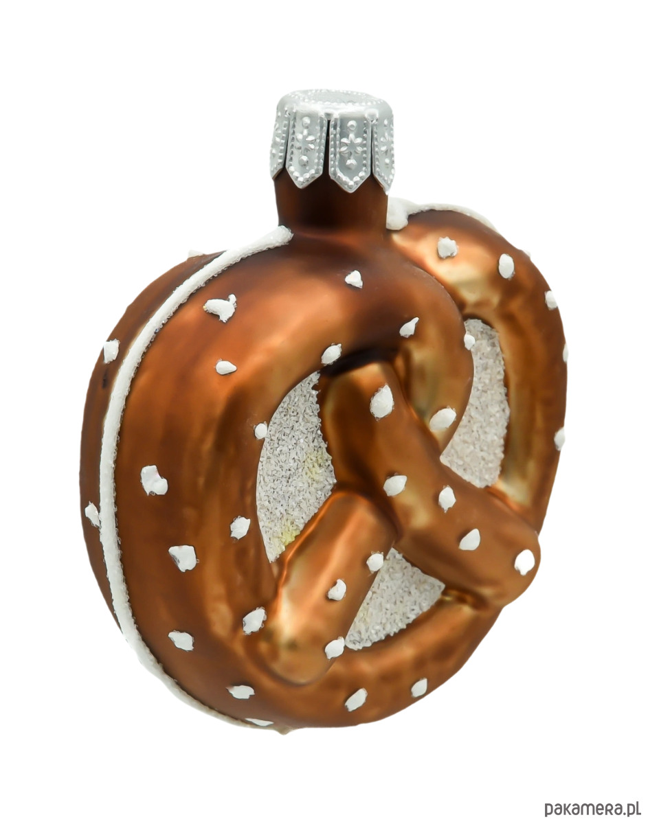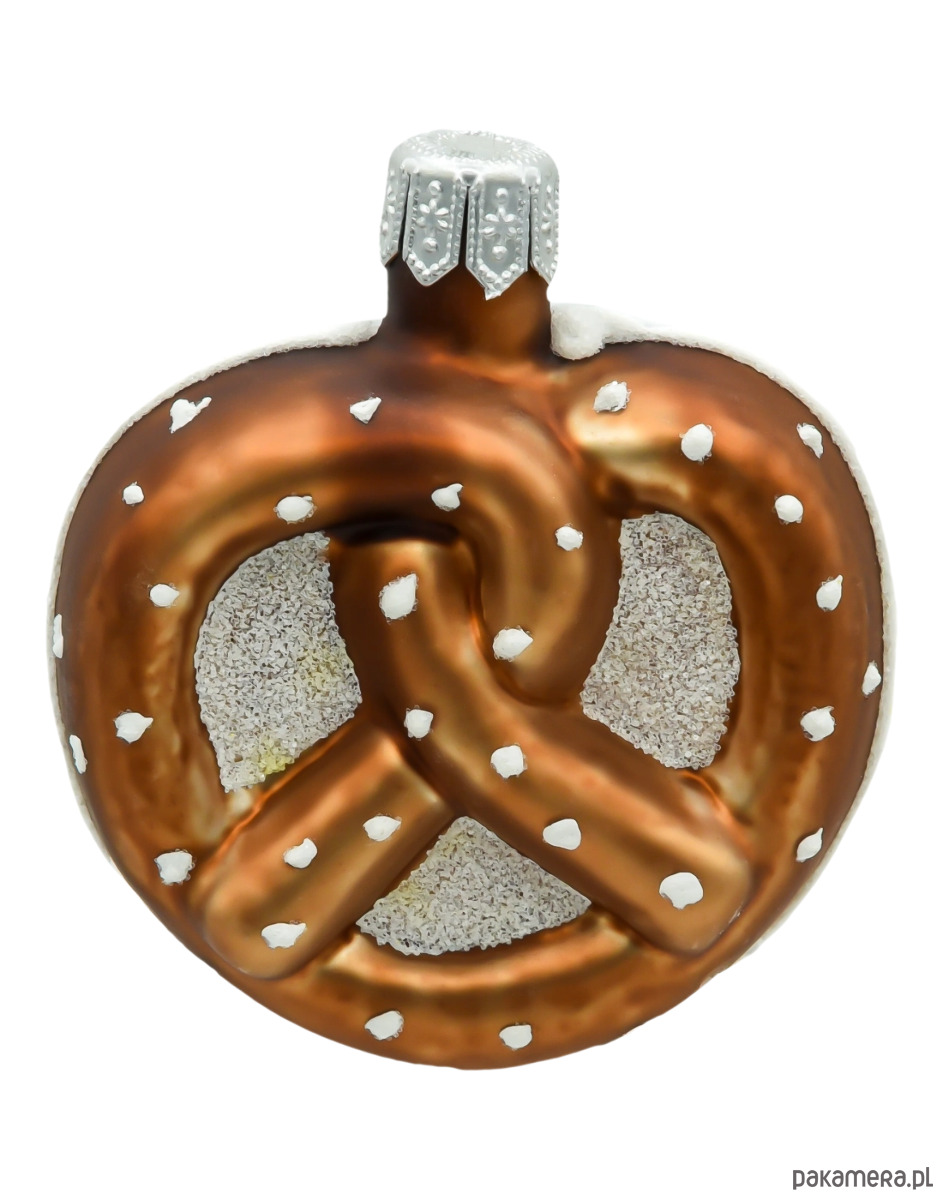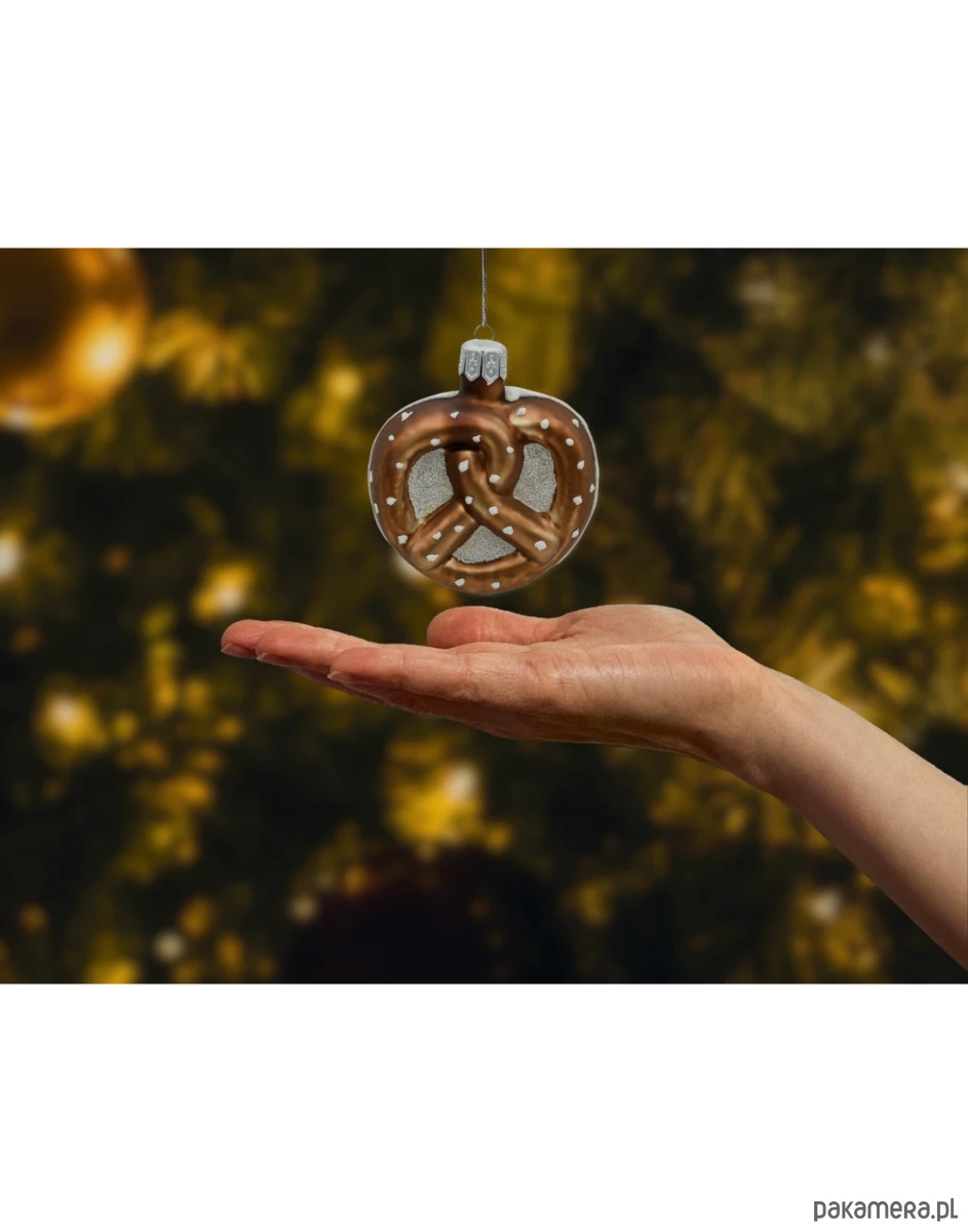 Zaskocz gości i dodaj szczyptę humoru do swojej choinki dzięki wyjątkowej bombce w kształcie precla! Ta ręcznie wykonana ozdoba to prawdziwa perełka wśród świątecznych dekoracji – wygląda niemal jak prawdziwy, świeżo wypieczony precel, pokryty solą. Ciepły brązowy kolor szkła idealnie odwzorowuje wypieczone ciasto, a białe drobinki „soli” dodają jej autentyczności.