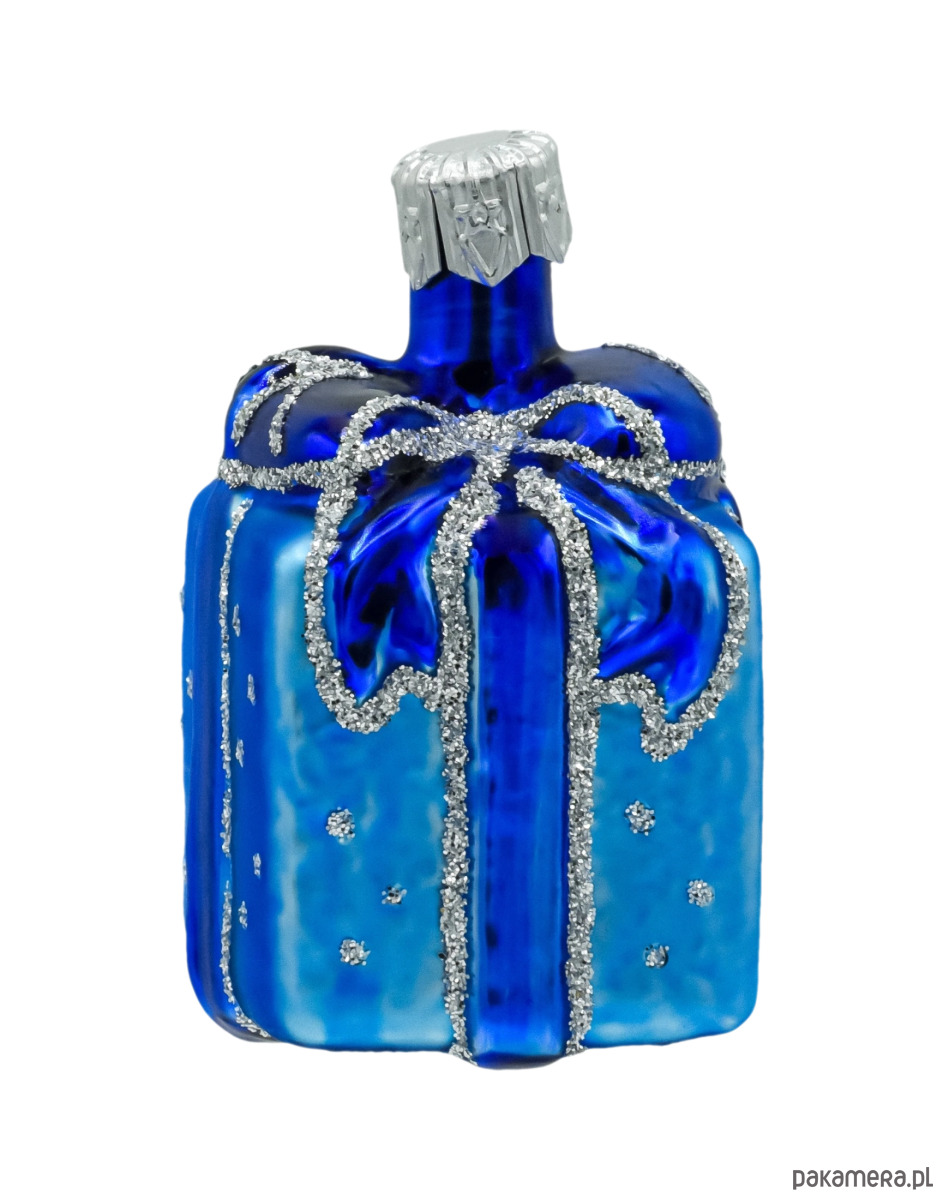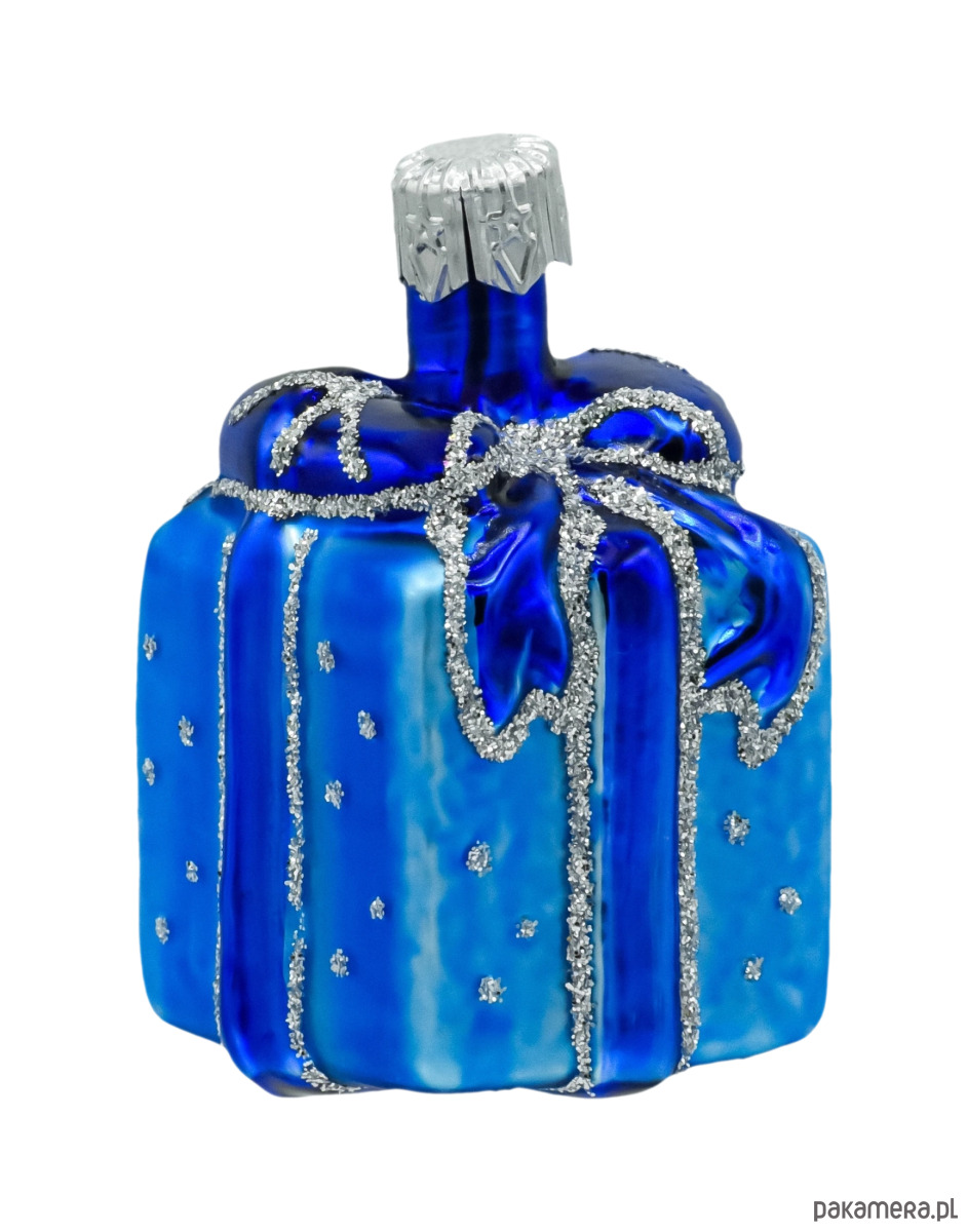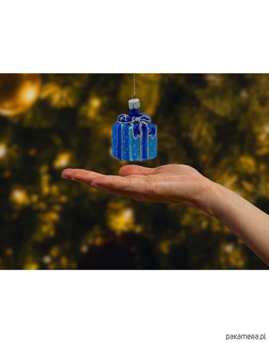 Bombka ma formę kwadratowego pudełka prezentowego, ozdobionego połyskującą niebieską kokardą i delikatnym srebrnym brokatem. Jej powierzchnię zdobią drobne, błyszczące kropki przypominające śnieżny puch. Harmonijne połączenie odcieni kobaltu, błękitu i srebra sprawia, że prezentuje się niezwykle luksusowo i gustownie.