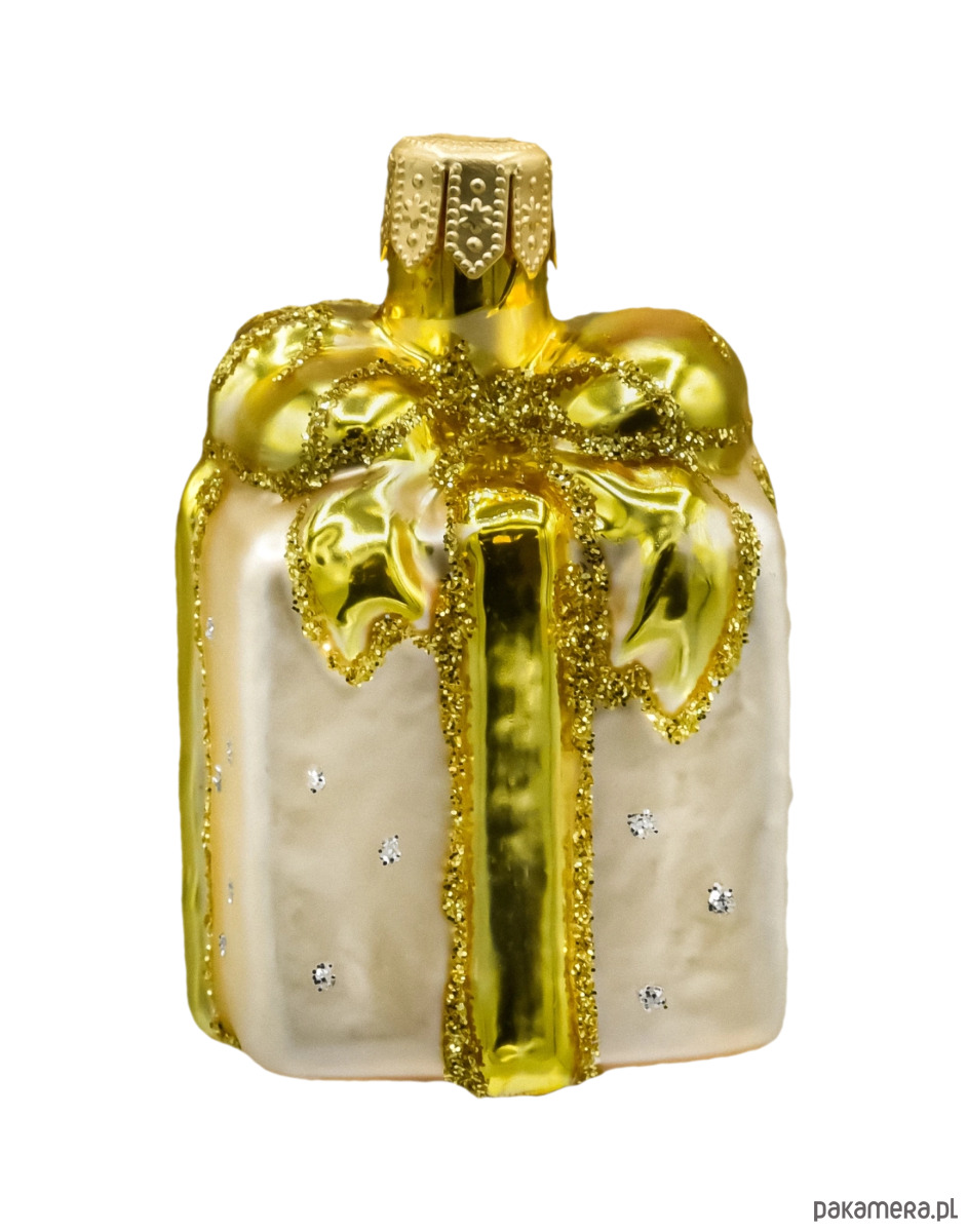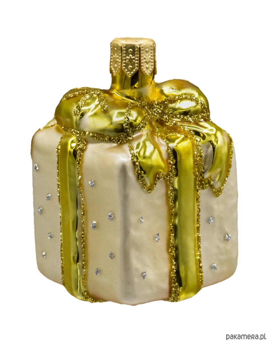 Szklana bombka choinkowa Prezent w złocie i perle – ręcznie zdobiona ozdoba świąteczna