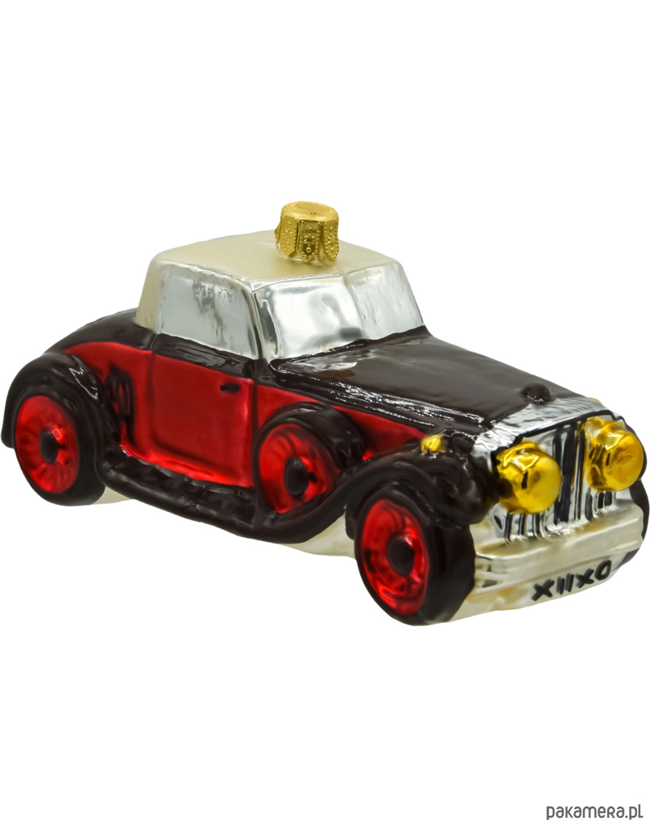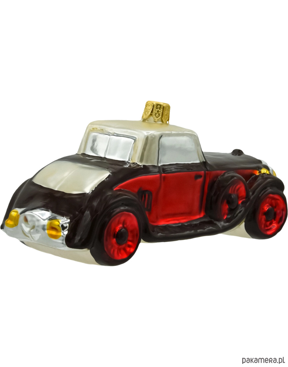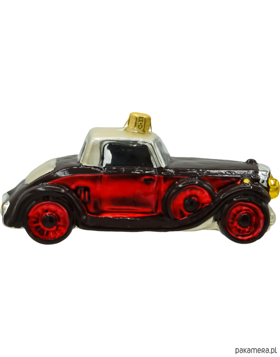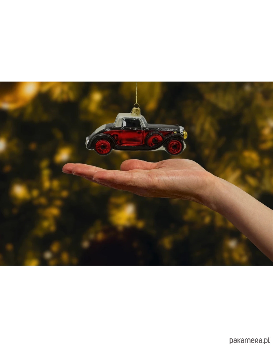 Wytworna szklana bombka w kształcie stylizowanego samochodu retro, która łączy klasyczny urok z nutą świątecznego blasku. Ręcznie malowana i starannie wykończona w intensywnych odcieniach czerwieni, czerni i srebra, przyciąga uwagę subtelnymi detalami: złotymi reflektorami, wyraźnymi liniami nadwozia oraz kontrastującym, perłowym dachem. Dynamiczna sylwetka pojazdu i lśniące koła dodają jej charakteru, a całość tworzy elegancką ozdobę, idealną dla miłośników motoryzacji, stylu vintage i nietuzinkowych dekoracji świątecznych.