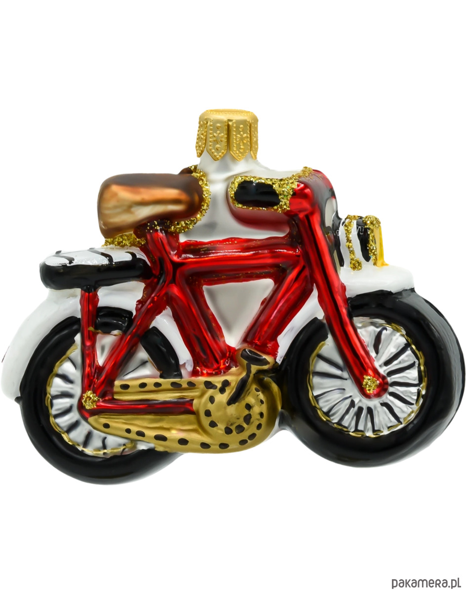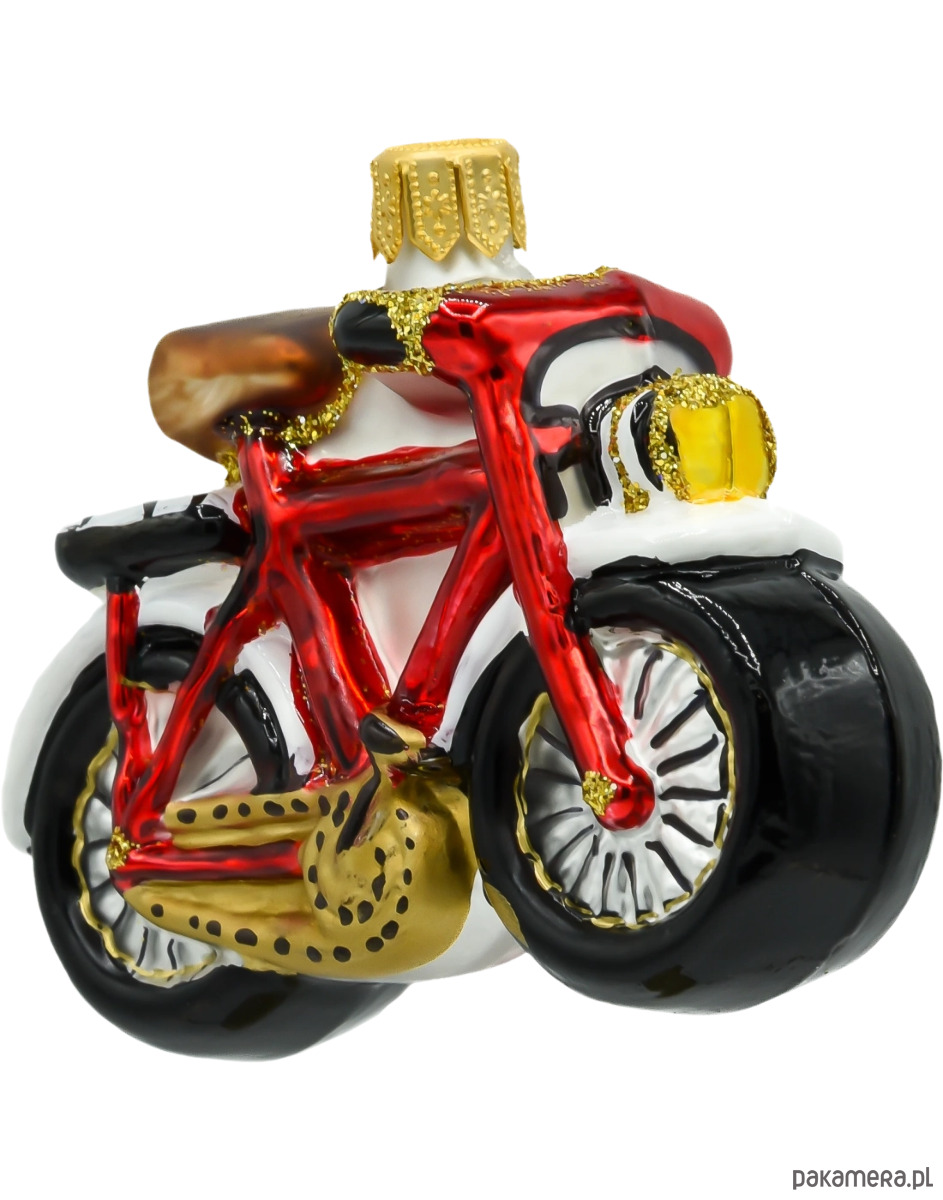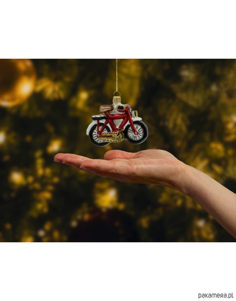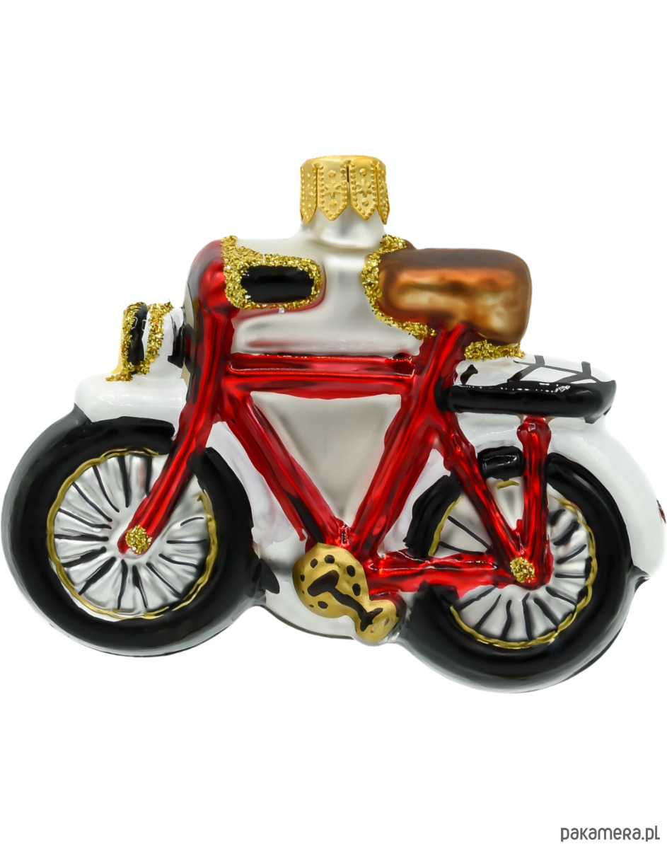 Design: Bombka przedstawia rower w stylu retro z czerwonym, elegancko wykończonym ramą, złotymi akcentami oraz detalami w kolorach bieli i czerni.