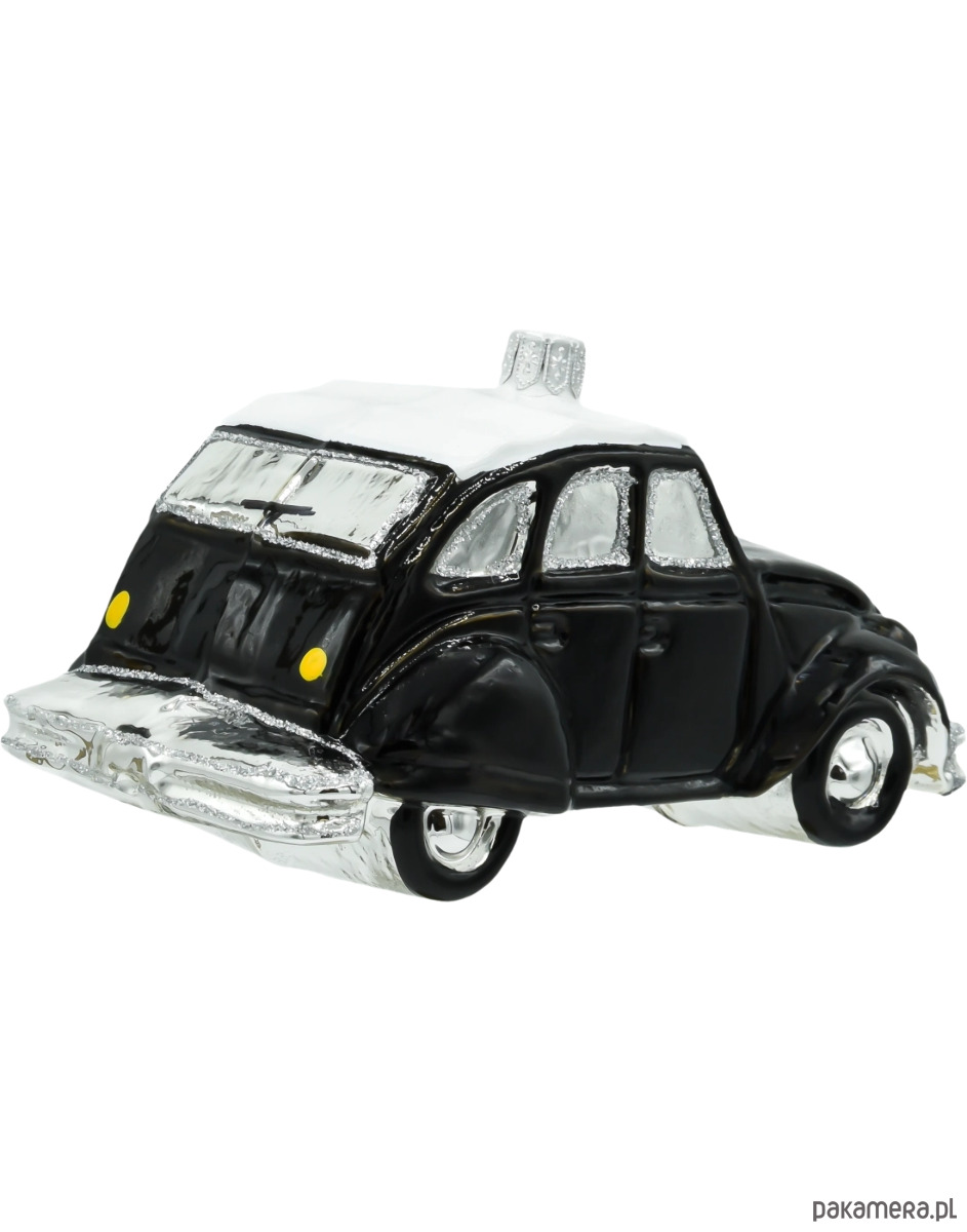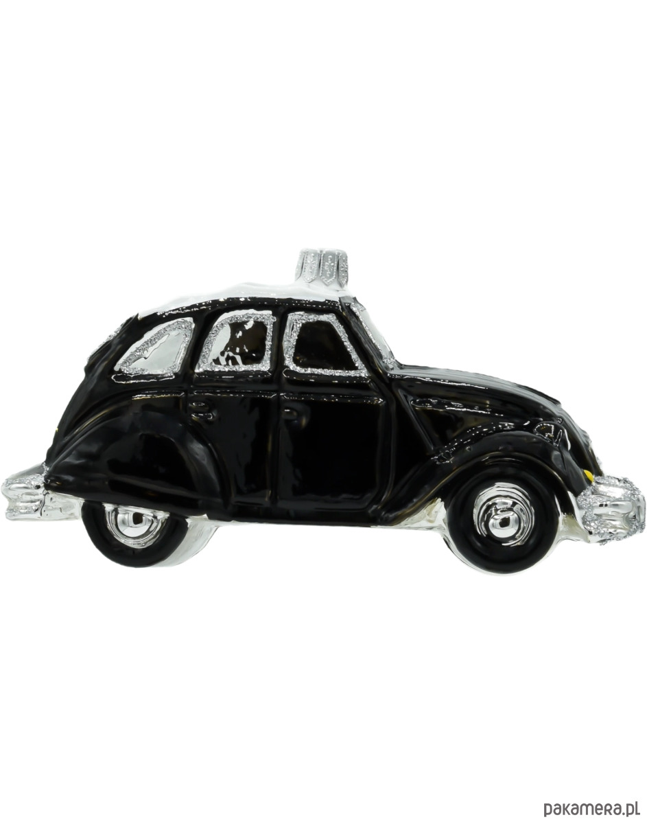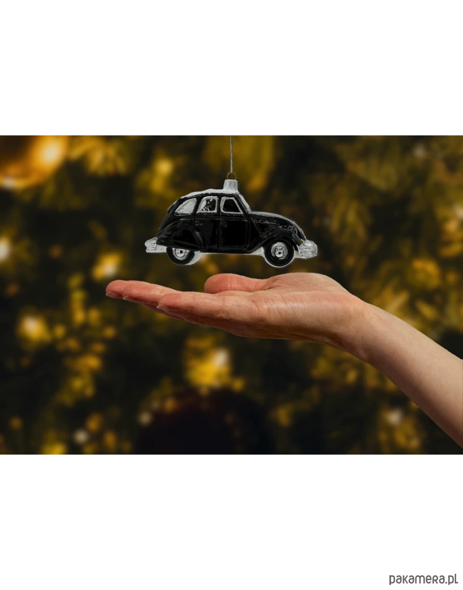 Ta szklana bombka choinkowa w kształcie czarnego samochodu retro to elegancka ozdoba świąteczna inspirowana klasycznym Citroënem 2CV. Wykonana ze szkła i ręcznie malowana, przyciąga wzrok połyskującą czernią i srebrzystymi detalami wykończenia. Brokat podkreśla linie karoserii, reflektory i zderzaki, dodając całości blasku i świątecznego charakteru. Bombka ma subtelnie narysowane oczka na przedniej szybie, co nadaje jej lekko bajkowy i figlarny akcent.