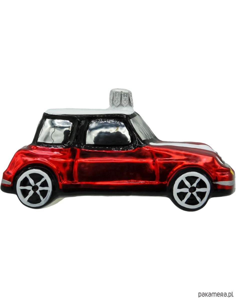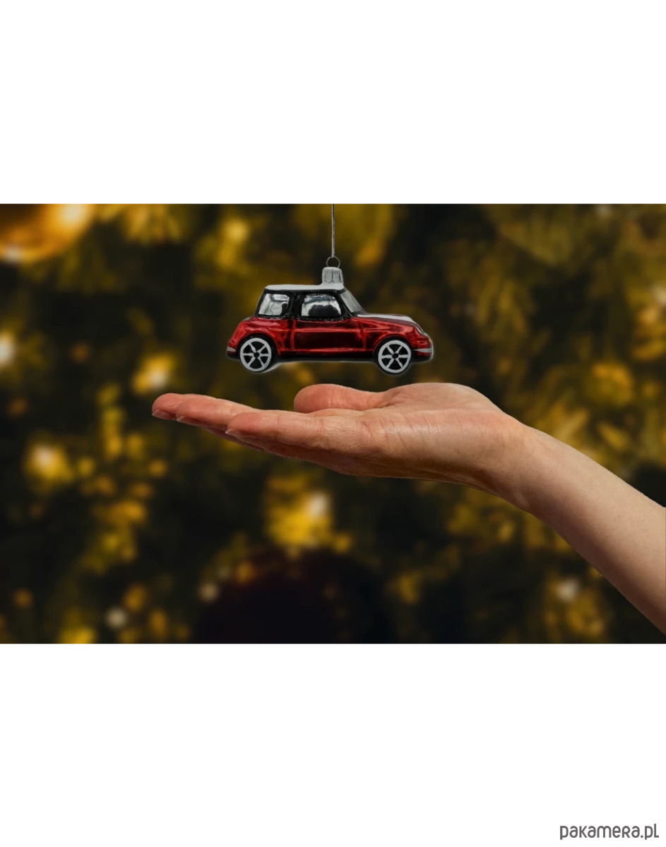 Szklana bombka choinkowa – czerwony samochód Mini Cooper czerwony z białym dachem