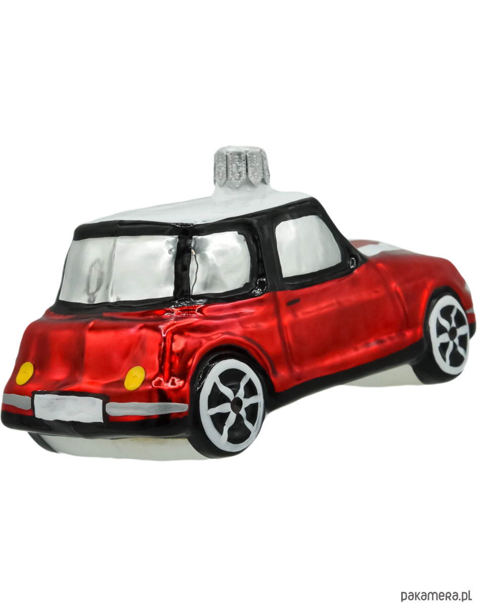 Szklana bombka przedstawia stylizowany model samochodu przypominający kultowe miejskie auta lat 60. i 70. Jej intensywnie czerwony lakier z błyszczącym wykończeniem doskonale kontrastuje z białym, perłowym dachem i czarnymi detalami. Chromowane akcenty na zderzakach i srebrzyste szyby podkreślają precyzję ręcznego zdobienia, a dynamiczne linie nadwozia nadają jej nowoczesnego charakteru mimo retro duszy.