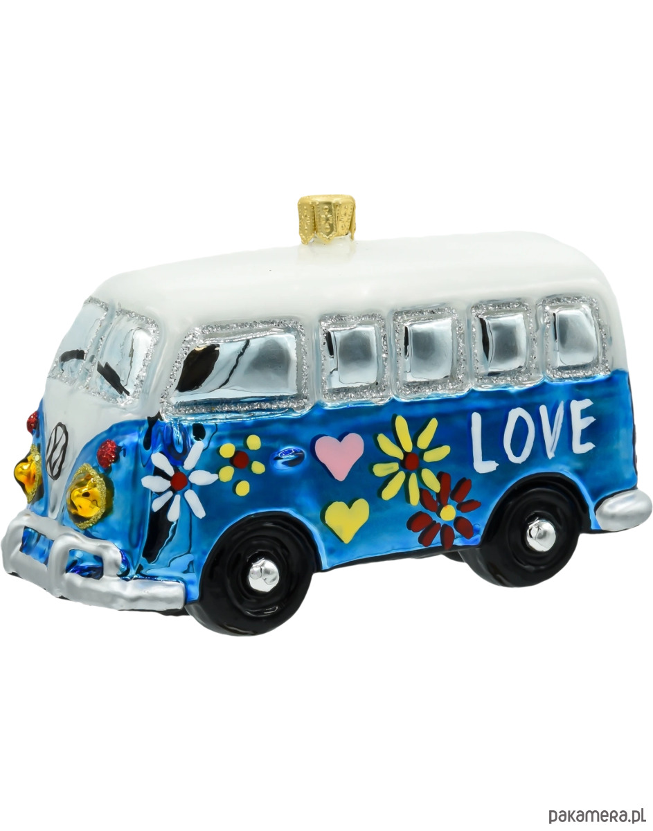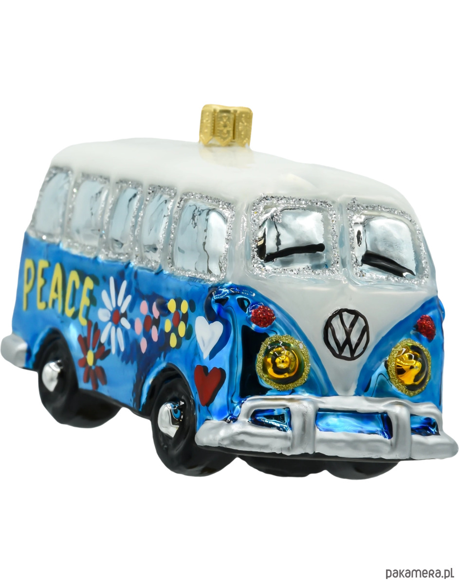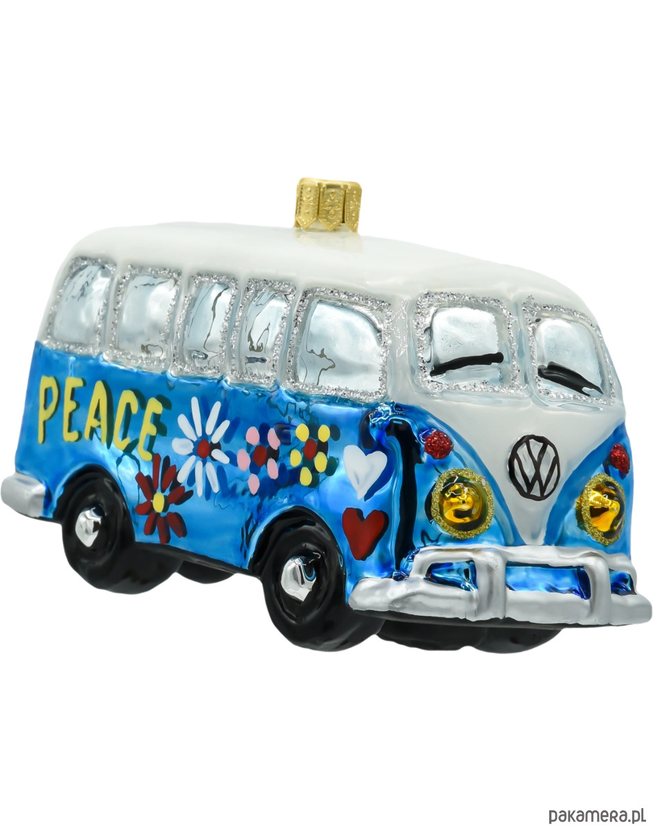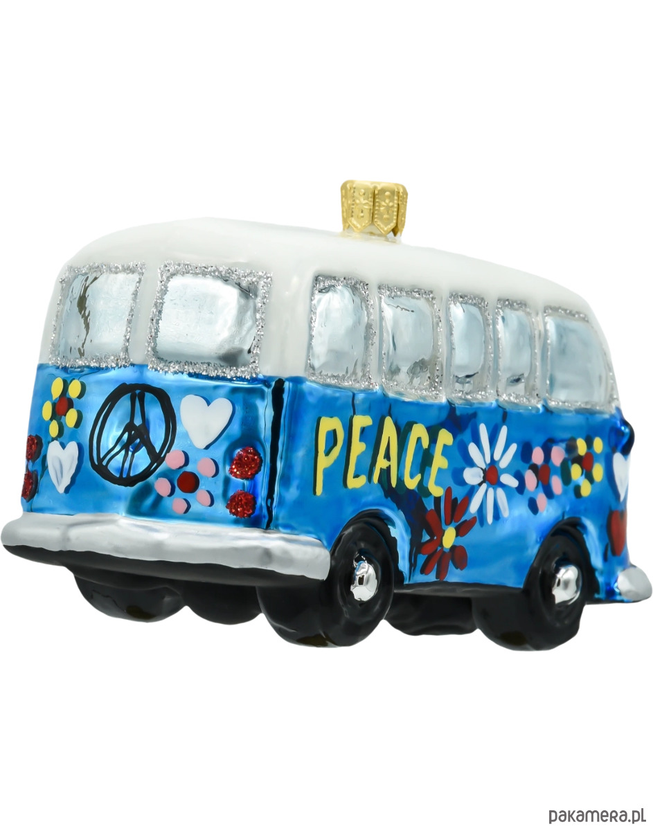 Wprowadź ducha lat 60. i klimat wolności na swoją choinkę dzięki tej wyjątkowej szklanej bombce w kształcie kultowego niebieskiego busa hippie! Bombka przedstawia stylizowanego vana ozdobionego ręcznie malowanymi detalami – kolorowymi kwiatami, serduszkami i dużym napisem „PEACE”, który idealnie wpisuje się w estetykę ery miłości, muzyki i wolności. Całość dopełniają połyskujące elementy dekoracyjne i wyrazisty błękit lakieru, przyciągający wzrok na tle choinki.