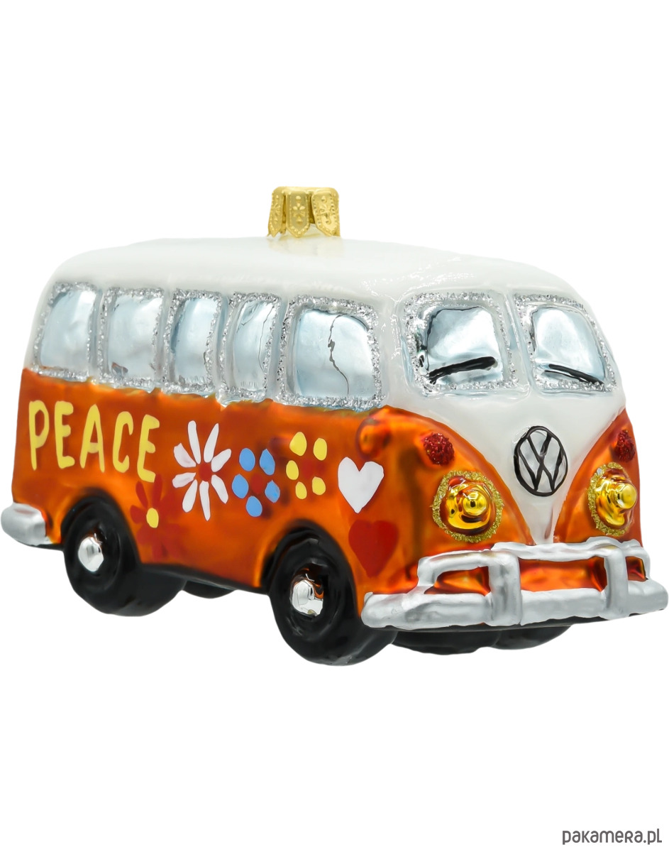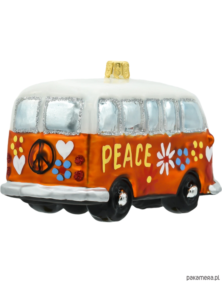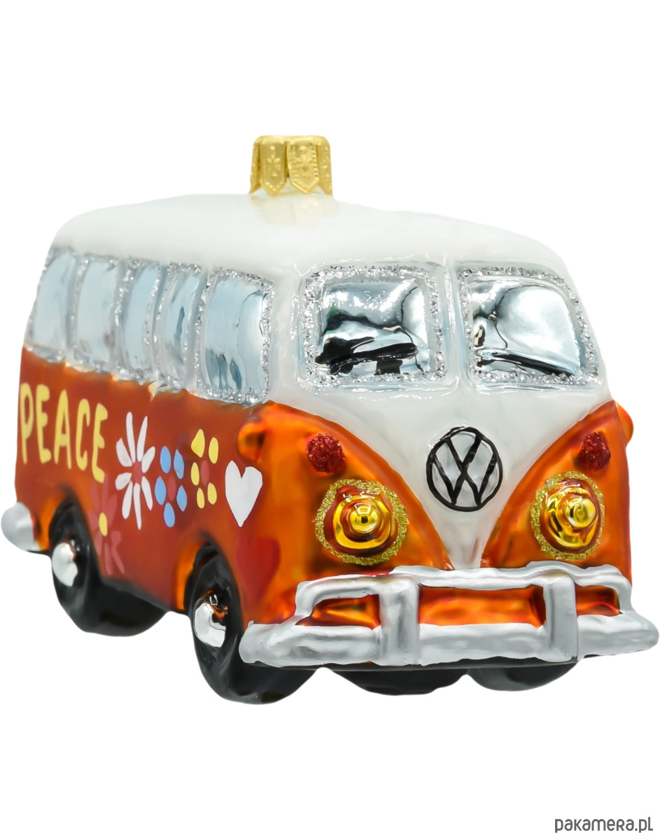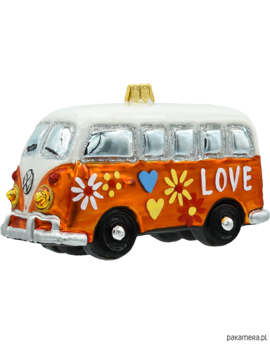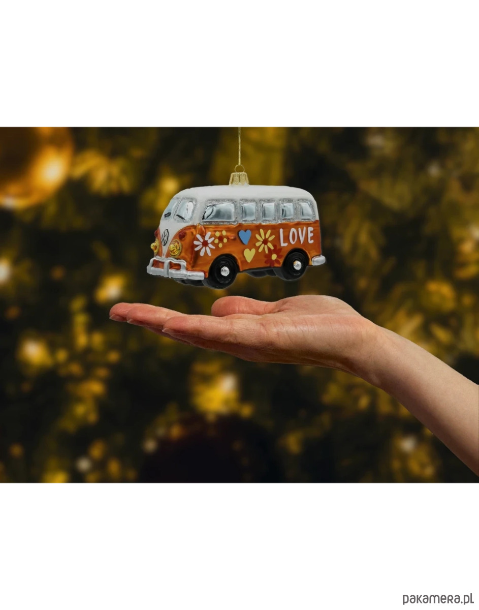 Ta wyjątkowa bombka w kształcie kultowego busa hippisów to prawdziwy hołd dla lat 60. i ducha wolności. Szklany samochód typu van został ręcznie ozdobiony intensywnymi kolorami: pomarańczowym, czerwonym i białym, a jego boki dekorują kwiaty, serca i napisy „PEACE” oraz „LOVE” – symbole pokoju, miłości i radości życia. Z przodu bombki umieszczono znak VW, a błyszczące reflektory i obramowania szyb podkreślono brokatem, który pięknie odbija światło choinkowych lampek.