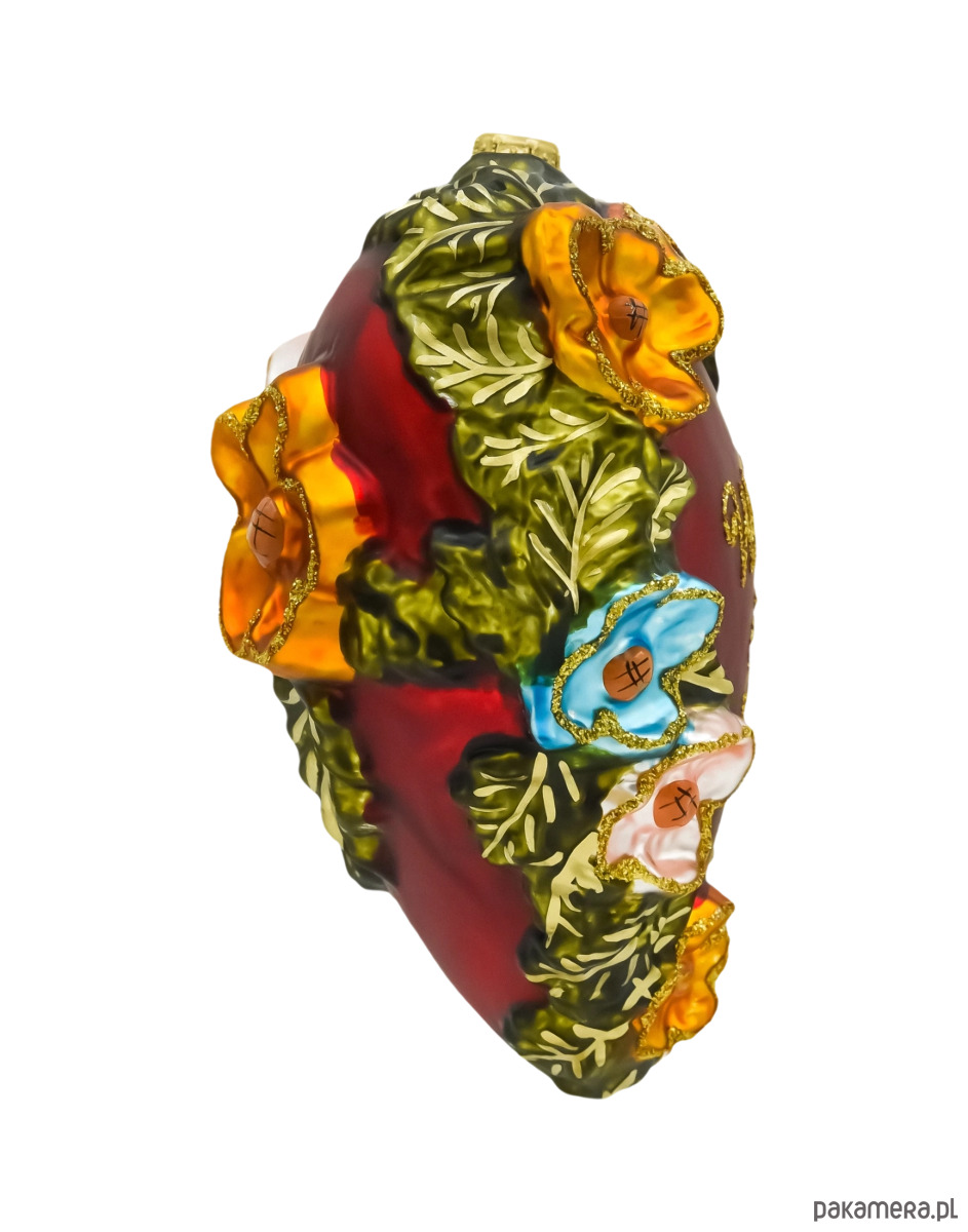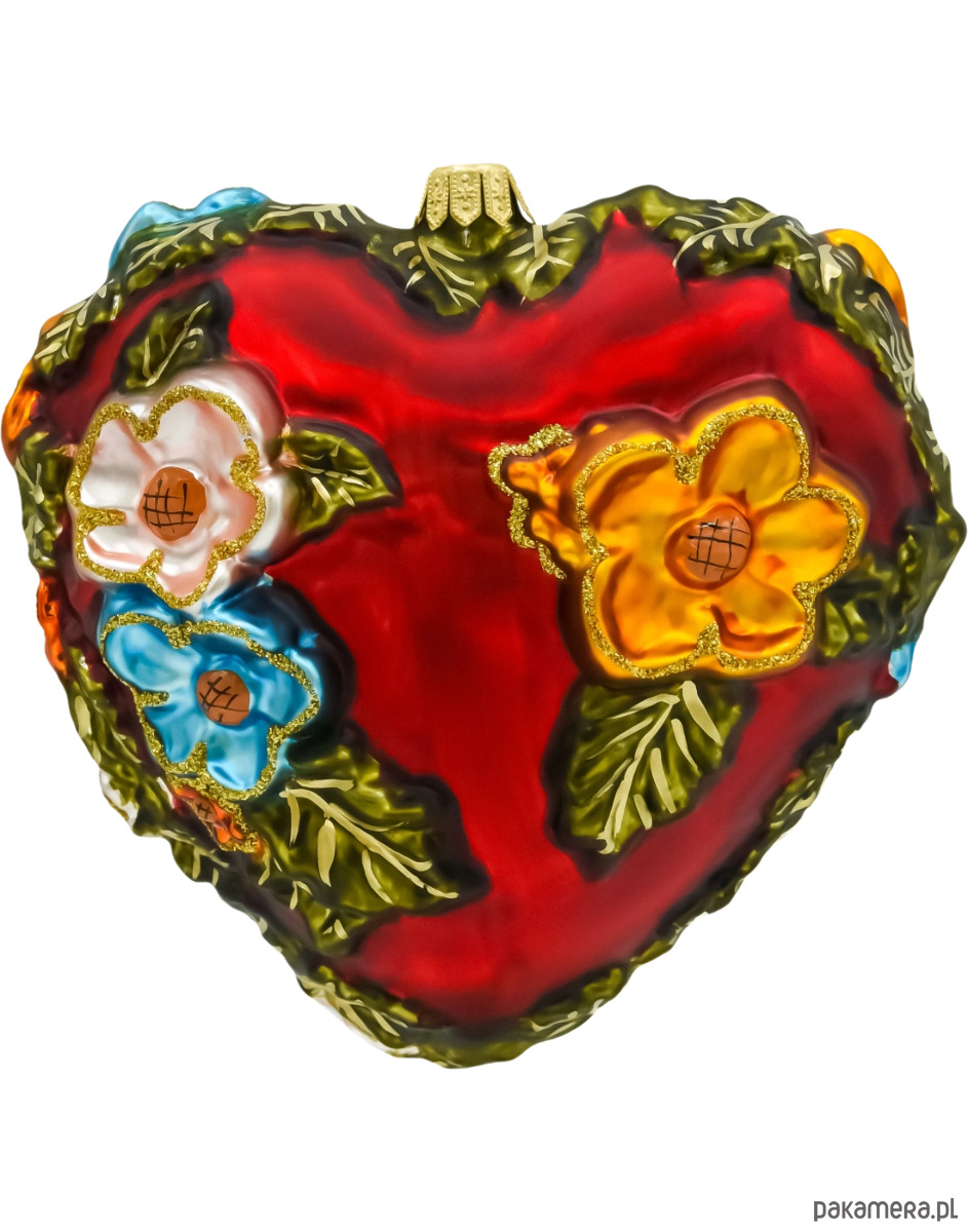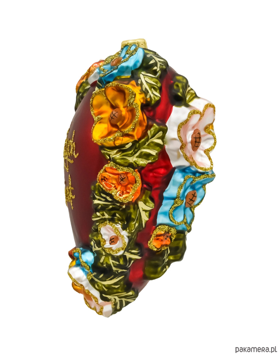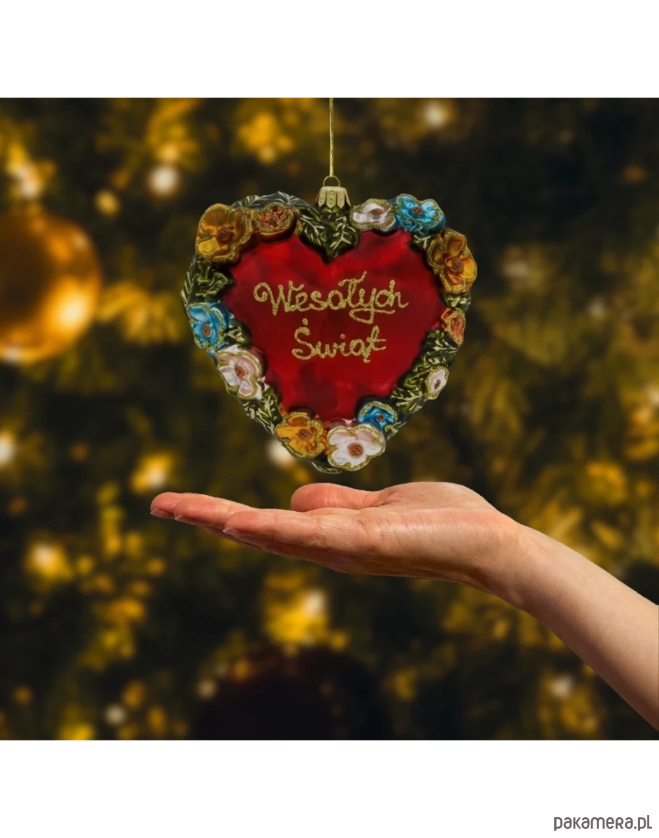 Dodaj wyjątkowego uroku swojej choince dzięki tej pięknej bombce w kształcie serca, która łączy klasykę z regionalną, folkową estetyką. Bombka choinkowa wykonana ze szkła ręcznie dmuchanego i malowanego, przedstawia czerwone, błyszczące serce ozdobione kolorowymi kwiatami oraz złotym napisem „Wesołych Świąt”, który przyciąga wzrok i nadaje świątecznej aranżacji ciepły, rodzinny klimat.