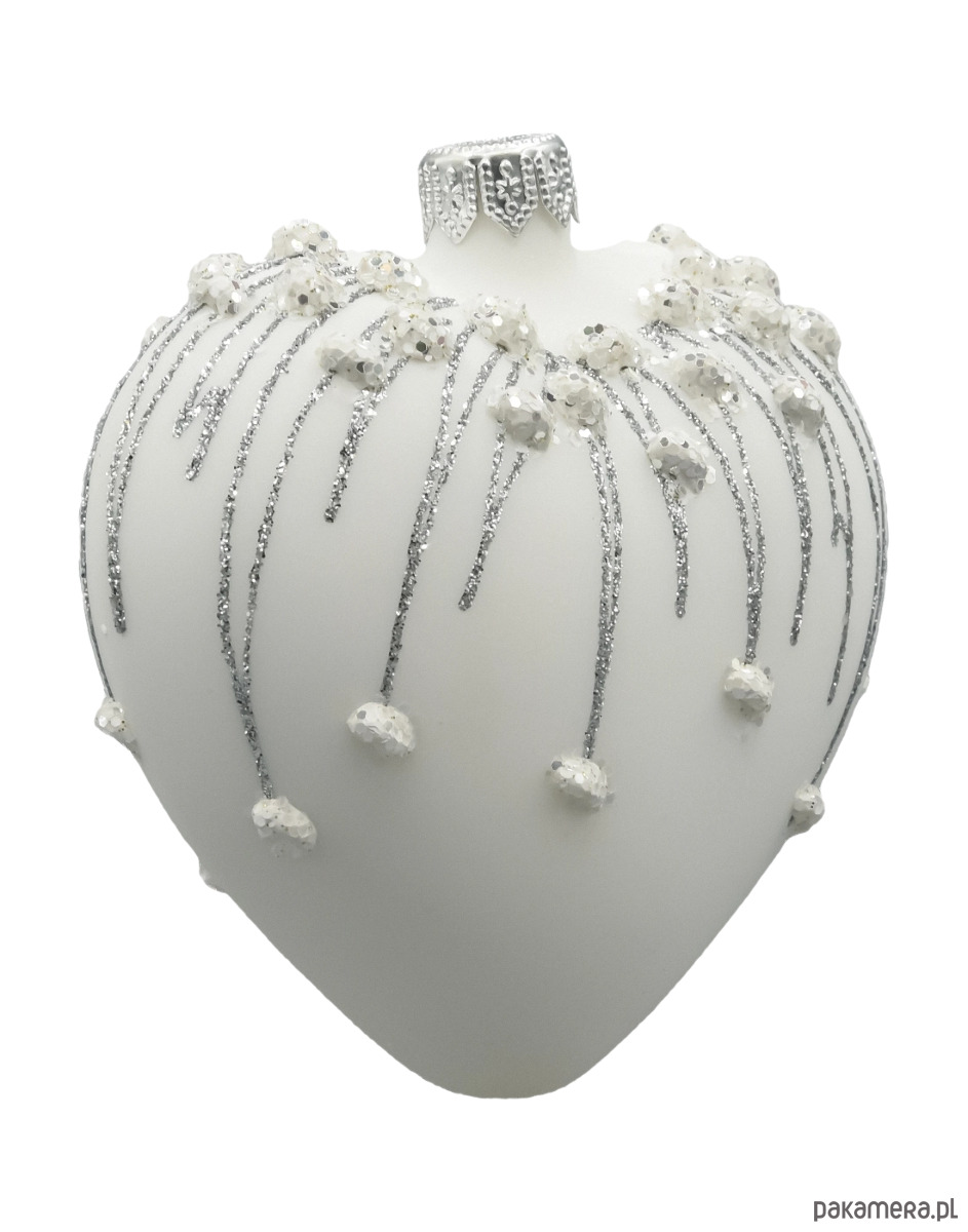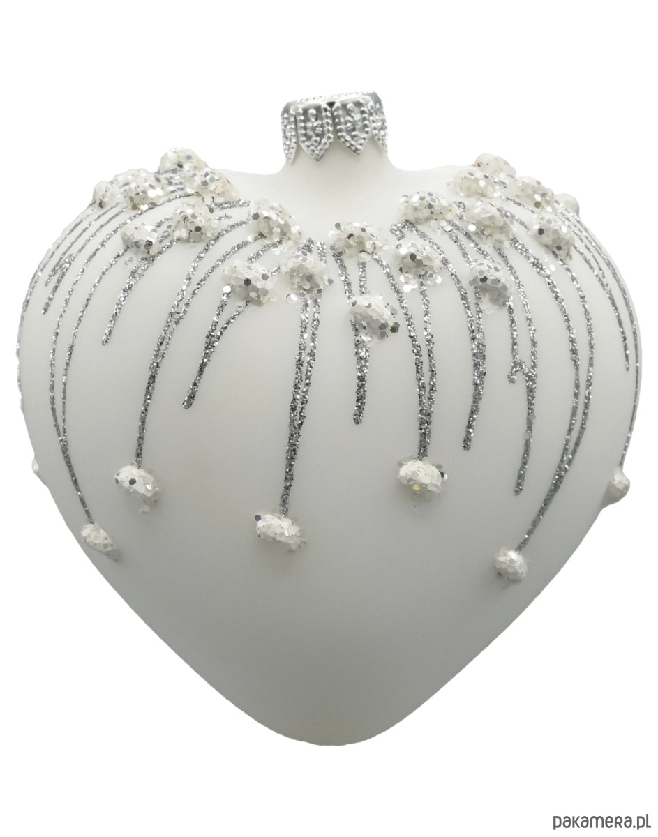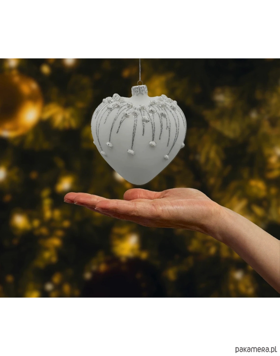 Wyjątkowa szklana bombka w kształcie serca zachwyca subtelnością i klasą. Matowe, śnieżnobiałe szkło stanowi idealne tło dla srebrzystych brokatowych zdobień, które spływają niczym lodowe sople zakończone iskrzącymi się płatkami śniegu. Każdy detal został wykonany ręcznie, z niezwykłą precyzją, co czyni tę bombkę nie tylko ozdobą, ale i małym dziełem sztuki. Idealna do eleganckich aranżacji świątecznych, wniesie do wnętrza nutę zimowej magii i romantyzmu.