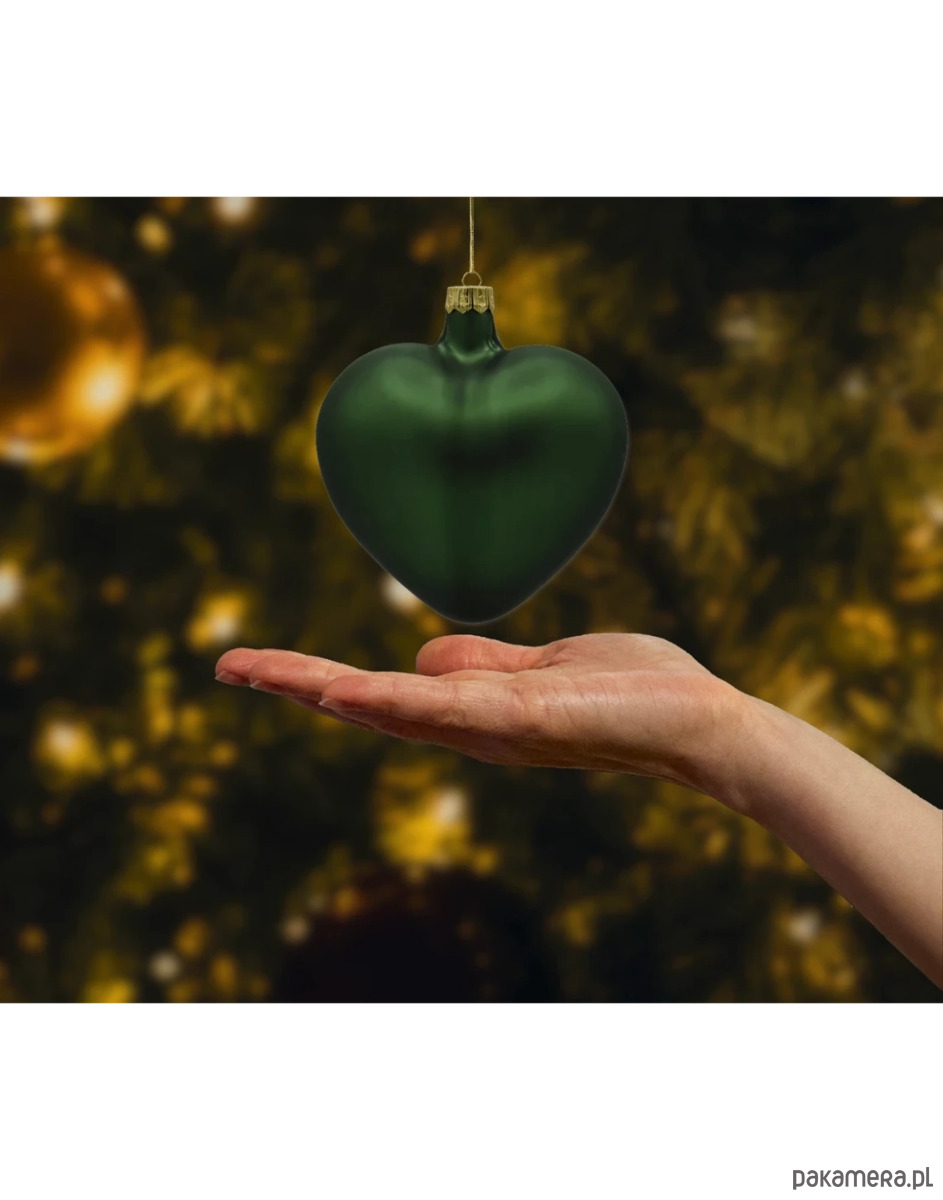 Szklana bombka w kształcie serca w głębokim, matowym butelkowym odcieniu zieleni to wyjątkowa propozycja dla miłośników eleganckiej i stonowanej stylistyki świątecznej. Jej klasyczna forma i szlachetna, leśna zieleń wprowadzają do wnętrza atmosferę spokoju, natury i ponadczasowego piękna. Matowa powierzchnia bombki subtelnie rozprasza światło, nadając całości szlachetnego charakteru.