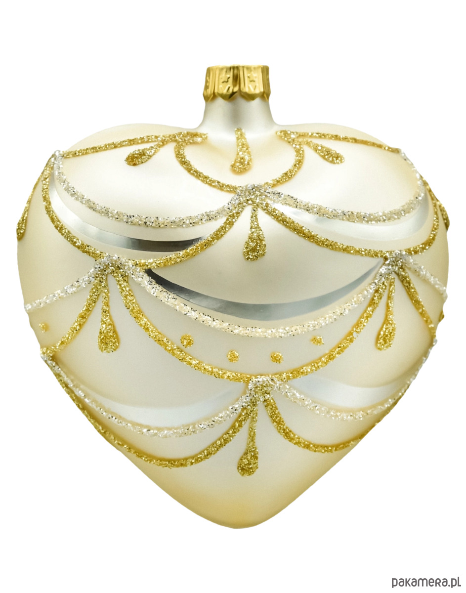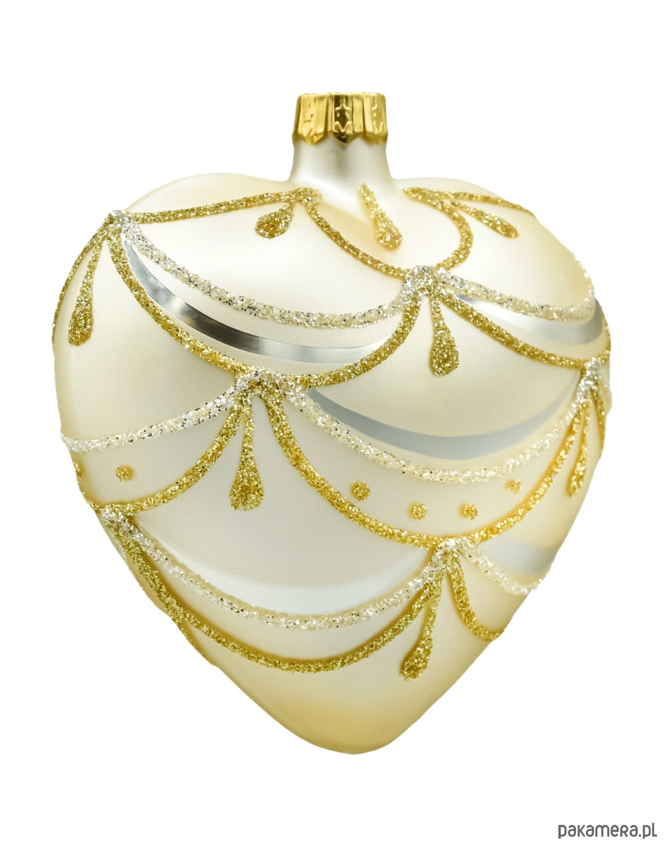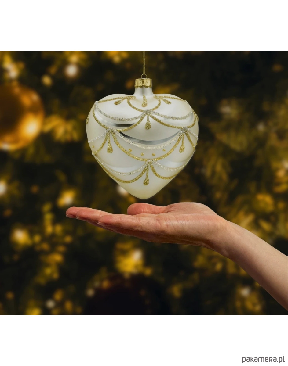 Ręcznie dmuchane i ręcznie malowane serce z delikatnym, satynowym wykończeniem w kolorze kości słoniowej zdobi misterny rysunek girland wykonanych złotym i srebrnym brokatem. Płynne łuki, drobne kropki oraz lustrzane wstawki pięknie odbijają światło lampek – bombka mieni się z każdego kąta i nadaje choince szyk w stylu glamour. To ponadczasowa szklana bombka choinkowa o biżuteryjnym charakterze, idealna zarówno do klasycznych aranżacji w złocie i bieli, jak i do nowoczesnych, minimalistycznych wystrojów.