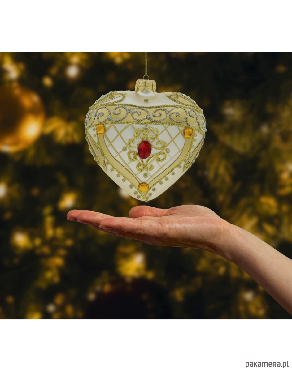 Ta perłowa bombka serce to wyjątkowy wybór dla osób poszukujących eleganckiej, luksusowej dekoracji, która doda świątecznej choince subtelnego blasku i ponadczasowego stylu. Ręczne zdobienie, inspirowane motywami barokowymi, oraz najwyższa jakość wykonania gwarantują, że bombka zachwyci każdego i będzie cieszyć oko przez wiele sezonów. To idealna ozdoba dla miłośników klasycznych, wyrafinowanych dodatków, które podkreślą wyjątkowy klimat Bożego Narodzenia.