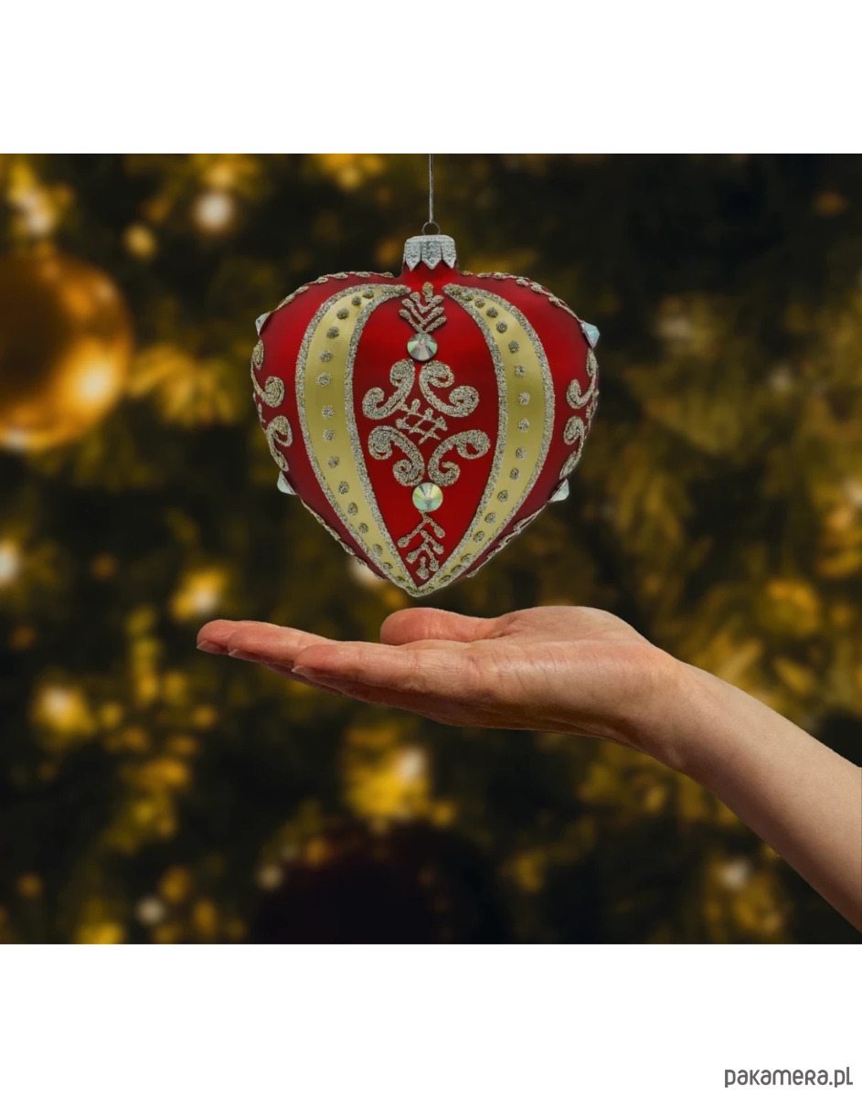 Bombka serce w kolorze czerwonym ze złotymi zdobieniami i kryształami to idealny wybór dla osób, które cenią eleganckie, klasyczne dekoracje świąteczne o najwyższej jakości. Dzięki ręcznemu zdobieniu i precyzyjnym detalom, bombka wnosi do wnętrza wyjątkowy blask i świąteczną atmosferę. Jest to ponadczasowa ozdoba, która doskonale sprawdzi się przez wiele sezonów, wprowadzając na choinkę niepowtarzalny urok i styl.