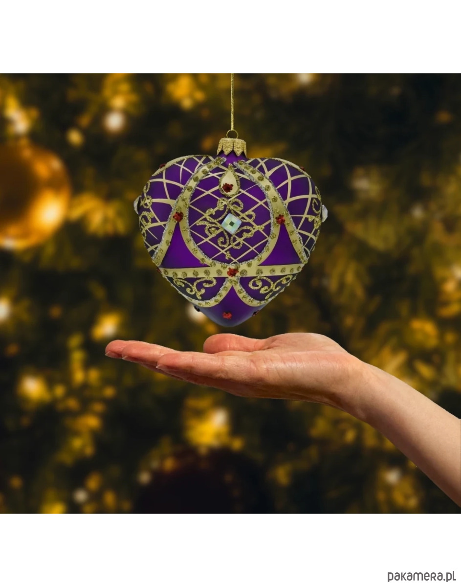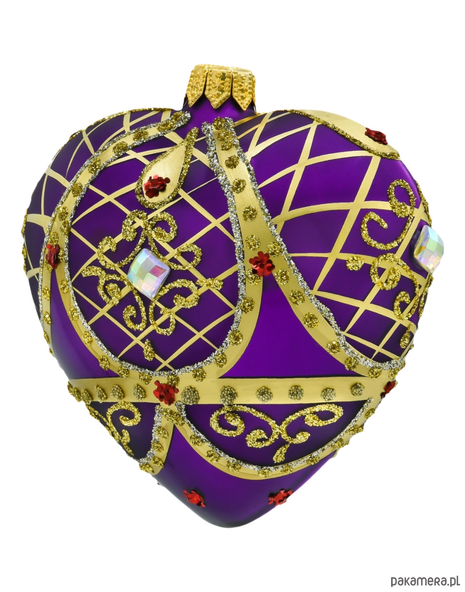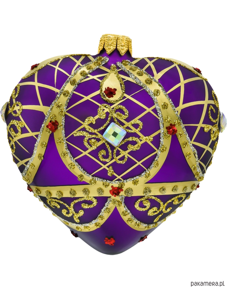 Bombka choinkowa: Serce ze złotymi zdobieniami i kryształkami: purpurowe