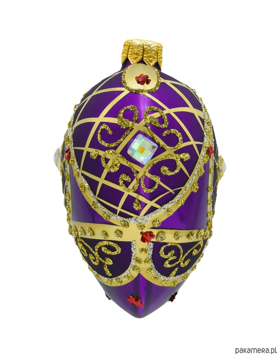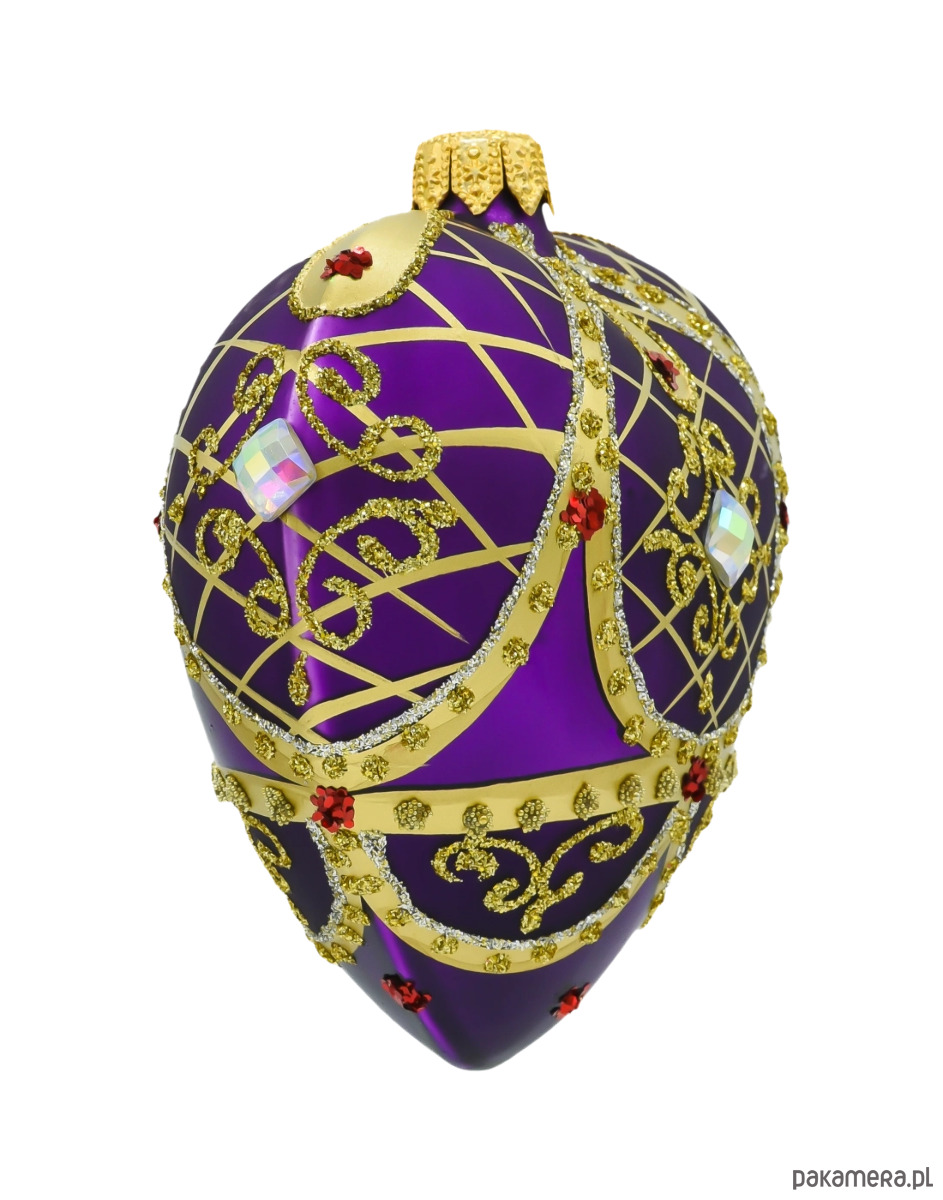 Fioletowy kolor bombki symbolizuje luksus i bogactwo, a złote zdobienia nadają jej elegancki, królewski styl. Siatka złotych linii przeplatana misternymi ornamentami oraz centralnie umieszczony kryształ sprawiają, że bombka wygląda jak prawdziwy klejnot na choince. To idealna dekoracja dla osób, które pragną, aby ich choinka wyróżniała się w wyjątkowy sposób.