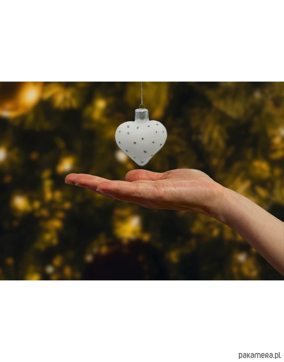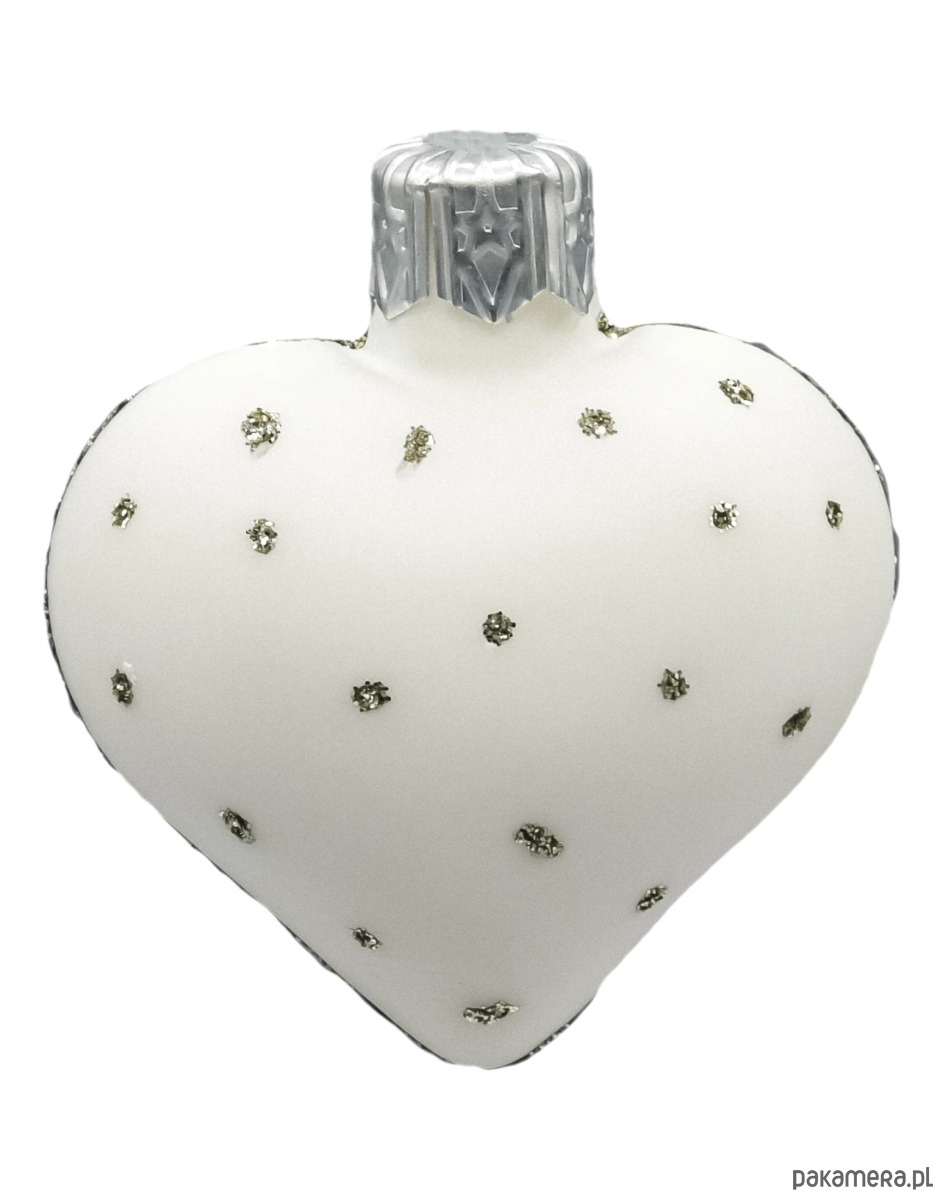 Szklana bombka choinkowa serce w białym kolorze z brokatowymi kropkami – elegancka ozdoba bożonarodzeniowa
